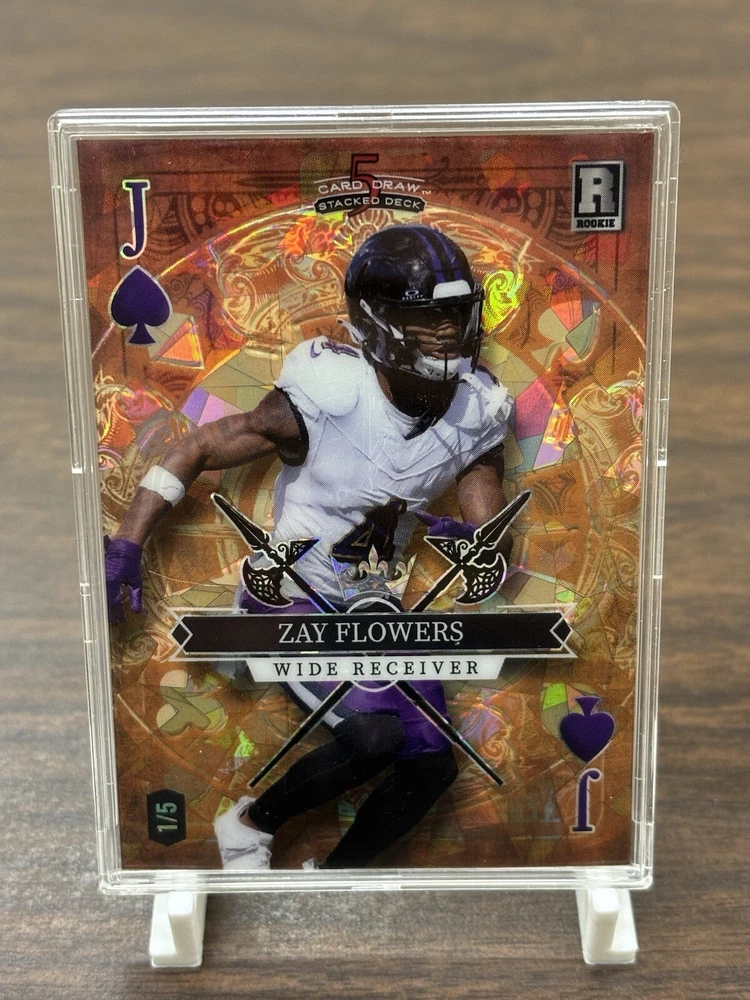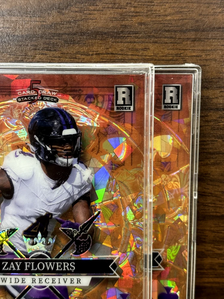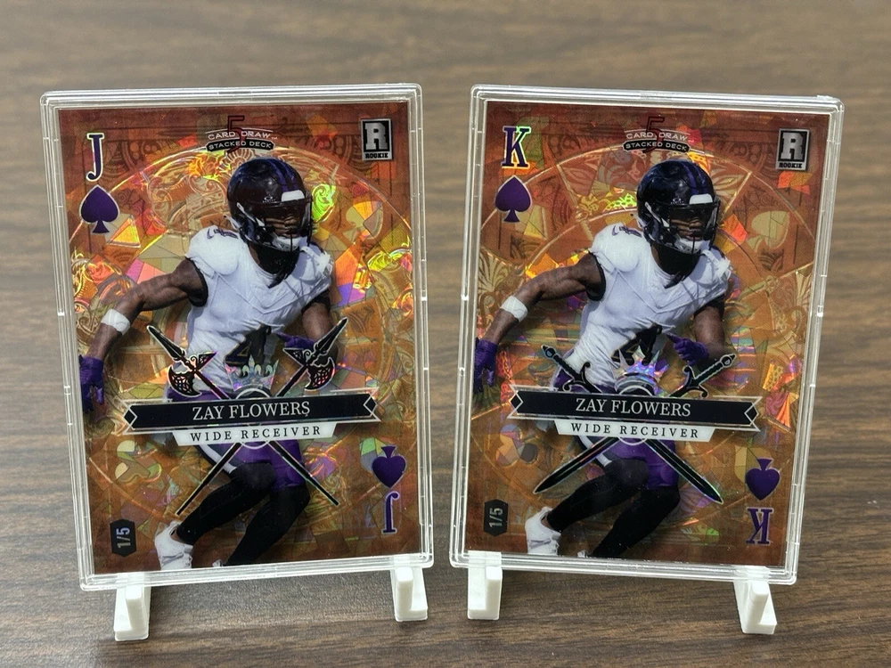 TWO Zay FLOWERS 2023 Wild Card 5 Draw Stacked Deck 1/5 RC Orange Baltimore RAVENS cards. Condition is Ungraded. Since less that 20$ I am going to send over in an envelope. Both cards will be TOP loaded. Super dope cards good for any ravens fan or NFL fan.