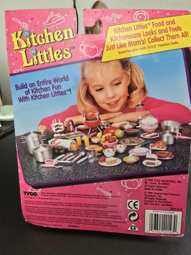 Item is new in package; package shows sign of its vintage age. Introducing the TYCO Kitchen Littles Lunch Fun Set, featuring a colorful and realistic collection of pretend toy food. This set includes over 10 items, suitable for any room in the dollhouse kitchen. The 1:6 scale vinyl, plastic, and paper materials are perfect for creating a fun and imaginative dining experience for your dolls. The set includes a variety of items, such as lunch meats, cheeses, and desserts, all with vibrant colors and intricate details. This original and licensed reproduction from 1995 is a must-have for any collector or fan of dollhouse miniatures. Add some flavor to your dollhouse with the TYCO Kitchen Littles Lunch Fun Set!