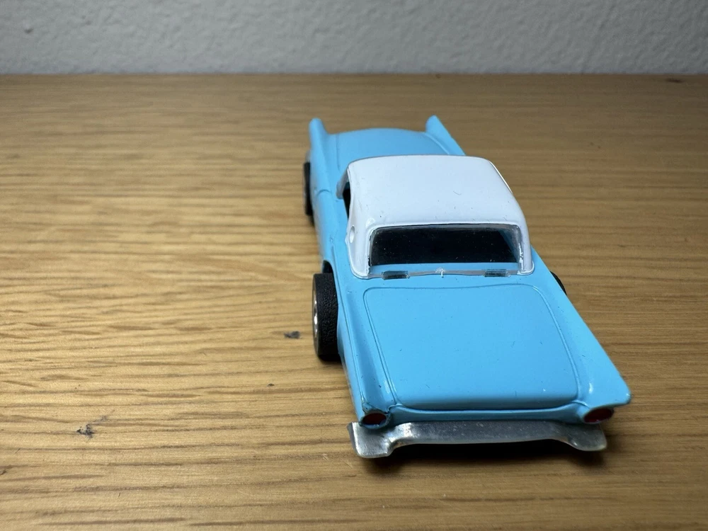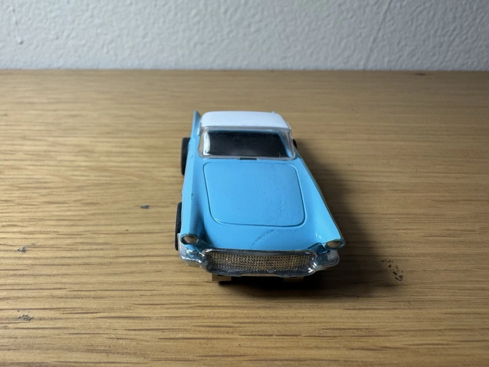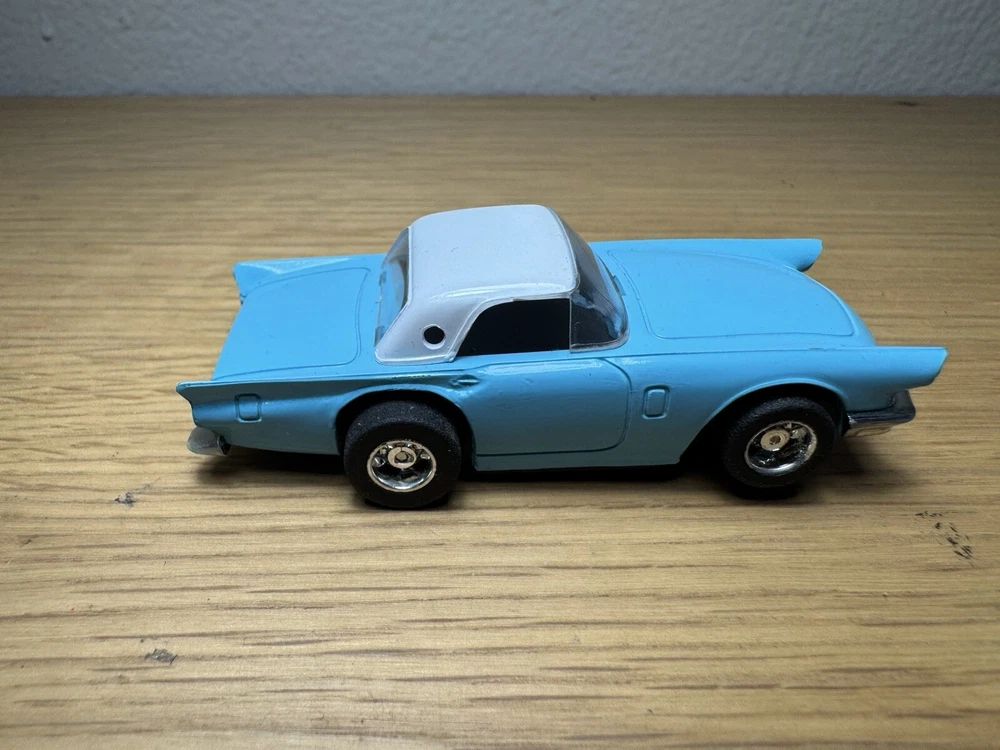 The product is a TYCO HO scale slot car featuring a '57 Ford Thunderbird in blue and white. It is an original piece from the 1970s or later.