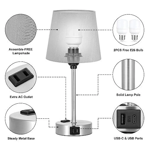 Menu 1. We require immediate payment. 2. We currently accept payment via eBay managed payments only. 3. Once payment is cleared, we will dispatch your shipment within 1-3 business days. Please refer to the "Shipping" tab for more information regarding shipping speed to your destination. Table Lamps for Bedrooms Set of 2 Bedside - Nightstand Bedroom Lamp with USB C Port and AC Outlet Charging, Dimmable Touch Small End Side Lamp, Grey Night Stand Light for Kid/Guest Room/Living Room Product description Modern Grey Lamp for Room Decor - The bedroom nightstand lamp is equipped with tactile features, 3 sets of brightness, 3 powers to charge, very handy for multiple use. And the small bedside lamp is modern and simple, the classic fabric grey lamp shade emitted a warm and comfortable glow, providing you with a relaxed and comfortable atmosp. Perfect gift for Father's Day, birthday gift, home warming gift for friends, families, co-workers. 3 In 1 USB-C & USB Ports & AC Outlet - The side table lamp for bedroom builts USB A+C port (5V/2.1A) and AC outlet(5V/2.1A) for charging in the nickel silver base. The bedrooms lamp set of 2 allows you to charge 6 devices at the same time, such as Phones, Ipad, Airpod, Echo, etc. You can easily charge your phone while enjoying the warm and cozy ambiance of the nightstand lamp. The charging station will operate whether the usb lamp is on or off. Enjoy the Touch Control Bedside Lamp - With the touch feature, the dimmable touch lamp for nightstand is easily operated, quickly turn on/ off the lamp or change the brightness by tapping the silver lamp base, especially friendly for the elderly, children, nursery, say goodbye to the complicated switches or buttons. Upgraded 3-Way Dimmable Nightstand Lamp - The night stand lamp has three levels of brightness (Low/Middle/High), it can meet your various needs perfectly. The lowest brightness is great for a night-light, ideal for relaxing, yoga, meditation,etc. And the highest brightness gives off a fair amount of light for work/study. In addition, you will receive 2PCS $20 E26 LED bulb for free, which helps save your time and money on buying an extra light bulb for the small night lamp. ?? WORRY-FREE Shopping - Reliable quality and after-sales support to make sure you have a great shopping experience. bed side lamp components are UL certified, safe and practical. If you have any questions about using the end table lamp, please contact the seller, your message will be answered within 24 hours and will help solve your problem smoothly. PLEASE MESSAGE US IF YOU HAVE ANY OTHER QUESTIONS, AND MANY THANKS FOR READING ALL OF THIS. Copyright ©#. All Rights Reserved.