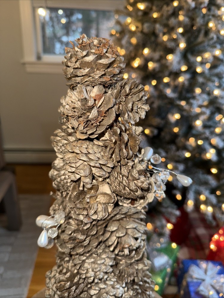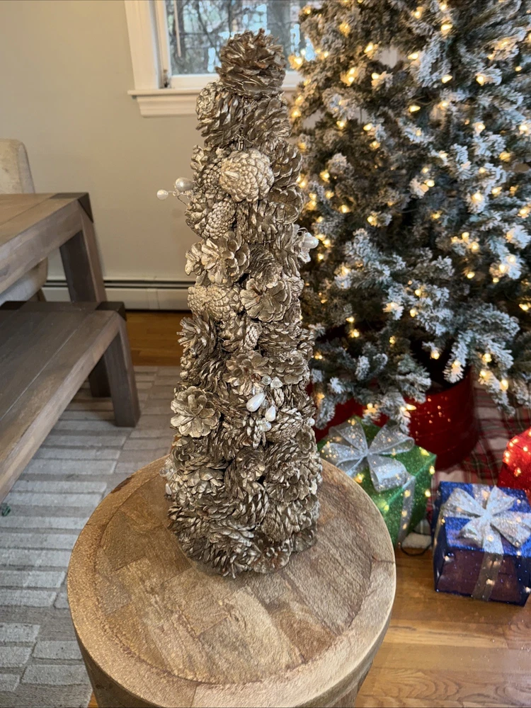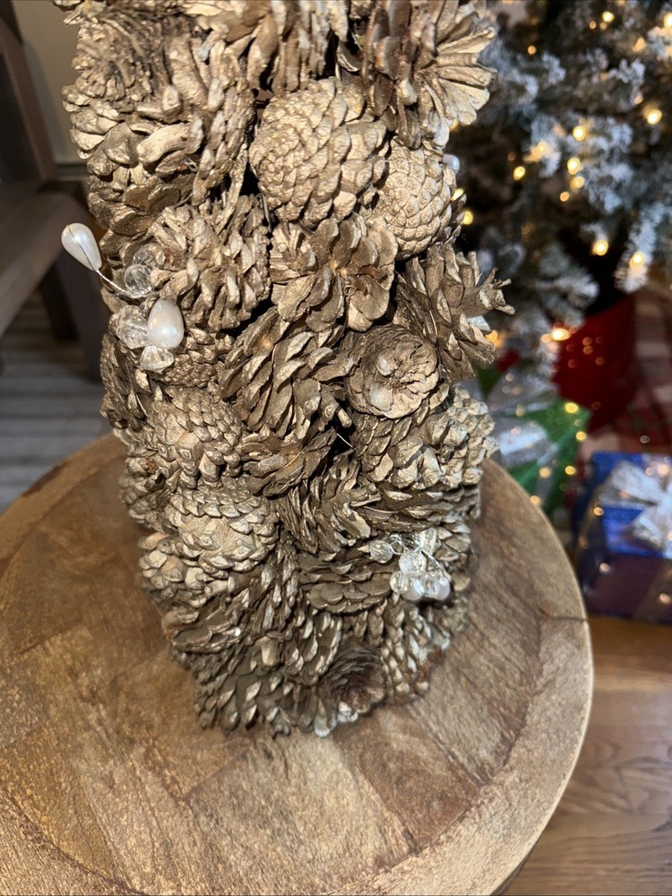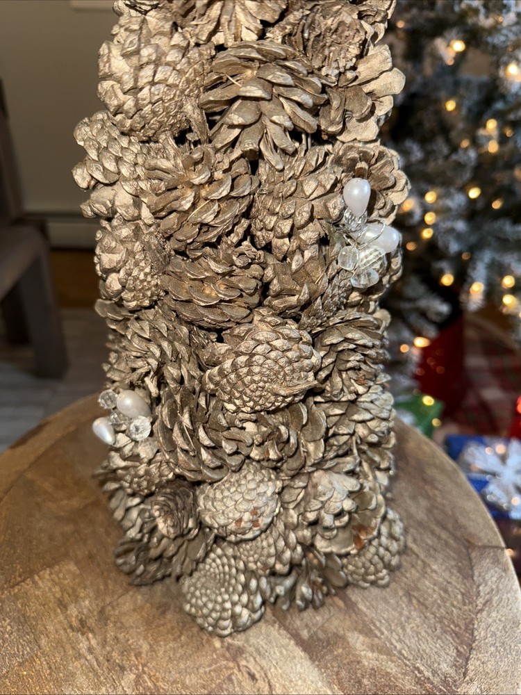 The Table Top Natural Gold PINE CONE TREE is a stylish and contemporary piece of holiday decor perfect for teens and adults alike. This free-standing pine cone tree features a flocked glitter snow finish, adding a touch of winter magic to your home. With a brown color scheme and made of wine, glitter, and pine cones, this unique piece captures the essence of the holidays and the festive spirit of Christmas. Standing at 11.75 inches tall and 5.5 inches in length, this elegant pine cone tree is sure to be a standout decoration in your holiday celebrations.