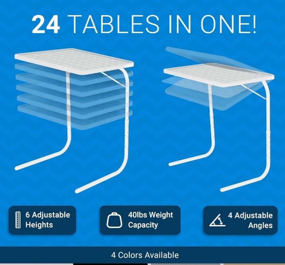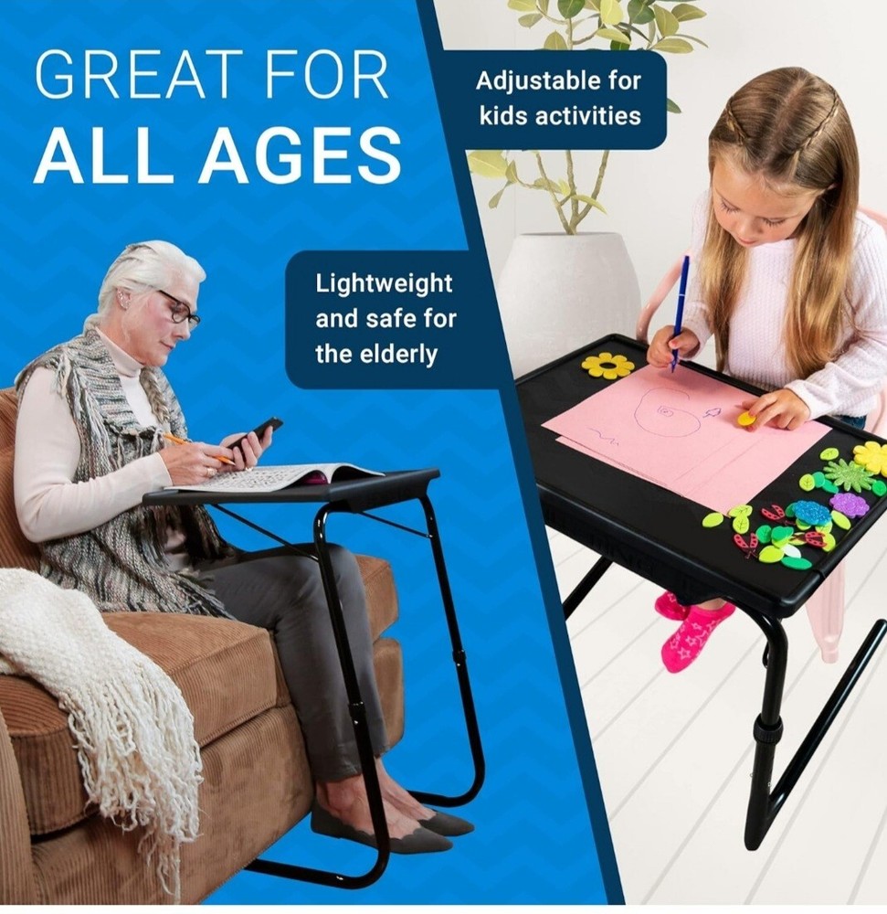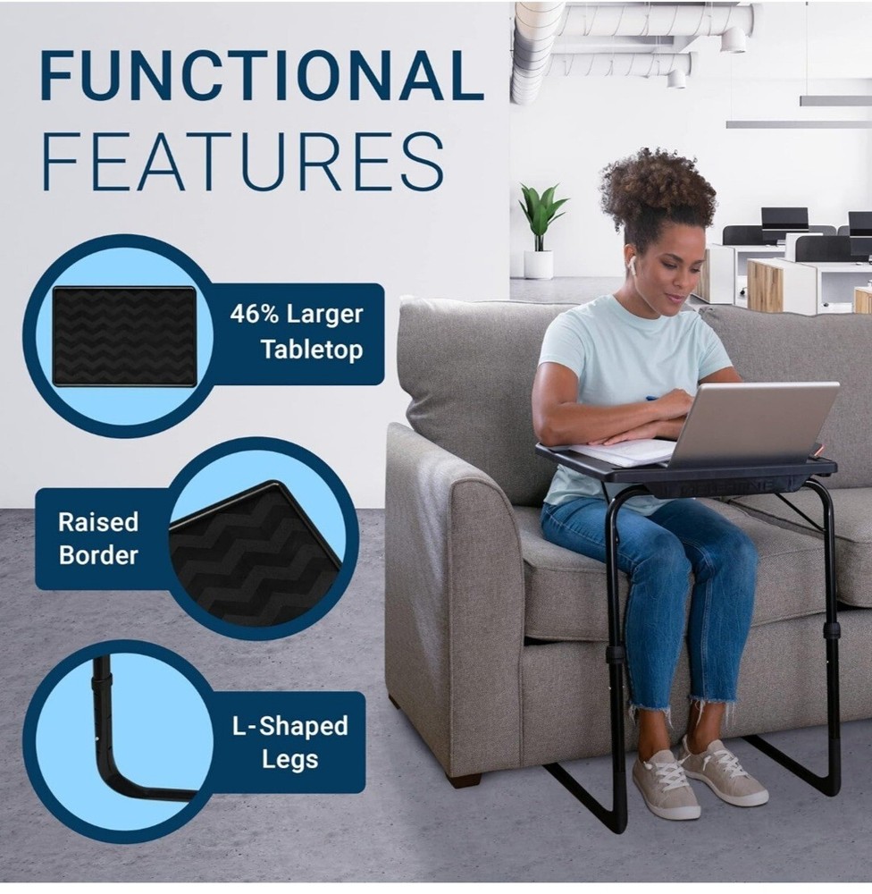 Introducing the Table-Mate XL TV Folding Stowaway Adjustable Tray /Table in Black. This modern rectangular tray table is perfect for indoor use and comes with a foldable feature for easy storage. The tabletop material is made of plastic and steel, while the handle is made of durable plastic. STURDY: These folding tray tables features a food-rated polypropylene top for meals or snacks, a drink holder that adjusts to any angle to prevent spills, and offers plenty of extra space for other items. EASY TO ASSEMBLE: No tools needed to put this foldable tv dinner tray together. Just slide the steel legs together, insert the rods, and add the tray. To store, simply fold and pack away. ADJUSTABLE: With 6 different heights and 3 convenient angles, these TV trays for eating bring 18 accommodating options to the table when you are sitting down to snack, read, puzzle or work. MULTIPURPOSE: Set the tv table tray to fit your needs. It can hold up to 40lbs and can be used as a TV dinner table, laptop desk, bedside tray, small folding table, couch table, and more. THOUGHTFUL DESIGN: Pull these spacious food trays for eating on couch towards you and watch as the L-shaped legs seamlessly slide around the living room sofa or bed. No crossbar to get in the way!