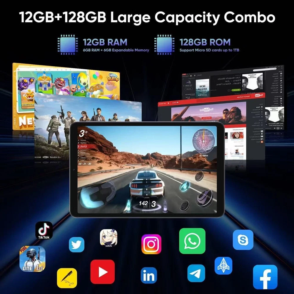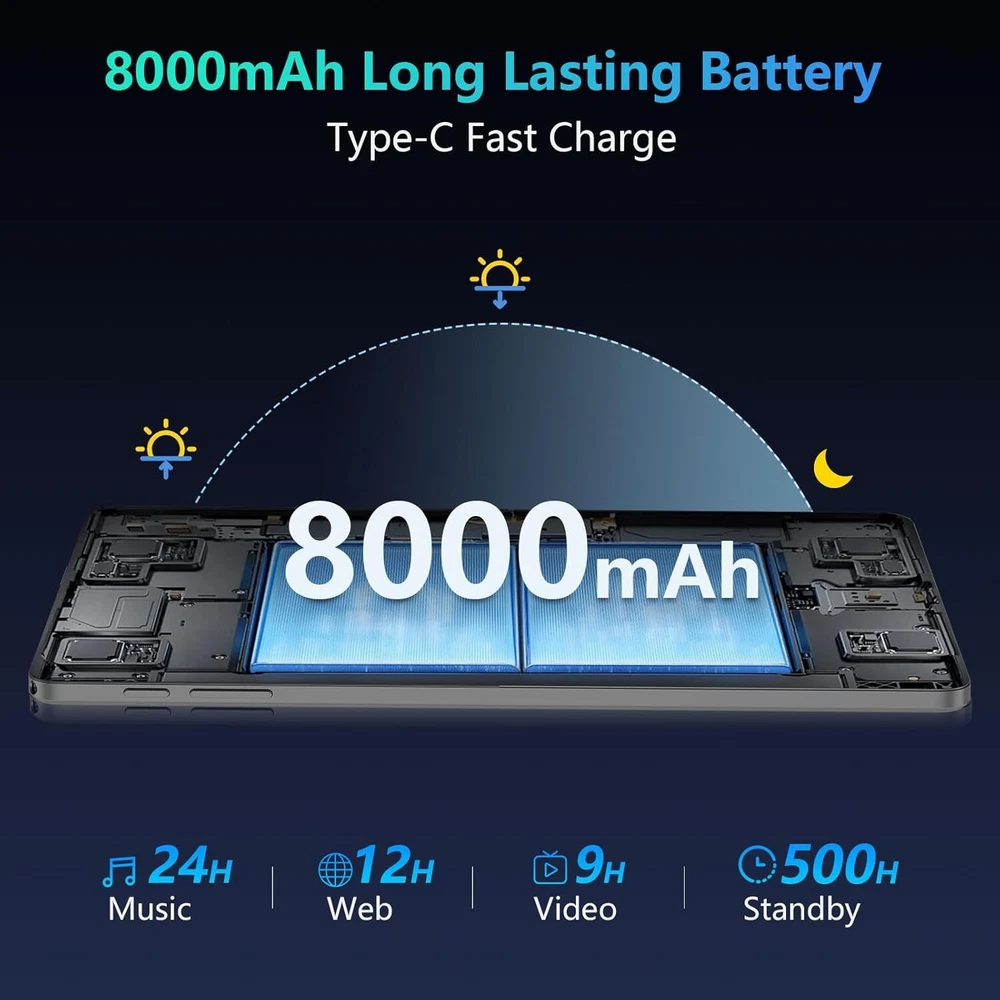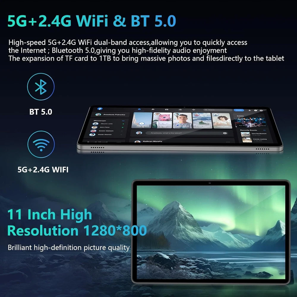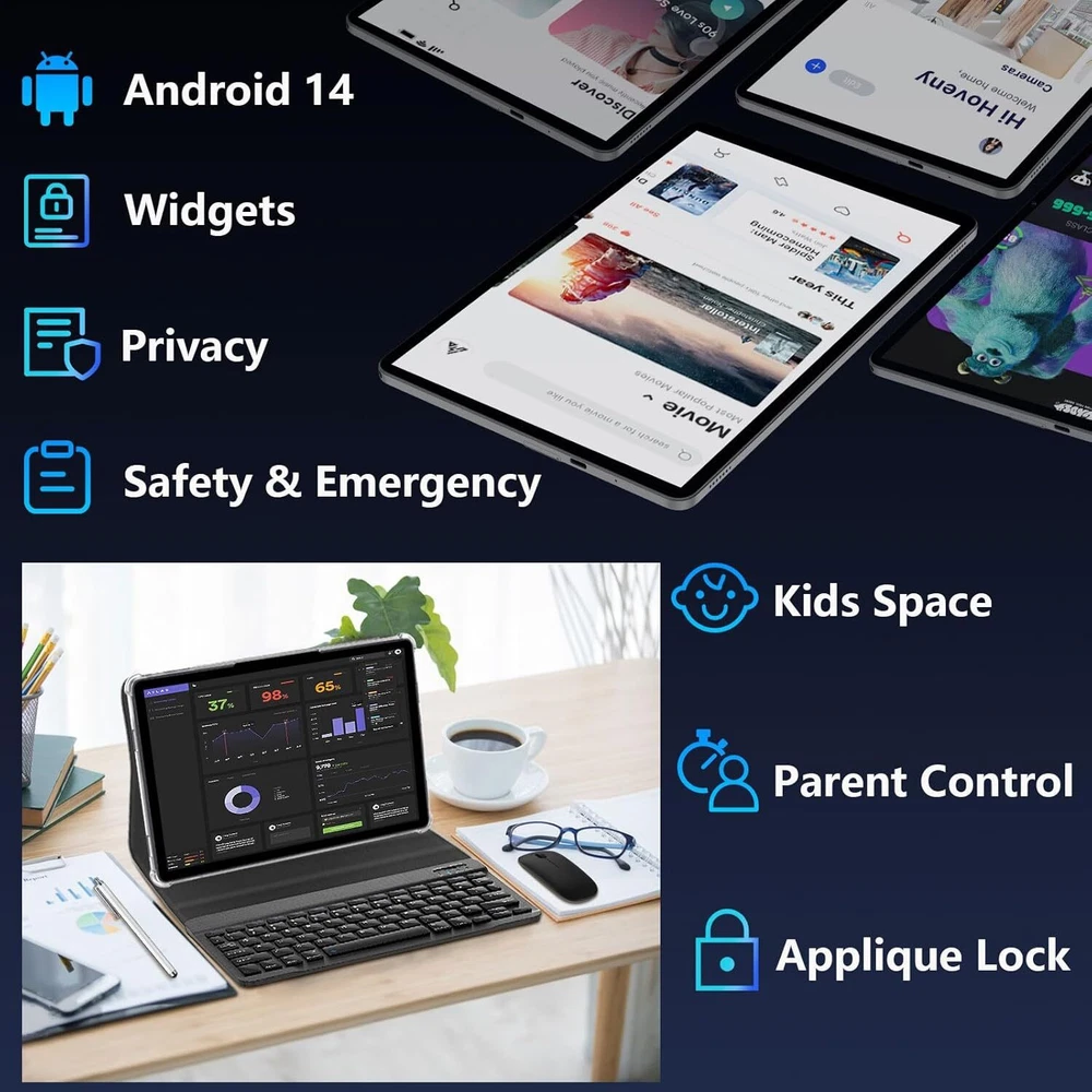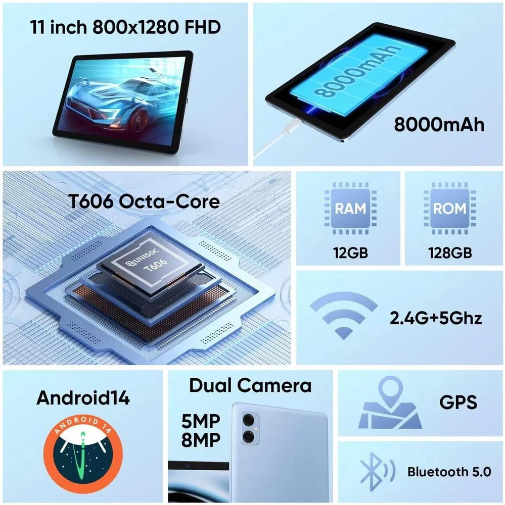 Tablet 11 inch Android 14 Tablet, 12GB RAM+128GB ROM, Octa-Core Tablets Black Product Details Standing screen display size: 11 Inches Screen Resolution: 1280 x 800 pixels Max Screen Resolution: 1280x800 Pixels Processor: 1.6 GHz Graphics Coprocessor: Manhattan ES3.0 14fps Chipset Brand: ARM Card Description: Integrated Wireless Type: 802.11ac Average Battery Life (in hours): 8 Hours Brand: COLORROOM Model Name: C5 Memory Storage Capacity: 128 GB Screen Size: 11 Inches Display Resolution Maximum: 1280x800 Pixels High Performance - COLORROOM Tablet is powered by the latest Android 14 with Unisoc T606 high performance octa-core processor and 12GB RAM (6GB RAM + 6GB extend) . Whether it's video, music, work, eBooks or multitasking, this tablet has you covered. Versatile Workspace - The C5 tablet comes fully equipped with a wireless keyboard, mouse, and stylus, allowing you to seamlessly switch from entertainment to productivity. Its custom-fit protective case not only shields your tablet but also functions as a sturdy stand for comfortable viewing and typing. All-Day Power - The tablet comes with a massive 8000mAh battery and 18W of fast charging support. Whether you're watching movies, listening to music, or browsing the web, enjoy uninterrupted use. Dual-band 2.4GHz/5GHz Wi-Fi and Bluetooth 5.0 ensure fast, reliable connections wherever you go. FHD Large Screen - Dive into a vivid world with the tablet’s 11-inch Full HD (800x1280) display, featuring IPS Incell technology for stunning color accuracy and wide viewing angles. Effortlessly project content to a bigger screen with wireless projection for an enhanced viewing experience. Huge Storage - Store all your favorite apps, games, and files with 128GB of internal memory, expandable up to 1TB via microSD. Certified with Android 14 and Google Mobile Services (GMS), access the Google Play Store and enjoy all your favorite apps, games, and media effortlessly.