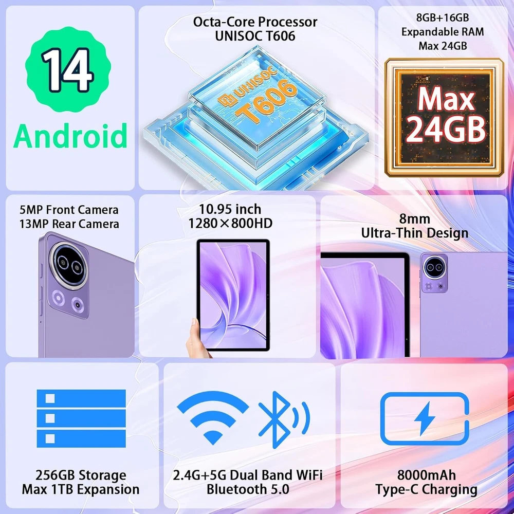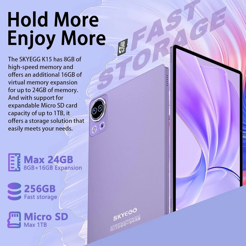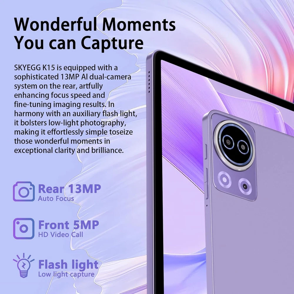 Tablet 11 inch Android 14 Tablets, 24GB+256GB+1TB Expand, Widevine L1 Purple Product Details Standing screen display size: 10.95 Inches Screen Resolution: 1280 x 800 pixels Max Screen Resolution: 1280*800 Pixels Processor: 2 GHz Chipset Brand: MediaTek Card Description: Dedicated Wireless Type: 802.11ax Brand: SKYEGG Model Name: K15 Memory Storage Capacity: 256 GB Screen Size: 10.95 Inches Display Resolution Maximum: 1280*800 Pixels LATEST ANDROID 14 TABLET + GMS CERTIFIED: The SKYEGG K15 tablet comes with the latest Android 14 operating system, offering more personalisation options and new features. Also it is GMS certified, so you can access lots of apps and services 24GB RAM+256GB ROM+1TB EXPAND: The K15 Tablet has 24GB RAM and 256GB ROM, supports 1TB of expanded storage (Micro SD/TF card not included). The memory lets you store more books, music, pictures, videos and games. No more worrying about running out of memory 11" IPS INCELL SCREEN: The K15 Android Tablet features an 11-inch IPS display with a resolution of 1280x800, which delivers more lifelike images, finer details, and more responsive touches, giving you immersive images and support for split-screen functionality SUPPORT WIDEVINE L1: The K15 tablet supports Widevine L1, which efficiently decodes FHD and Ultra FHD video so you can enjoy high-quality video playback on more than 30 of the major video apps around the world, including Netflix, Prime Video and YouTube, etc 8000MAH ULTRA-LONG LIFE: SKYEGG 11 inch tablet built-in a high capacity 8000mAh battery, which is larger than other tablets and will last you all day. Equipped with USB Type-C port + independent 3.5mm headphone jack to meet various needs DUAL CAMERAS + RICH FEATURES: K15 Tablet comes with a 5MP front camera and a 13MP rear camera for optimised image processing. Face recognition, wireless projection, child protection, screen recording and other rich features make your tablet more convenient