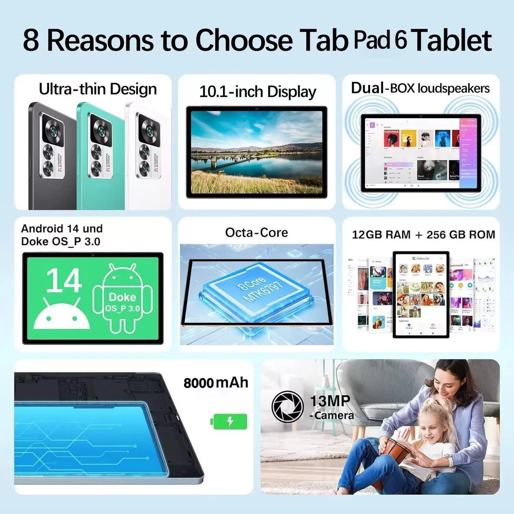 2024 Pad6 pro Tablet Android 14, 10.1 inch Gaming Tablet PC , 12GB RAM+256GB ROM 8000mAh battery, Octa-Core 1920 * 1200 FHD+ screen, 13MP+8MP, 5G WiFi Pad6 Pro Model year: New Gaming Tablet Color: Black,Silver Pab 6 Pro: 12GB(8GB+4GB)+256GB CPU: MTK6797, Octa-Core Screen: 10.1 inch 1920*1200 pixel HD IPS Memory: 12GB(8GB+4GB) RAM 256GB ROM Front camera: 8MP Rear camera: 13MP Battery: 8000mAh๏ผSlim 9.9mm & slim 519g OS: Android 14 WiFi: 2.4 GHz/5 GHz Features: FM, Google Play, OTG Features ๐ ใ12GB RAM + 256GB ROM & Android 14ใ The Pad6 tablet has 12GB RAM and 256GB ROM, whether you play games or open apps, the S30 tablet can help you smooth operating experience. And also this tablet has enough space for your games, videos, apps and music. Android 13 offers a personalized, secure and effortless experience on your device. With a completely redesigned user interface. ๐ ใ10.1 inch FHD+ display ใ This Pad6 tablet is equipped with the 10.1-inch FHD+ IPS screen that supports up to 1920 x 1200 resolution, allowing you to enjoy the HD resolution screen with detailed and rich colors while providing a comfortable viewing experience. ๐ ใGiant 8000mAh batteryใ This Pad6 tablet has a long-lasting 8000mAh battery that will accompany you from morning till late at night, whether you are working, studying or entertaining, it provides you with unparalleled battery life to meet your needs. ๐ ใ13MP rear & 8MP front camera ใ Whether it's video calls with family, online classes or online meetings, the 8MP front camera meets your needs and enables clear online meetings or private video calls anytime, anywhere. The 13 megapixel rear camera is ready for clear shots, capture your good time anytime, anywhere. ๐ ใ2.4G/5G WIFIใ With 5G WLAN, you can easily download or access information whether you are at home or on the go , Bluetooth 5.0, FM radio, dual speakers to meet the needs of daily use. ๐ ใOcta Core Processorใ This Pad 6 tablet has an Octa Core processor that supports fast downloads and uploads, stunning graphics and photos, and energy-saving performance to work more and faster, providing a smooth multitasking experience without stuttering. Package Contents: ๐ 1 * Tablet ๐ 1 * power adapter ๐ 1 * USB cable ๐ 1 * Manual