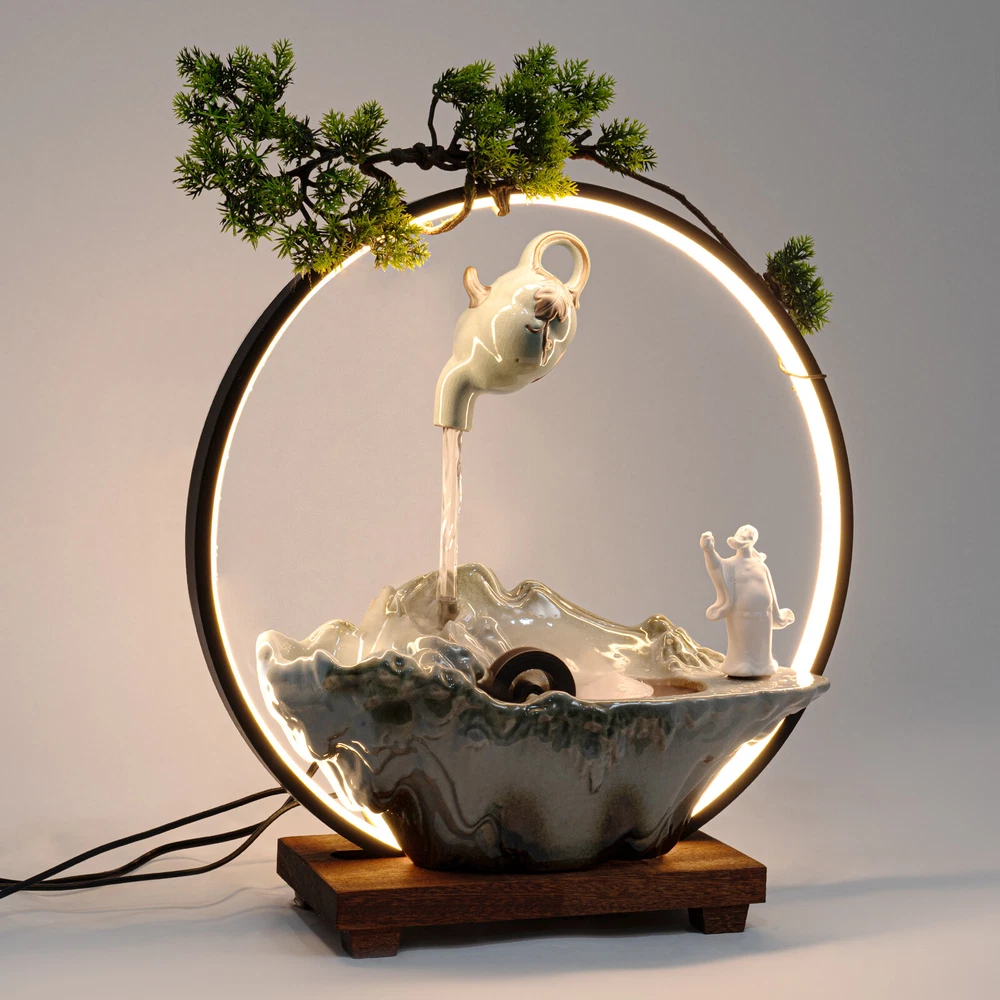 Specifications Color: Black, Wood Color Shape: Round Style: Antique Mount Type: Tabletop Control Type: Manual Assembly Required: Yes Indoor/Outdoor Usage: Indoor Surface Treatment: Glaze Material: Ceramic, Solid Wood, PC, Plastic, Aluminium Ironwork Atomizer Light Color: Red, Orange, Yellow, Green, Blue, Purple Power: 3 W (Pump), 24 W (Atomizer), 13 W ( Lamp Ring ) Light Color: Warm Voltage: 110V Efficiency: E Light Source: LED(Included) Power Source: Corded Electric Plug Type: US Standard Power Cord Length: About 1.2m/3.93ft Illumination Area: 7-10m/22.96-32.8ft Atomized Area: 50cm/19.69in Gross Weight: 3.5kg/7.71lbs Product Size: 40*12*42cm/15.7*4.7*16.5 in Package Size: 42*42*22cm/16.5 *16.5 *8.66in Tabletop Water Fountain, Indoor Waterfall with LED Light Mist Desk Fountain Welcome to my store: Description As life moves at such a fast pace, we often feel tired and anxious and want a piece of peace and comfort. Our tabletop water fountain with an atomizer design and LED light ring can bring you a warm and romantic atmosphere, bringing a sense of peace and warmth to your life. It is a beautiful and generous desktop ornament that adds a little artistic touch to your life. Whether you are at work or leisure, open it, and you can let your mind get soothing and relaxation. Key Features Sturdy and Durable: The product is made of high-quality ceramic, solid wood, PC, plastic, and aluminum ironwork materials, using a glazing process, with uniform and stable color, ensuring safety and durability Relieve Stress : After a long day's work, you can recline in your chair and feel the sound of its crisp running water, surrounded by soft mist, and enjoy a quiet moment alone to let the stress of your day disappear. You can also use it when trying to meditate or practice yoga. Atomizer Design: It comes with an atomizer and the misting effect creates a hazy and romantic atmosphere, adding to the aesthetics of the product whilst also bringing the humidity of the air around you to a healthier level, giving you a comfortable living experience. Stunning LED Visuals: It adopts an energy-saving and environmentally friendly LED light source, with simulated landscape modeling, which not only presents you with a beautiful visual experience but also protects your eyes. Beautifully Decorated: Exquisite pottery, simulated cliff cypress and waterwheel, and lifelike carved bard make this product a well-deserved piece of art deco, like a wonderful landscape painting. Its elegant appearance and suitable size can add color to any tabletop, living room, or bedroom. Auspicious Symbol: In Chinese culture, the continuous flow of water symbolizes rolling wealth, and the bard who is singing to the wine signifies having fun in time and a pleasant life. Therefore, it is especially suitable for placing in homes and offices. You can also give this meaningful product as a gift to your friends, family, and colleagues on birthdays, Christmas, Thanksgiving, or other festivals. Easy to Clean: The product's smooth surface and simple construction make it easy to clean, all you need to do is gently wipe it down with a dry cloth or wet wipe. Protective Packaging: The foam provides comprehensive protection for products to ensure that it is fully delivered to you to the greatest extent possible. Details Solid Base: The large wood base increases the stress area, so it can maintain the stability of the product. Practical Switch: The one-touch switch makes it easy to switch the power on and off with one hand at any time. Uneven Rockery: It is convenient for you to make your arrangement on it, or plant your greenery. Application The illumination area is 22.96-32.8ft and the atomized area is 19.69in. It can be placed as a decorative item in the living room, corridor, entrance, study room, dining room, bookstore, study room, tea break room, office, bedroom, yoga room, meditation room, conference room, and so on. It is also suitable as a beautiful gift for your leaders, colleagues, friends, and relatives. How to Install 1. Insert the lamp ring into the groove of the solid wood base. 2. Place the reservoir smoothly on the solid wood base. 3. Connect the water hose to the outlet of the water dispenser. 4. Connect the other end of the water hose to the pump. 5. Pull the pump power plug out of the water dispenser. 6. Place the atomizer into the spout of the water dispenser. 7. Pull the atomizer power connection port out of the water dispenser. 8. Insert the hanging kettle support into the water dispenser outlet port. 9. Insert the hanging teapot into the acrylic water pipe. 10. Place the white bard ornament on the water runner. 11. Wrap the simulated cliff cypress around the LED light ring 12. Place the inverted incense(not included) on the lamp ring. Specifications Color: Black, Wood Color Shape: Round Style: Antique Mount Type: Tabletop Control Type: Manual Assembly Required: Yes Indoor/Outdoor Usage: Indoor Surface Treatment: Glaze Material: Ceramic, Solid Wood, PC, Plastic, Aluminium Ironwork Atomizer Light Color: Red, Orange, Yellow, Green, Blue, Purple Power: 3 W (Pump), 24 W (Atomizer), 13 W ( Lamp Ring ) Light Color: Warm Voltage: 110V Efficiency: E Light Source: LED(Included) Power Source: Corded Electric Plug Type: US Standard Power Cord Length: About 1.2m/3.93ft Illumination Area: 7-10m/22.96-32.8ft Atomized Area: 50cm/19.69in Gross Weight: 3.5kg/7.71lbs Product Size: 40*12*42cm/15.7*4.7*16.5 in Package Size: 42*42*22cm/16.5 *16.5 *8.66in Package Included 1* Tabletop Water Fountains Other Accessories Required for Installation Notes Please do not switch on the pump without water. When installed, the pump should be placed in water and the water level should exceed the pump. To avoid short-circuiting due to corrosion, please use clean water. Please note that this product does not include fresh greenery or inverted incense. Please do not operate the pump without water. If the amount of water discharged decreases, please promptly check whether th
