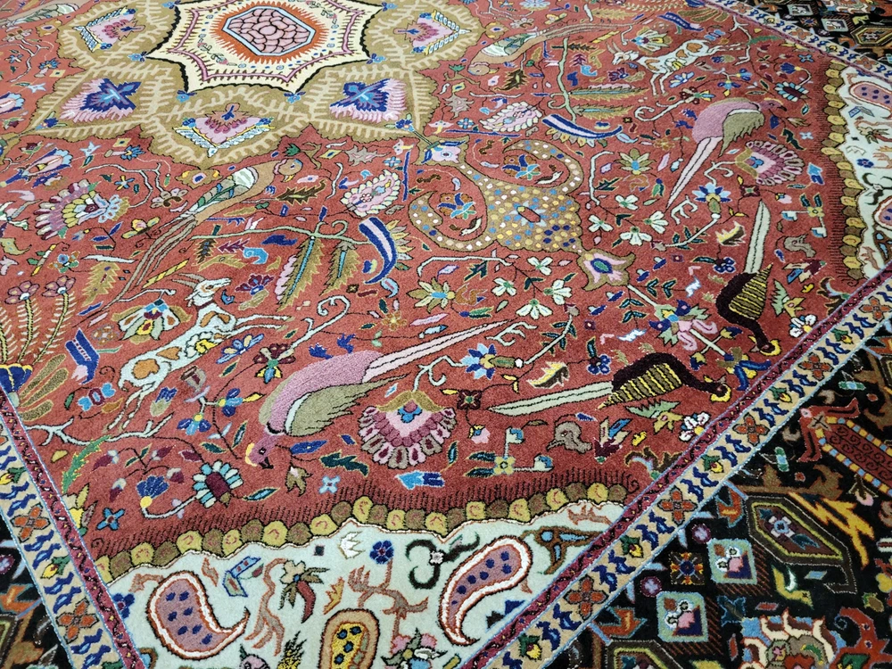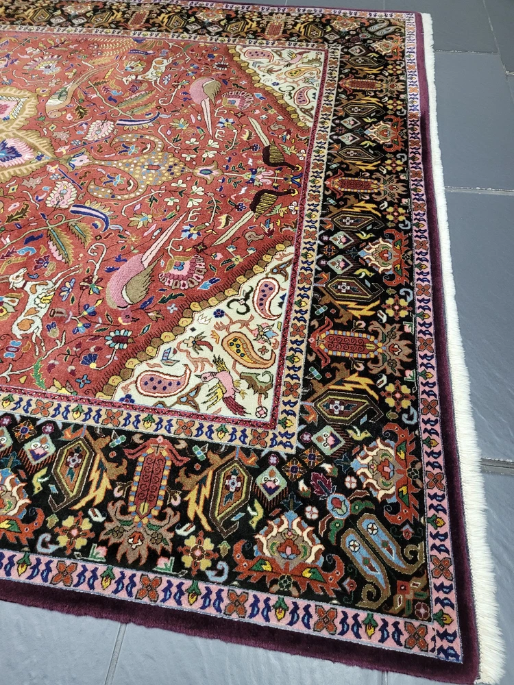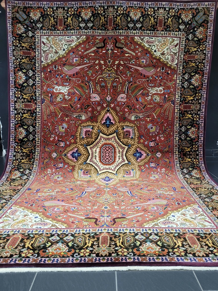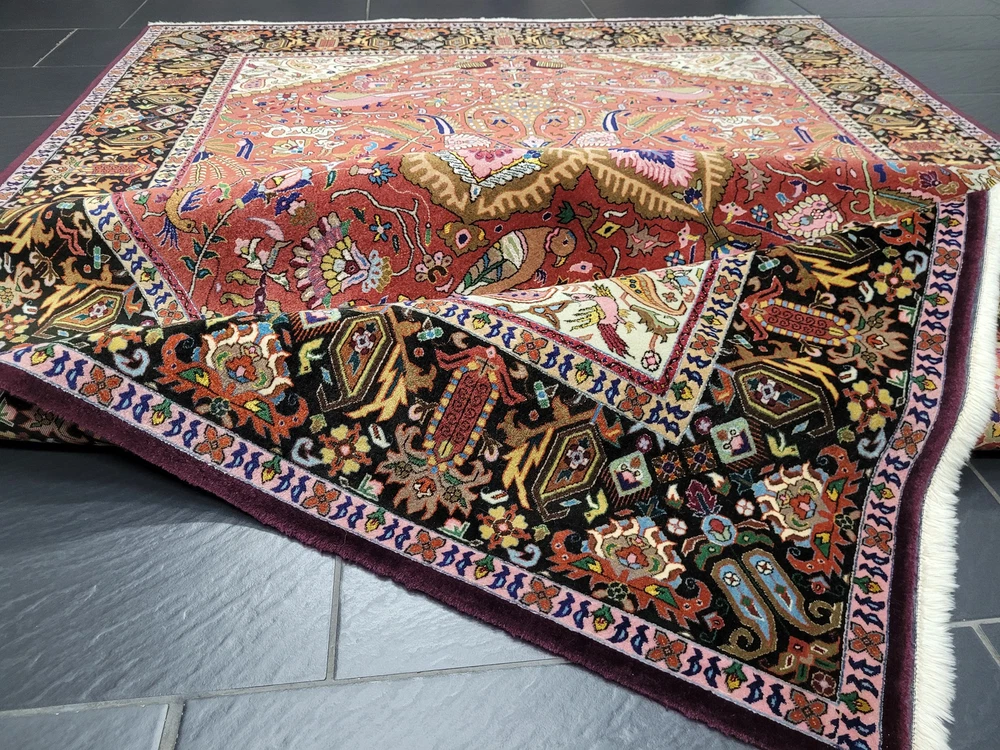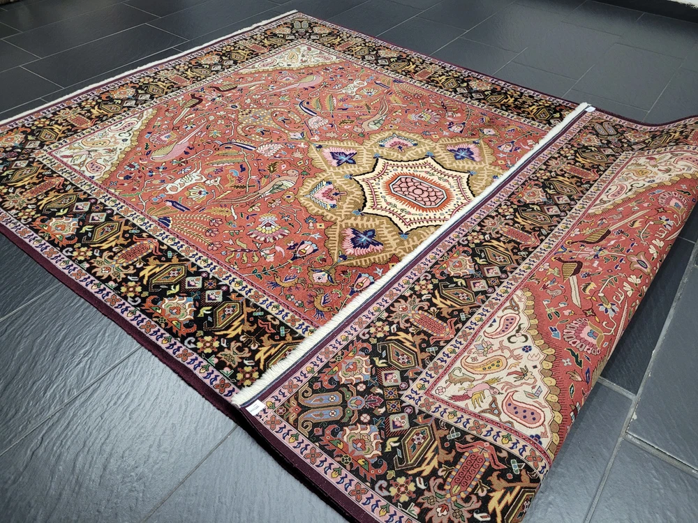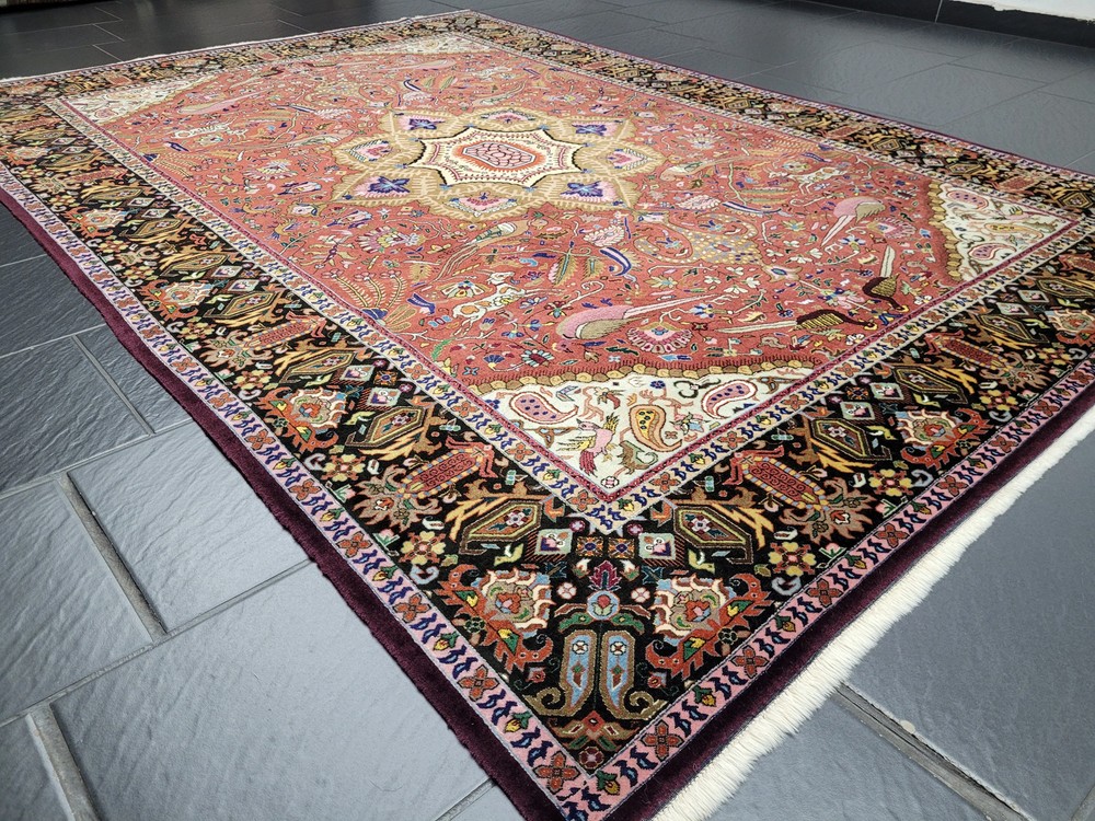 Herzlich willkommen, angeboten wird ein prachtvoller Täbriz Teppich, handgeknüpft aus feiner Korkwolle mit Seide. Das eindrucksvolle Zentralmedaillon in sternförmiger Komposition ist eingebettet in ein reich geschmücktes Feld mit Tier- und Vogelmotiven, floralen Ornamenten und kunstvollen Ranken. Die kontrastreiche Bordüre mit detailreichen Mustern in dunklen Tönen rahmt das Gesamtbild harmonisch ein. Artikelnummer: GJH25/186 Maße: ca. 260 × 175 cm Gewicht: ca. 13 kg Details: Material: Korkwolle mit Seide, handgeknüpft Knüpfung: fein gearbeitet, detailreich ausgeführt Farben: Rot, Gold, Beige, Schwarz, Grün, Blau und zarte Akzente Design: Großes sternförmiges Zentralmedaillon Tier- und Vogelmotive im Feld, kombiniert mit Blüten und Ranken Dunkle Bordüre mit ornamentalen Mustern und farbigen Details Verarbeitung: hohe Knüpfkunst, elegante Wirkung durch seidigen Glanz Zustand: Sehr guter, gepflegter Zustand. Die Bilder sind Teil der Zustandsbeschreibung. Versand: Wir versenden per GLS, UPS und DHL versichert weltweit.