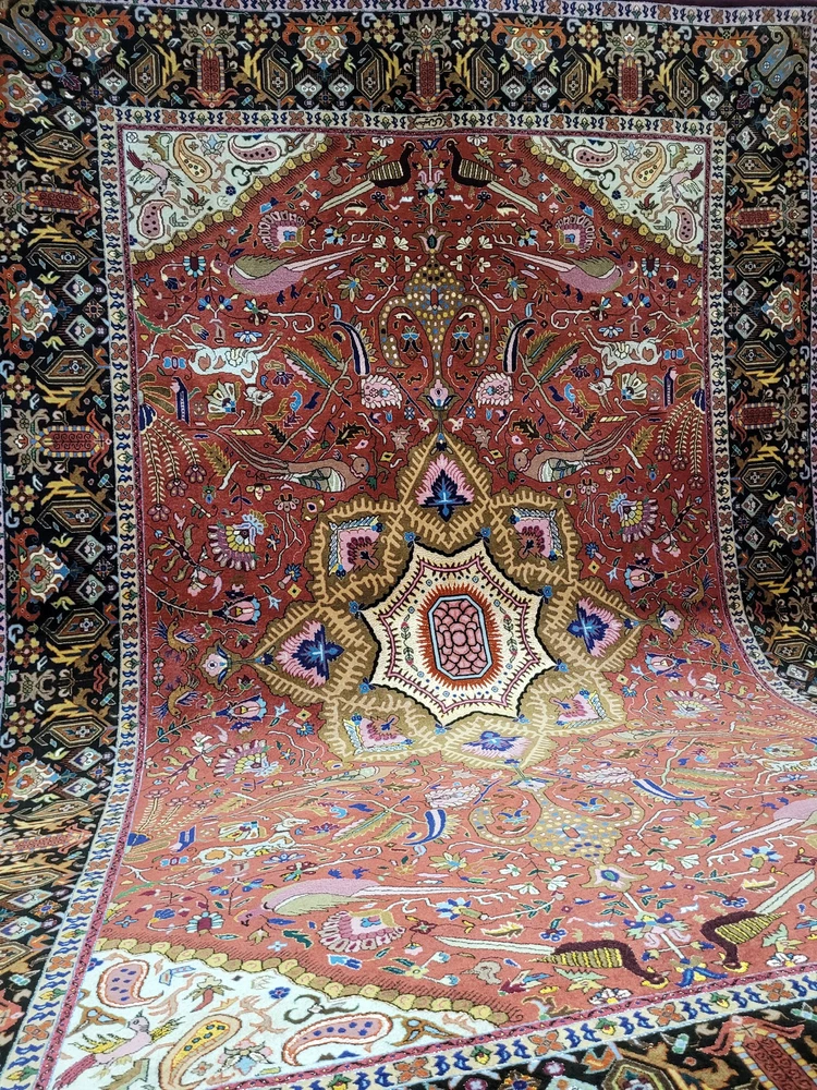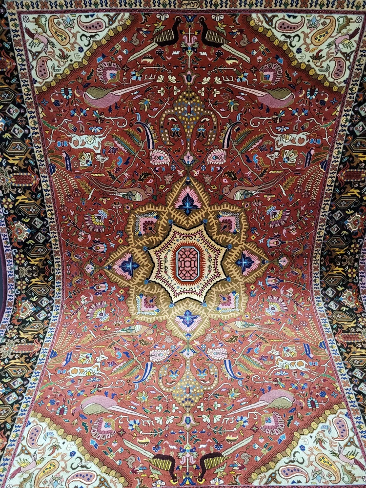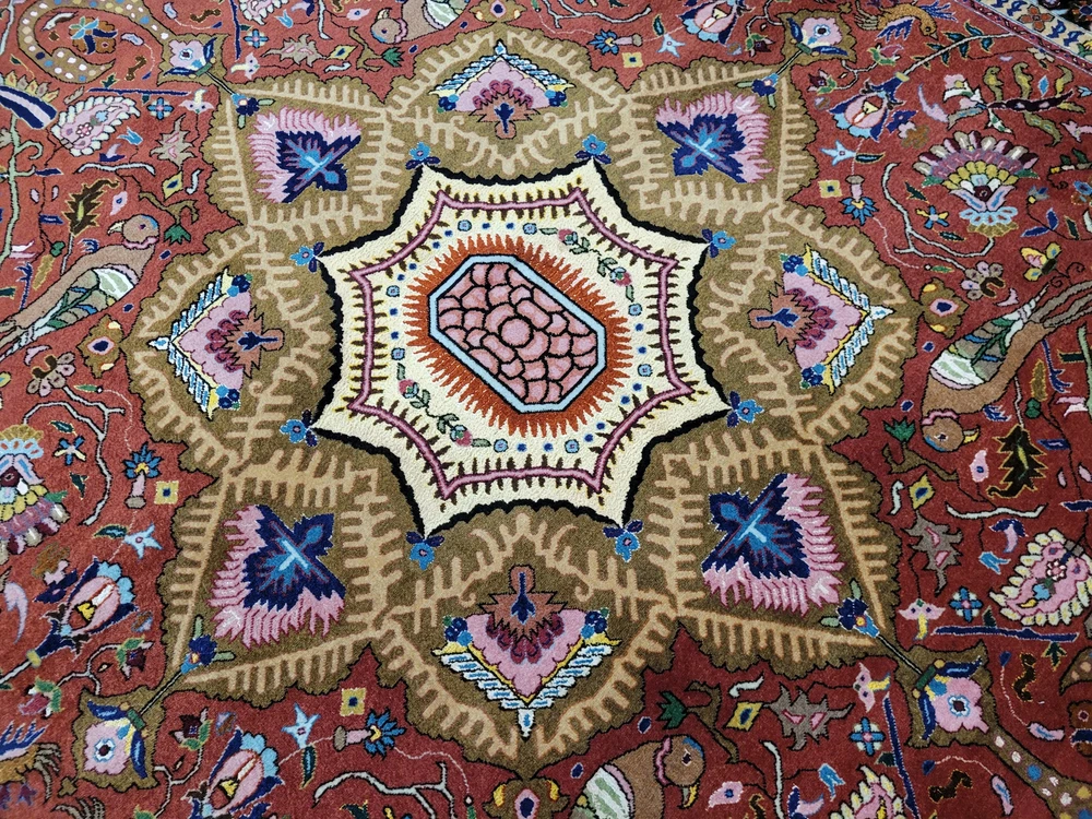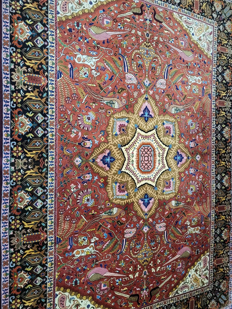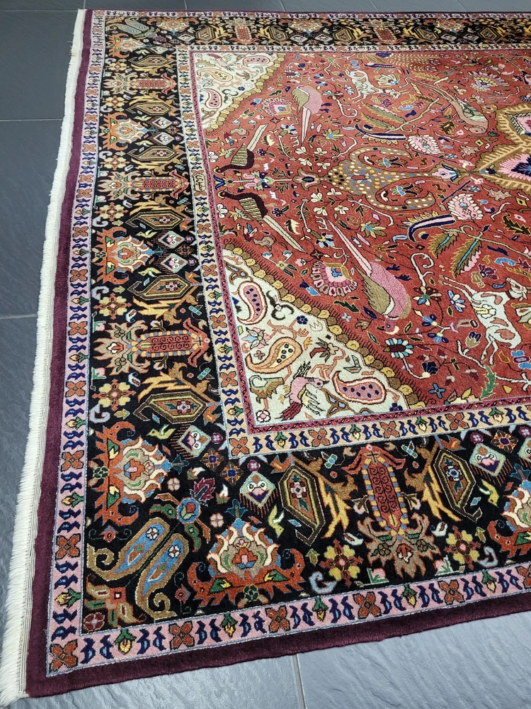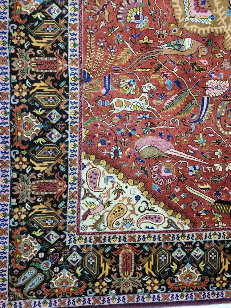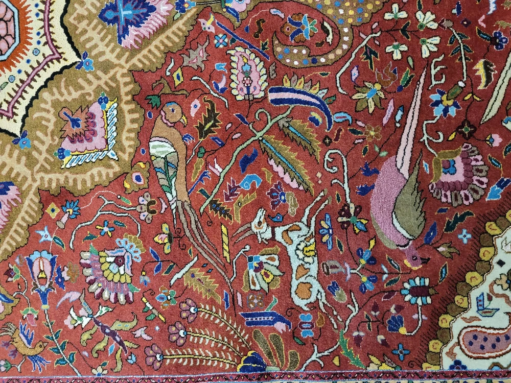 Herzlich willkommen, angeboten wird ein prachtvoller Täbriz Teppich, handgeknüpft aus feiner Korkwolle mit Seide. Das eindrucksvolle Zentralmedaillon in sternförmiger Komposition ist eingebettet in ein reich geschmücktes Feld mit Tier- und Vogelmotiven, floralen Ornamenten und kunstvollen Ranken. Die kontrastreiche Bordüre mit detailreichen Mustern in dunklen Tönen rahmt das Gesamtbild harmonisch ein. Artikelnummer: GJH25/186 Maße: ca. 260 × 175 cm Gewicht: ca. 13 kg Details: Material: Korkwolle mit Seide, handgeknüpft Knüpfung: fein gearbeitet, detailreich ausgeführt Farben: Rot, Gold, Beige, Schwarz, Grün, Blau und zarte Akzente Design: Großes sternförmiges Zentralmedaillon Tier- und Vogelmotive im Feld, kombiniert mit Blüten und Ranken Dunkle Bordüre mit ornamentalen Mustern und farbigen Details Verarbeitung: hohe Knüpfkunst, elegante Wirkung durch seidigen Glanz Zustand: Sehr guter, gepflegter Zustand. Die Bilder sind Teil der Zustandsbeschreibung. Versand: Wir versenden per GLS, UPS und DHL versichert weltweit.