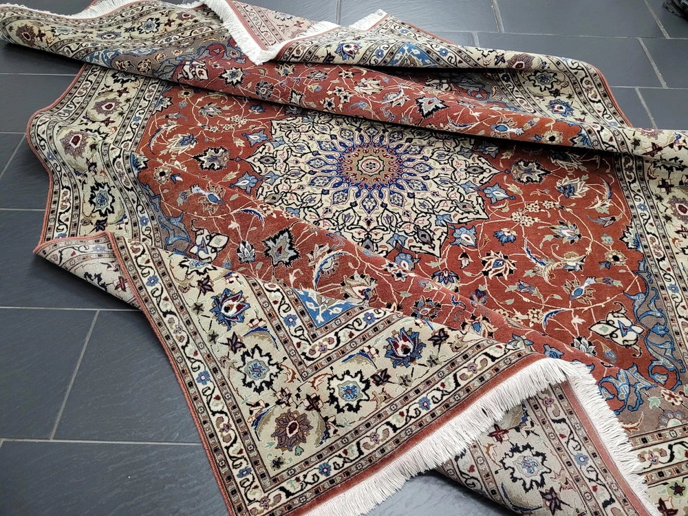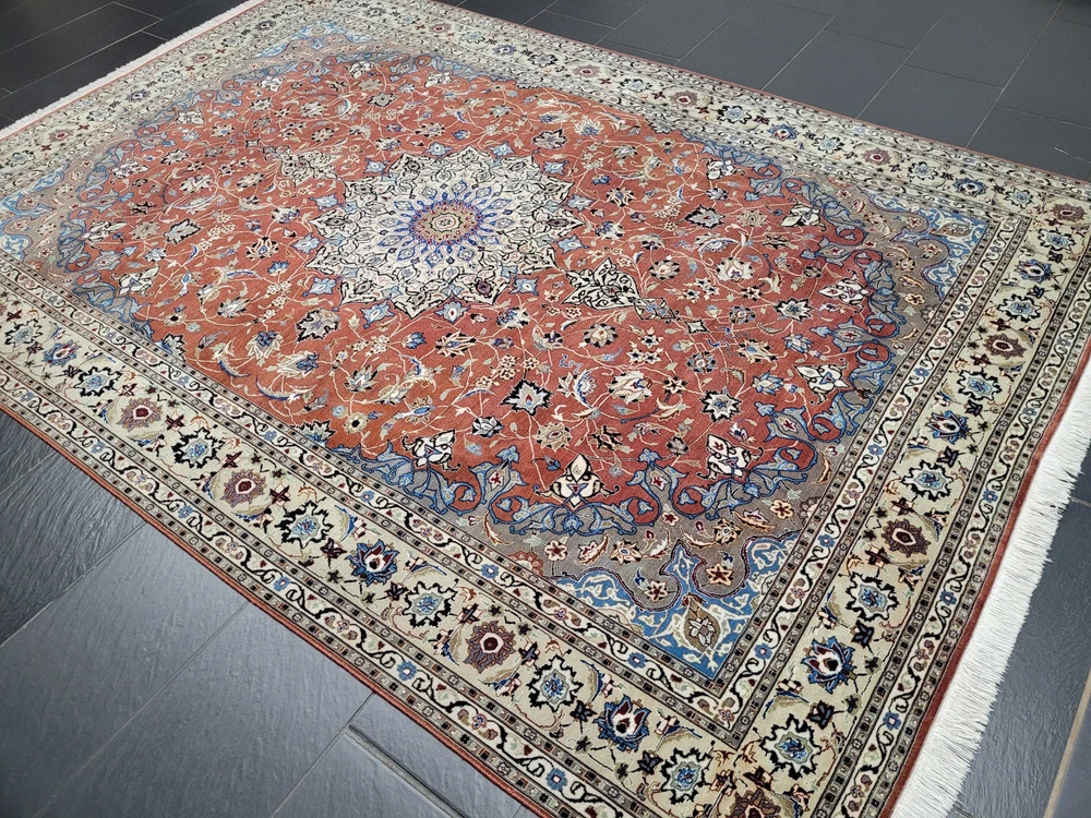 Herzlich willkommen, angeboten wird ein prachtvoller Täbriz Teppich aus feinster Korkwolle mit Seidenanteil, handgeknüpft in meisterlicher Qualität. Das elegante Medaillon-Design mit filigranen Blütenranken auf warmem Terrakotta-Grund strahlt zeitlose Eleganz aus. Die fein abgestimmten Farben in Creme, Hellblau und Gold unterstreichen die exquisite Handwerkskunst dieses klassischen Meisterstücks. Artikelnummer: GJH25/220 Maße: 298 × 203 cm Details: Material: Korkwolle mit Seidenanteil, handgeknüpft Knüpfung: sehr fein, gleichmäßige Struktur Farben: Terrakotta, Creme, Hellblau, Beige, Schwarz, Gold Design: Zentralmedaillon mit feinen floralen Motiven Elegante Bordüre mit Blüten- und Rankenornamenten Harmonisches Farbspiel mit seidig schimmernden Akzenten Verarbeitung: Hochwertige Handarbeit mit dichter Knüpfung und glatter Oberfläche Gewicht: ca. 13 kg Verwendung: Repräsentativer Wohnteppich oder dekoratives Sammlerstück Zustand: Sehr guter, gepflegter Zustand. Die Fotos sind Bestandteil der Zustandsbeschreibung. Versand: Versicherter Versand weltweit mit GLS, UPS oder DHL.