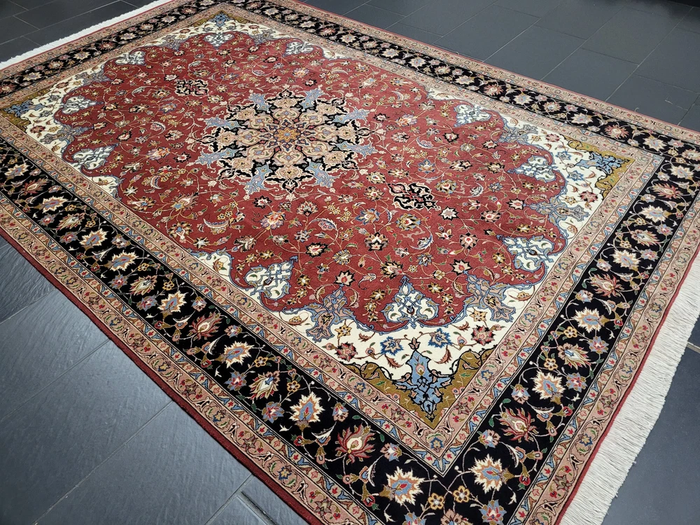 Herzlich willkommen, angeboten wird ein prachtvoller Täbriz Teppich in klassischer Ausführung, handgeknüpft aus feiner Korkwolle mit Seidenanteil. Das detailreiche Medaillon-Design auf weinrotem Grund zeigt eine harmonische Komposition aus floralen Ranken, Palmetten und Arabesken – meisterhaft ausgeführt in feinster Knüpfkunst. Artikelnummer: GJH25/210 Maße: 305 × 205 cm Details: Material: Korkwolle mit Seidenanteil, handgeknüpft Knüpfung: besonders fein, gleichmäßige Struktur (ca. 50 Raj) Farben: Bordeauxrot, Schwarz, Creme, Hellblau, Beige, Gold Design: Zentralmedaillon mit feinen Blütenornamenten Florale Eckzwickel mit eleganten Arabesken Mehrfachbordüre mit filigranem Blumenmuster Verarbeitung: Hochwertige Knüpfarbeit mit glatter Oberfläche und weichem Flor Gewicht: ca. 20 kg Verwendung: Repräsentativer Wohnteppich oder exklusives Sammlerstück Zustand: Sehr guter, gepflegter Zustand. Die Fotos sind Bestandteil der Zustandsbeschreibung. Versand: Wir versenden per GLS, UPS oder DHL – versichert und weltweit.