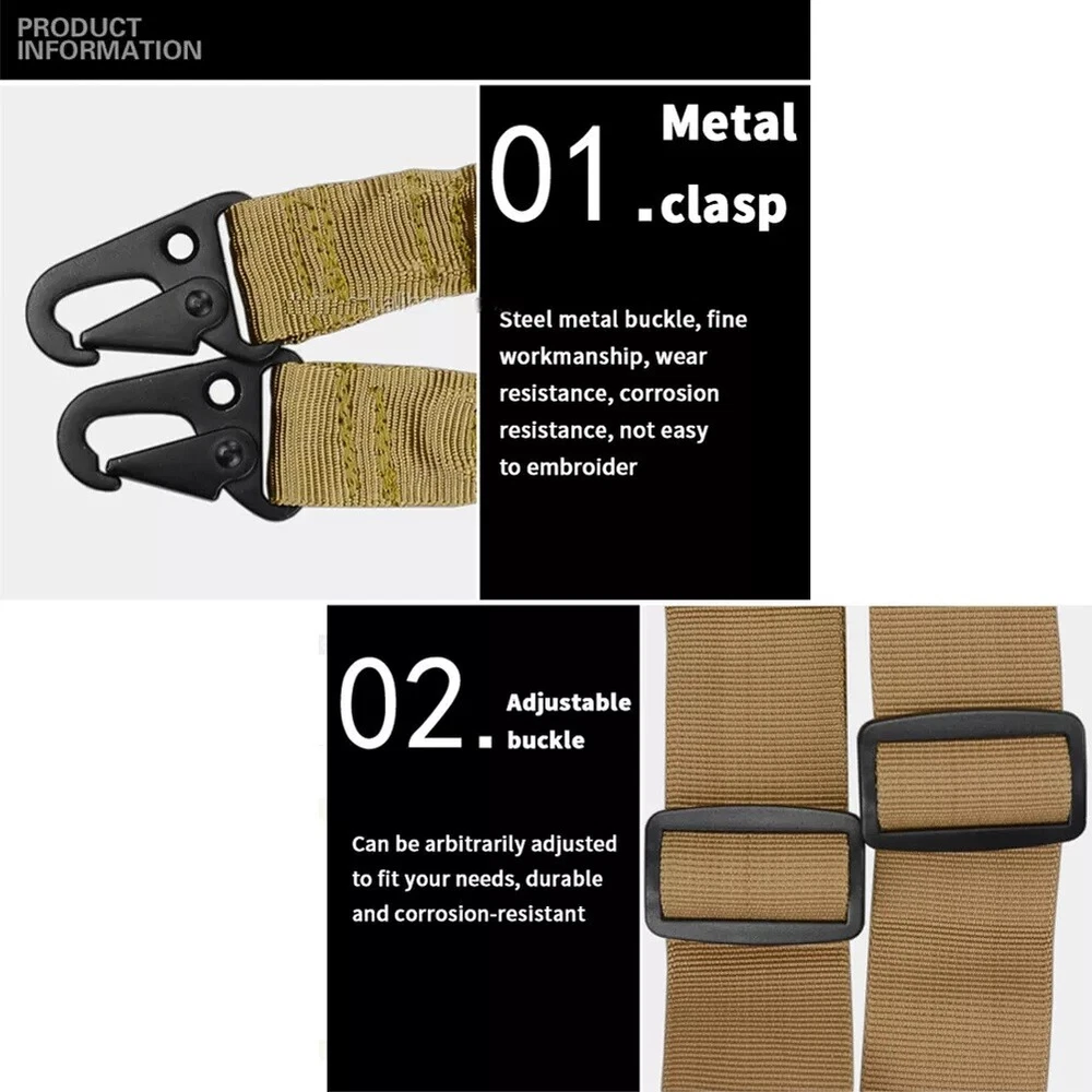 Product Description Features: 【High Quality】The 2 point rifle sling is made of high quality nylon which is extremely lightweight, durable and comfortable. 【Adjustable Length】The max length of gun sling is 66 inches. 【Extra Wide】1.57 inch extra wide design will increase comfortability when wearing the 2 point sling. 【Upgraded Hook】Upgraded metal hook of the ar sling suit for more sizes of connection. 【Multipurpose】The standard sling 2 points can be used as rifle-strap, shoulder bag sling, camera belt or even a safety rope. Very easy to carry. Specifications: Name:Multifunction double - point belt Material: high density 1000D nylon , Waterproof nylon Color: Black, Green, Khaki Size: L168cm * W 4cm / L66.14'' * W 1.57'' Weight: 102g Features: High-quality nylon webbing + High-quality elastic rubber + Steel metal garland buckle. Products Include: 1 x Two Point Gun Sling