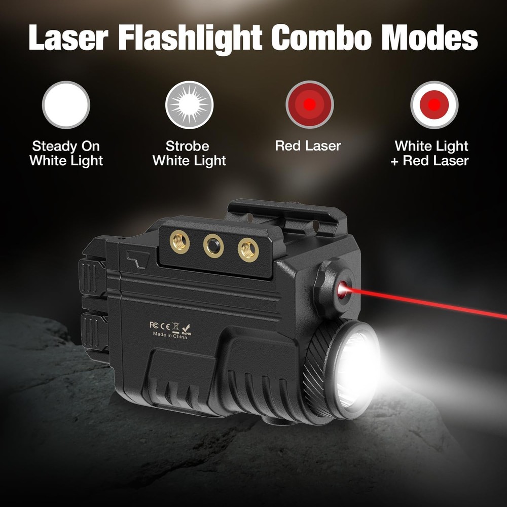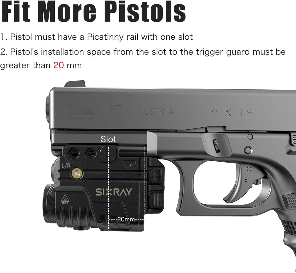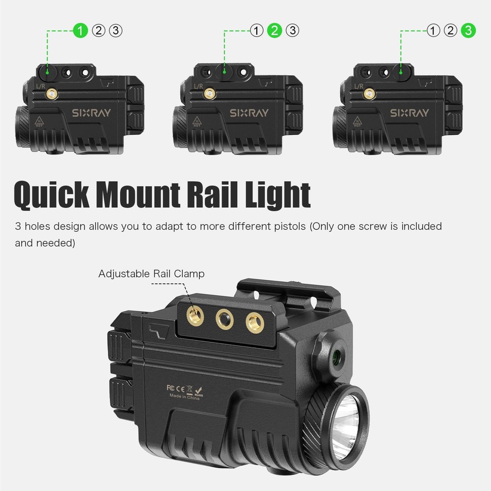 Rechargeable Red Laser and Flashlight for Pistol, 600 Light Combo Product Details Special Feature: Lightweight, Rechargeable Color: Red Laser Light Combo Power Source: Battery Powered Light Source Type: LED Material: Polymer White Brightness: 600 Lumens Included Components: Magnetic Charging Cable, Allen Wrench, Pistol Light Laser Combo Product Dimensions: 1.65"D x 1.17"W x 1.65"H Voltage: 3.6 Volts Light Path Distance: 125 Meters Battery Cell Composition: Lithium Ion Item Weight: 2.05 Ounces Number of Batteries: 1 Lithium Ion batteries required. (included) Brand: SIXRAY Brightness: 600 lumen Battery Description: Lithium-Ion Runtime: 2 hours Style: 600Lumen Red Laser Light Combo Bulb Base: GU10 Mounting Type: Picatinny Mount Recommended Uses For Product: self-defense, law enforcement, hunting Manufacturer: SIXRAY Item Weight: 2.05 ounces Item model number: L5A82R Batteries: 1 Lithium Ion batteries required. (included) Special Features: Lightweight, Rechargeable Batteries Included?: Yes Batteries Required?: Yes Description Pile: Lithium-Ion Special Feature: Lightweight, Rechargeable Color: Red Laser Light Combo Power Source: Battery Powered Light Source Type: LED Material: Polymer Please Note: Pistol must have a Picatinny rail with one slot, and the installation space from the slot to the trigger guard must be greater than 20 mm; Don't fit pistols without Picatinny rail Fit More Pistols: The pistol flashlight laser combo is designed to fit most pistols and can be easily mounted to the Picatinny rail; This pistol light with Three alternative screw holes and Adjustable rail clamp, you can choose the one hole that you want to install (Package comes with Only One screw) Safety and Adjustable beam: The output of the red laser beam Max. 2.788 mW, less than 5 mw, the Class IIIa; This red laser delivers accurate targeting and the adjustable laser keeps your aim steady 600 Lumen White Light: Enhance your accuracy with the pistol light laser combo, perfect for low light conditions; The pistol flashlight combo with a powerful 600 Lumen flashlight, 125 meters concentrated beam distance, Constant strobe and Momentary strobe features Durable and Compact: The pistol laser light combo is constructed from durable materials for long-lasting performance; The red laser flashlight combo is easy to use, with intuitive controls that allow you to quickly switch between the flashlight and laser modes; Compact, Lightweight (2.05 oz, 2.32x1.17x1.65 inches) design makes this handgun red laser light combo useful in self-defense, law enforcement, and hunting applications