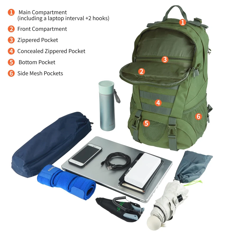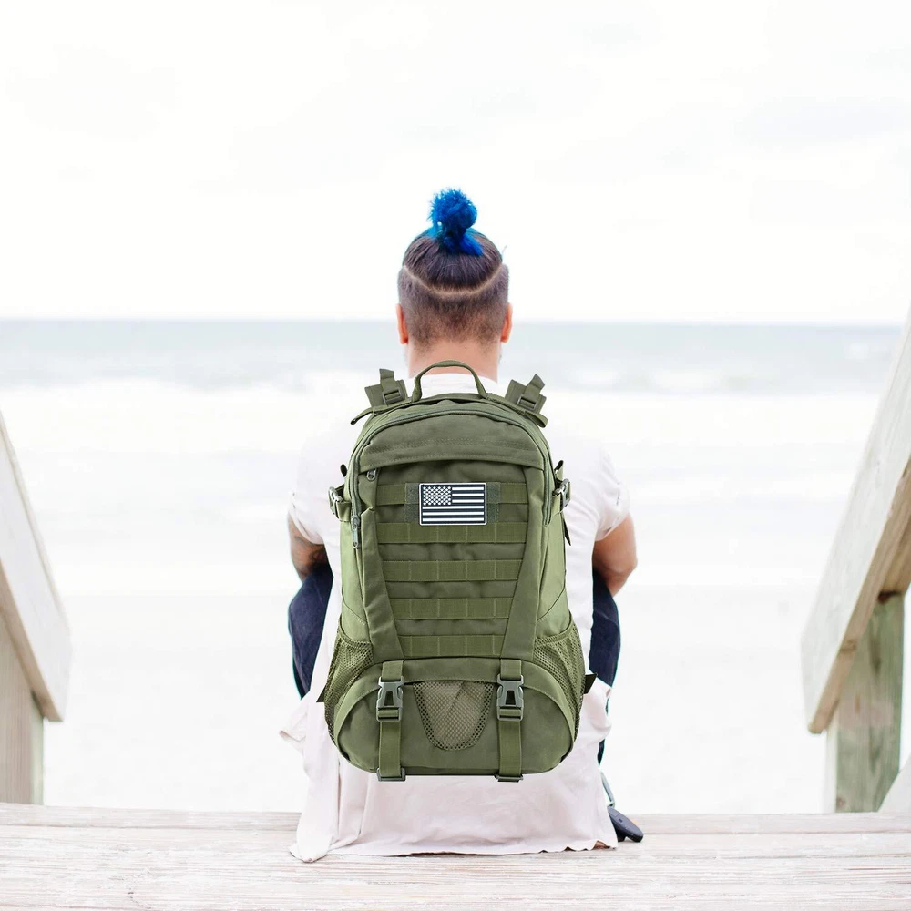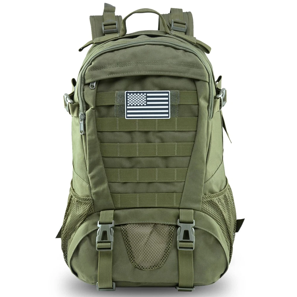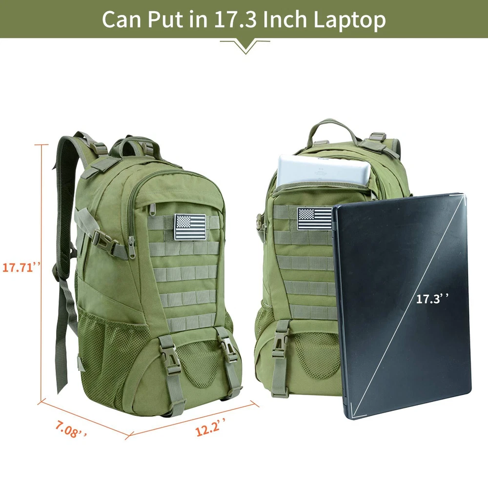 【DURABLE & WATERPROOF】Made of High-quality nylon material assault pack is tear-resistant, which guarantees for your long term use. Outer nylon material with a waterproof function can protect your item inside being wet in inclement weather 【MOLLE DESIGN & FOAMED PROTECTED】Molle system design provides portability for you to combine with knives, pockets, hooks or other small gadgets. This molle hiking daypack comes with a USA Flag Patch stick on the front can make you stand out when in the forest. The foamed back part and padded shoulder straps make you feel comfortable even it loads a lot 【CAPACITY】30L capacity versatile backpack includes 2 main compartments(the bigger compartment has a laptop interval and the other main compartment has an interior zippered pocket), 1 front pocket, 1 pocket on the bottom and 1 water bottle net pouches on each side. It’s roomy and big enough for the items you want to carry 【STABLE STRAPS】The chest and waist straps with fasten buckles make it easy for you to buckle the straps in seconds to stable the trekking backpack. The buckle strap on both sides and the 2 compression fasten buckle straps on the bottom enhance the army backpack’s stability when moving 【MULTIPURPOSE BACKPACK】Moderate backpack is perfect for your outdoor activities like survival in the wild, camping, hiking, hunting, military or even treated as a day pack is perfect. This cool backpack is not just for men but also fits for women
