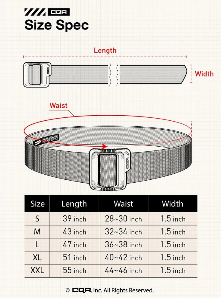 Duty belts are constructed with military standard and law enforcement design Military Specification standard design for durability, ruggedness and reliability. Rip-resistant 1.5" single layer nylon webbing Non-metal sturdy plastic polymer buckle Exceptional versatility crafted with a simple and efficient design Perfect for every occasion yet rugged for many applications An easy thread belt tip ensures fast on and off Tactical Belt Series designed for law enforcement, military, and outdoor activities. [Metarial] The Polyester fabric is rip-resistant and lightweight to allow on-the-go everyday carry. [Plastic Buckle] High-density non-metal buckle does not need to worry about metal detector security. [DIY Length] It is easy to customize the length for making a perfect fit for yourself. It is suitable for tactical training, hunting, camping, maintenance, and everyday life. *Please see below for Size Chart