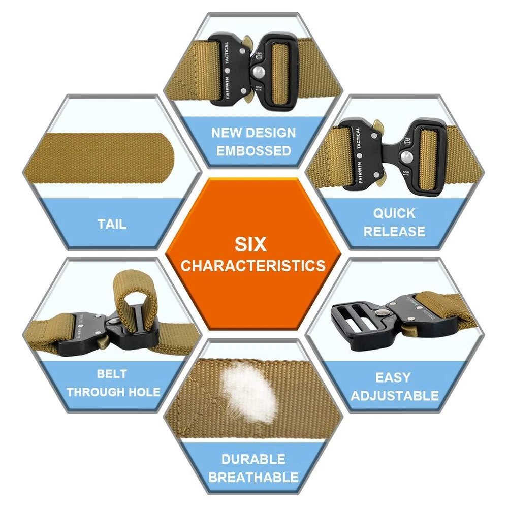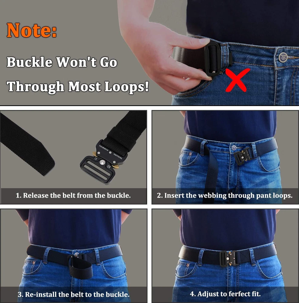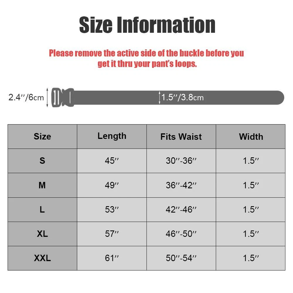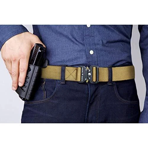 The belt is designed to be worn with most casual or tactical pants. Whether you carry everyday, or just want a solid belt that will withstand abuse without sacrificing comfort, the tactical belt is a perfect choice. Quick release, heavy duty buckle built to last, comfortable and secure.The quick release functionality is intuitive and smooth when you push the two golden tabs down at the same time. If just one tab is engaged, the connection will still hold and fully re-lock on its own. Eco-friendly nylon material: Our belts are made from high quality, 1.5" nylon webbing. Adjustable sizing: allowing for movement of your waistline or for the extra space you need for your daily carry. Buckle note: While we find the belt to work well with some belt loops, most belt loops can be too small to fit the buckle through. In this case, each time you want to take the belt on/off a pair of pants, please remove the male end of the buckle, loop the nylon through the belt loops, then re-install the male buckle. Colors available: Black, Brown, Green. Warranty: 2-year no questions asked warranty and 30-day money back guarantee. Note: The web belt is not made for repelling and climbing applications. About us: is a registered trademark. We aim to provide the best products and service to our customers. Here, we believe you can always find a satisfactory product and have a nice shopping experience. Tactical Belt Length - 45 inch, Width:1.5 inch, fit for waist up to 36 inches. Buckle Size: 2" in width and 5/16" in thickness. Heavy Duty Metal Buckle - This tactical belt features a military belt buckle made of heavy-duty metal. Quick Release - Intuitive and smooth quick release functionality when you push the golden tabs down at the same time. If just one tab is engaged, the connection will hold and fully re-lock on its own. Quality Nylon Belt - Made by 1000 D environmental friendly nylon material, soft and comfortable for daily use. Perfect Service -If you have any problem of these men belts, don't hesitate to contact with us. We promise to provide you satisfaction guarantee.