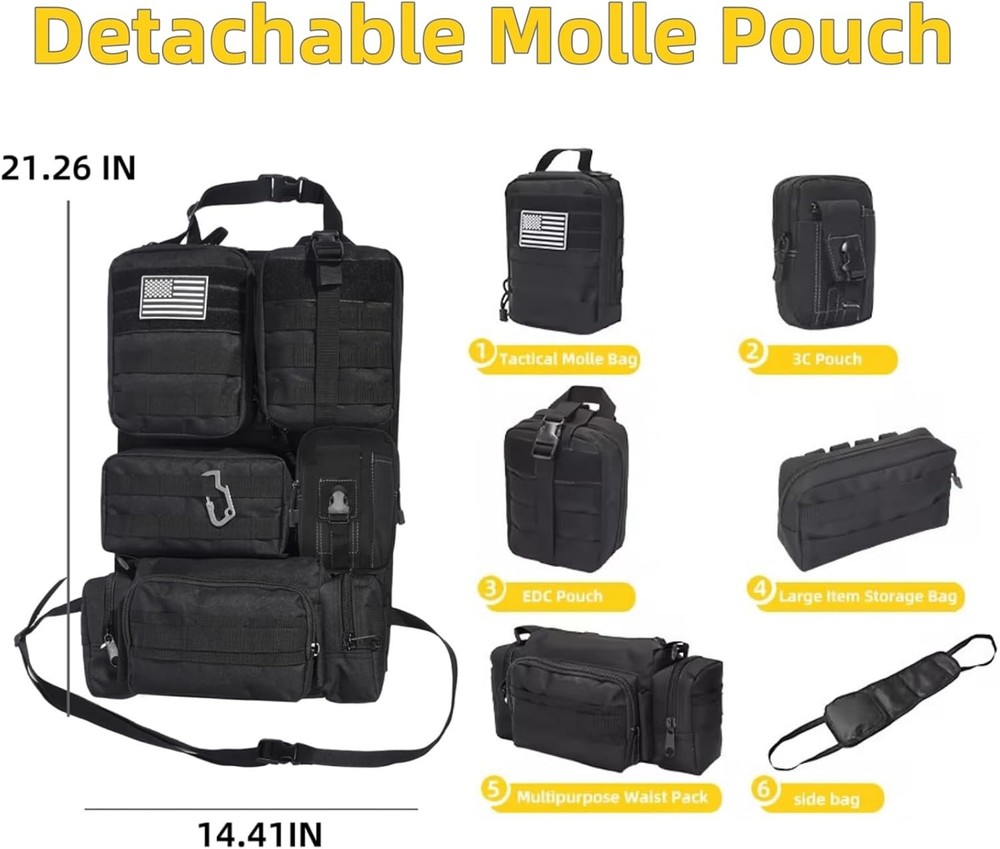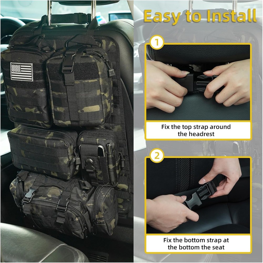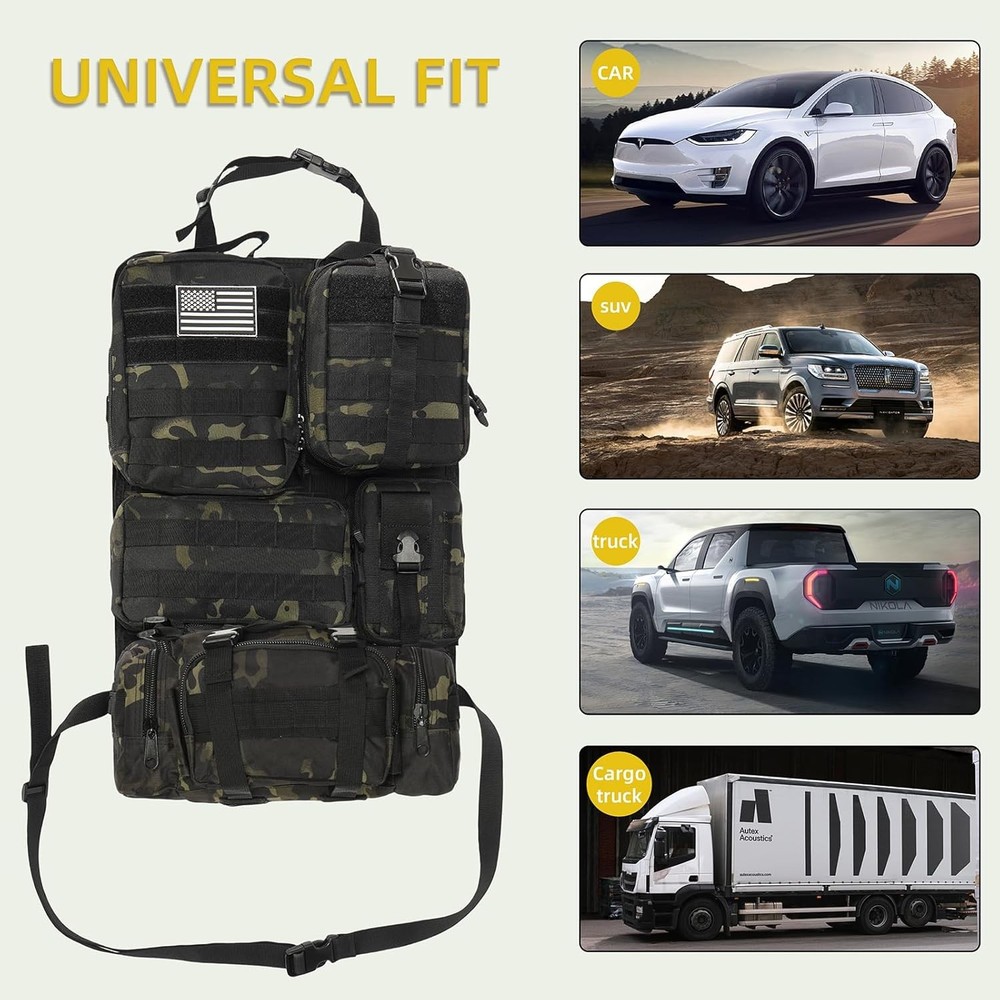 Tactical Car Seat Back Organizer,Tactical Molle Organizer CP Camo Product Details Specific Uses For Product: Automobiles Special Feature: Foldable Color: CP Camo Brand: BIAOXMAW Product Dimensions: 2"D x 14.5"W x 22"H Number of Items: 1 Manufacturer: BIAOXMAW Item Weight: 4.2 pounds Item model number: Seat bag Special Features: Foldable Included Components: bag Batteries Included?: No Batteries Required?: No Specific Uses For Product: Automobiles Special Feature: Foldable Color: CP Camo Brand: BIAOXMAW Product Dimensions: 2"D x 14.5"W x 22"H Number of Items: 1 Manufacturer: BIAOXMAW Mounting TypeNumber of Compartments: Hanging Mount5 【Large Storage】Tactical molle seat back Organizer with 5 different types of molle bags provides ample storage space, can help you solve the storage problem of items of various sizes. Medical pouch holds your first aid supplies. Keeping your car clean and organized 【High Quality Materials】The tactical seat back organizer is made from high-quality nylon with stronger study and breathable,wear-proof and washable,resistant to fading in any environment.Zippers are sturdy,stitching is solid have a great loading capacity.Provide great protection from water, dirt and spills. 【Easy Installation】The car seat back organizer has adjustable strap,makes it easy to install on the top of the car seat headrest and the bottom of the front seats.After installation,the seat organizer can be easily transferred from the set position to the seat position or from the vehicle to other vehicles, which is convenient for your traveling. 【Versatile Compatibility】This truck seat organizer suitable for most vehicles seat back,SUV,truck, pickup,etc.Its universal fit ensures that it can be easily installed in different car models without any hassle. 【Package Including】The molle seat back organizer includes: 1*Tactical Molle Bag,1*Cell phone Pouch,1*Medical Pouch,1*Large Item Storage Pouch,1*Multipurpose Waist Pack,1*Seat Side Bag,1*Carabiner Clip, it provides ample storage space for all your essentials and perfect for your outdoor activities.