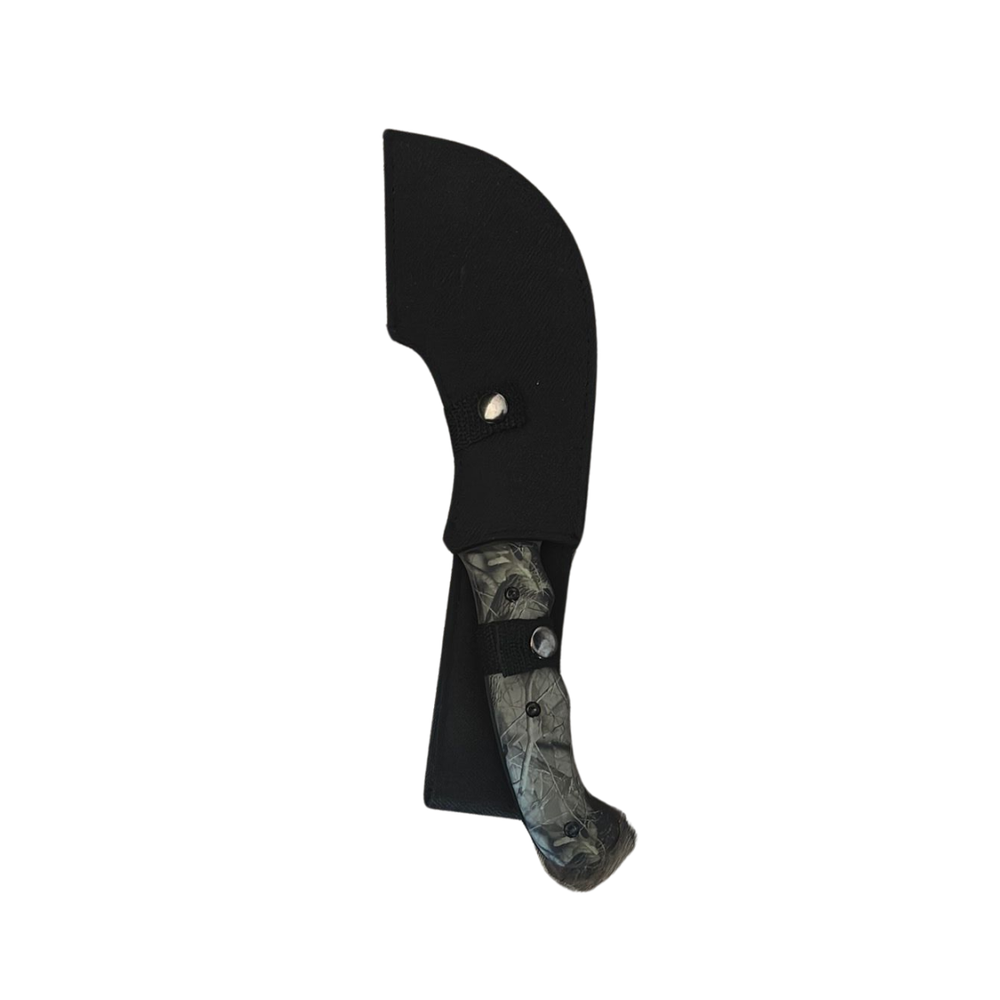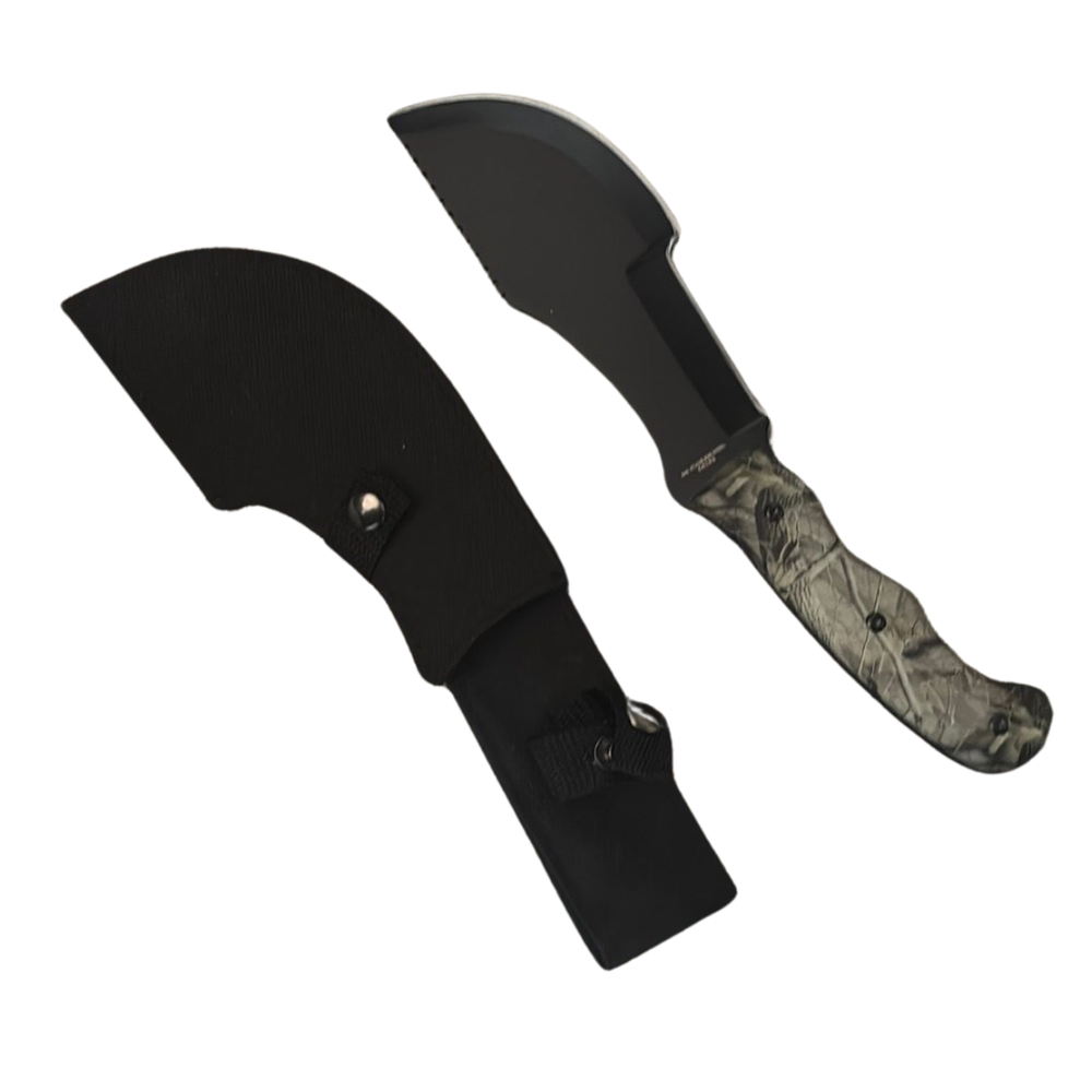 Rugged and ready for action, this cleaver-style fixed blade is built for survival, fieldwork, or standout display. The wide, curved stainless steel blade has a matte black finish for a stealth look, while the camouflage-patterned handle offers a solid grip and outdoor aesthetic. Comes with a durable nylon sheath for secure storage and carry. Overall length length: 11” Blade length: 6” Blade: Full-tang cleaver-style with matte black finish Handle: Durable camo-patterned composite Sheath: Black nylon with dual snap closures Belt Loop