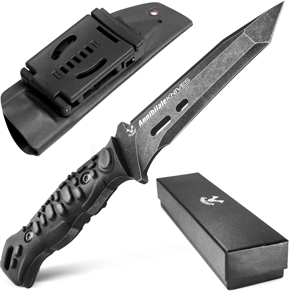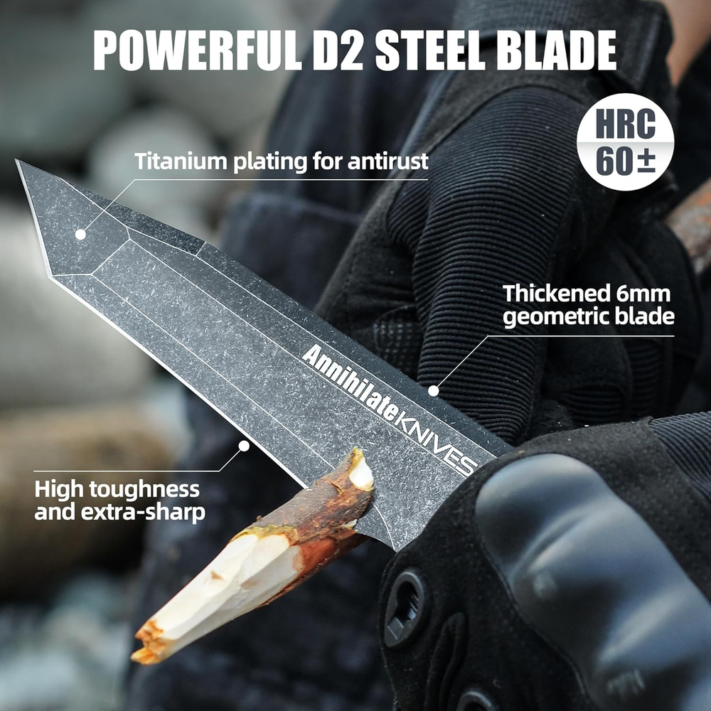 Very sharp out of the box:3.85"(9.8cm) blade edge length; 9.45"(24cm) total knife length; 302g weight. The survival knife has a full tang keel/backbone thickness of 0.24 inches (0.6cm), which is a one-piece keel and is considered the most durable and solid knife structure. Razor-Sharp D2 Blade: The camping fixed blade features a D2 steel blade, which is renowned for its superior hardness and corrosion resistance (HRC60-62°). Its geometric cutter head has a strong piercing ability, making it capable of handling outdoor tasks with ease. Ergonomic full tang Handle: This G10 handle with a textured surface that enhances grip without sacrificing comfort. It provides a secure hold that is resistant to pressure, corrosion, and heat. The end of the handle can also function as a safety hammer. Adjustable kydex sheath: The high-strength, lightweight Kydex sheath allows for versatile angle adjustments. It is easy to attach to your waist or backpack, making it a portable camping knife that you can carry around and enjoy outdoor activities with. Versatile application: Whether you need to prepare food, chopping wood into chips, cut ropes, or break glass for emergencies, it will be your ideal choice. This hiking knife is a reliable outdoor companion for camping, survival, hiking, and others. Product Description ZUNE LOTOO D2 Fixed Blade Tactical Knife As you can notice D2 is a high Chromium steel, which provides hardness and high corrosion resistance, it’s almost a stainless steel in the composition properties. Good Toughness: The D2 offers a good toughness, not the best one but still a decent toughness. Good edge retention : The D2 has a HRC that can reach 62HCR, which result in a great edge retention. Wear and rust resistance: It has a good wear resistance, that’s why knife maker are attracted to it. Fixed blade survival knife with kydex sheath Waterproof and Scratch resistant (Rockwell “R” hardness of 90) Holds its shape and will not alter unless forced under certain conditions Low maintenance-Able to simply wipe clean Usually as the knife is re-inserted into the sheath, you will hear a ‘click’ sound which helps you know your knife is safety secured. Lasts longer and it’s far less likely to damage your knife, no matter how many times you remove and re-place it in the sheath. The sheath attachment adjusts for belt / pack strap thickness. Can be turned in 90 degree increments to wear the knife handle up, down, front or back.(Change the orientation with screws) FULL Tang Survival Knife with 6.15mm Spine In the knife world, there is a difference between "cut" and "slice". The thinner the blade, the better a knife is for tasks like cutting and slicing. A thinner survival knife allows more accurate control when you’re slicing up meat or vegetables, but what if you have to do some chopping or batoning? These actions can be carried out with thinner blades, but it’s not ideal. Whenever you perform these tasks, you need some weight behind your blade: tackling wood with a ¼” blade is going to be easier and more efficient than using one that's only ⅛” thick. Geometry blade Great for puncturing Tail hammer Used for emergency safety hammer G10 handle Corrosion resistance and heat resistance, providing high friction and comfortable non -slip grip DIY Tang Remove the shell, fix it with a paracord, and tie it to your hand, making it more stable when surviving in the wild Sharp out of the box The sharpest edge is achieved using D2 Steel Survival Knife A proper survival knife should be enough to deal with all kinds of emergencies, even as a barbecue stick