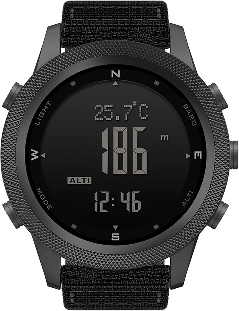 Tactical Military Watch - Digital Outdoor Sports Watch for Men, Pedometer, Compass, Calories, Durable Nylon Band, Model: Dimensions: 46x46x14mm | Weight: 95g ( Display: FSTN | Strap: Durable Nylon | Waterproof: 50M Sensors: Altimeter, Barometer, Compass, Thermometer, Pedometer Compatibility: Weather tracking, swim-proof design, and military-standard durability. Specification Time Functions Hour, Minute, Second, (2000-2099), , Date, Weekday Countdown Timer 99hours59 minutes seconds Alarm Clock 2 Sets Alarm Clock Corporates Digital Compass, Altimeter, Barometer, Thermometer, Air Pressure Trend And Altitude Trend And Altitude Trend El Backlight Air pressure measurement 300~1100mbar/ Height measurement -698~+9164m/-2246~+30067F Temperature measurement 10 ~ + 60 ℃ / 14 ~ 140 ℉ dial material Metal/Glass EL backlight Clear at night Dial thickness