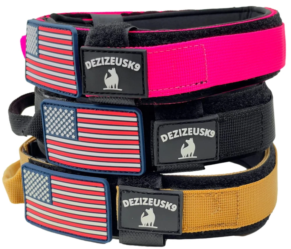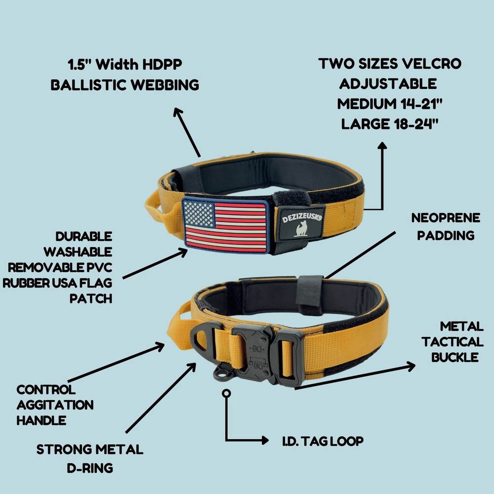 Versatile Sizing: Our tactical dog collar with handle is available in two sizes: adjustable for medium dog collar with neck sizes ranging from 15" Inch To 21" Inch and large dog collar and XL dog collar from 18" Inch To 24" Inch. Perfect for accommodating the growth and needs of active dogs. Please measure your dog for a proper fit; measure your previous dog collar or your dog's neck before ordering our wide dog collar personalized dog collar. Professional Grade: 1.5 inch strong dog collar or working dog collar perfect for medium to large breed working dogs; suitable for police dog collar, military dog collar, protection dog collars, or personal pet dogs. Double-layered strong wide thick 1680D ballistic nylon webbing with Neoprene Padding, custom dog collar with fur saver comfortable around your dog's neck yet is durable and reliable big dog collar includes a removable rubber PVC American flag patch Quick Release Metal Buckle: Metal clasp dog collar equipped with a tactical quick-release metal buckle; ensures secure fastening and easy removal of the heavy duty dog collar; ideal for strong, working K9s and active large dogs; perfect for quick release dog collar and dog collar with metal clasp; built-in agitation handle for close quarters control with your tactical collar for dogs Integrated Handle for Control: The heavy duty dog collar features an integrated handle on this dog collar for large dogs , providing extra control over your dog during training or in high-stress situations; ideal collar for dogs collar with handle and customizable dog collar; includes separate ID tag loop for your K9's ID and license tags, preventing accidental removal from the D-ring USA American Flag Patch: Show your patriotism on your custom dog collar with name dog collar name plate the American flag patch included with our military-style dog collar. This customizable tactical collar allows for additional hook and loop patches or name plates, making it a versatile choice for your pet. Ideal for service dog collar military style and personalized dog collars with name