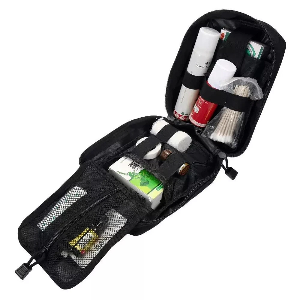 Features: Premium Quality - Made from 900D heavy duty polyester material. Waterproof and anti-corrosion, sturdy and durable. Large Capacity - Multiple tight and elastic straps and a roomy pocket is enough to hold your vital essentials. Interior pockets for holding money, credit cards, pens and other small items. Wide Application - Perfect for military personnel, EMT, police, firemen, and by civilians. Also ideal for hikers, campers, and other outdoor enthusiasts to carry first aid supplies to treat bites, wounds, and other injuries. Specifications: Material: Nylon Size: 8"x6"x4"