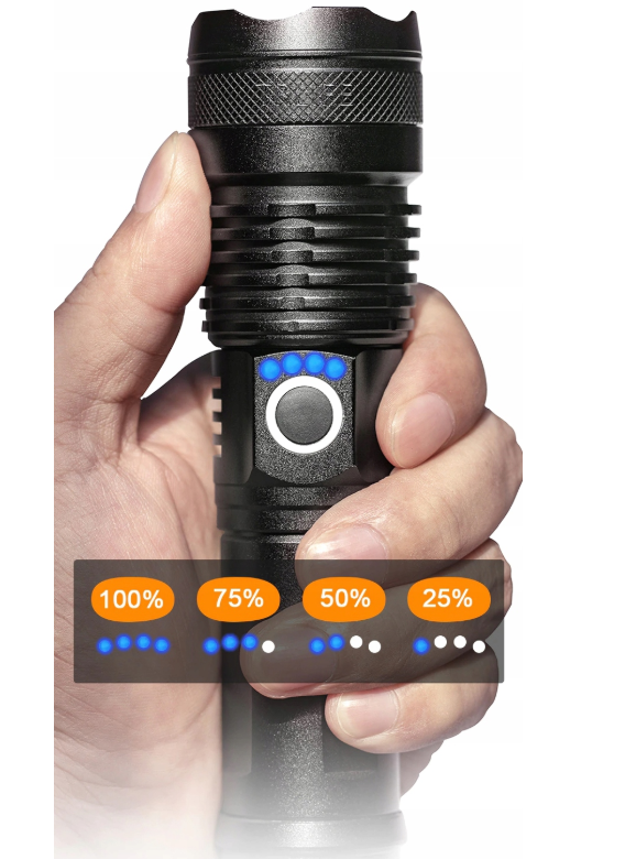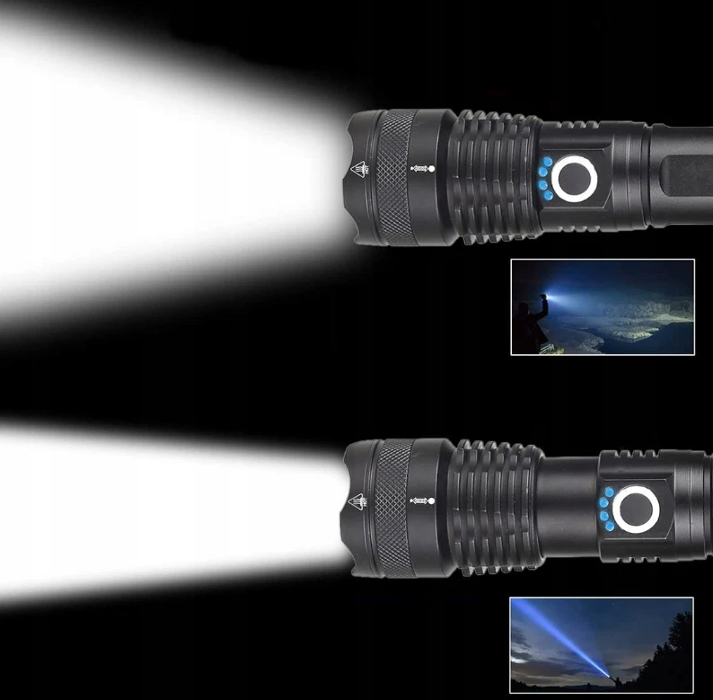 POWERFUL TACTICAL LED LAMP XHP50 -ZOOM SPECIFICATION: ☝️ Waterproof – thanks to its resistance to moisture and rain, the flashlight will work in all weather conditions. ☝️ Zoom function – the ability to adjust the light flow allows you to precisely illuminate both close and distant objects. ☝️ Charge level indicator – intuitive indicator informs about the battery status, helping to avoid unexpected discharge. ☝️ Cordless or battery-powered – gives you flexible power supply, adapting to your needs. ☝️ 5000lm luminous flux – strong, high-brightness light is ideal for demanding tasks. ☝️ Micro USB – enables quick and convenient charging. ☝️Suitcase – a practical suitcase makes it easy to transport and store the flashlight and accessories. ☝️5 lighting modes – various light settings allow you to adjust the intensity and effect to the situation. ☝️Power 10W – high efficiency guarantees bright and energy-saving lighting. ☝️Range 1500M – impressive range allows effective lighting of large spaces. RECHARGEABLE OR BATTERY POWERED The flashlight is equipped with a rechargeable battery and a basket for three AAA batteries. This allows you to use the included USB cable to charge the battery with a regular USB phone charger, or use the flashlight on batteries when traveling when you don't have access to a power outlet.