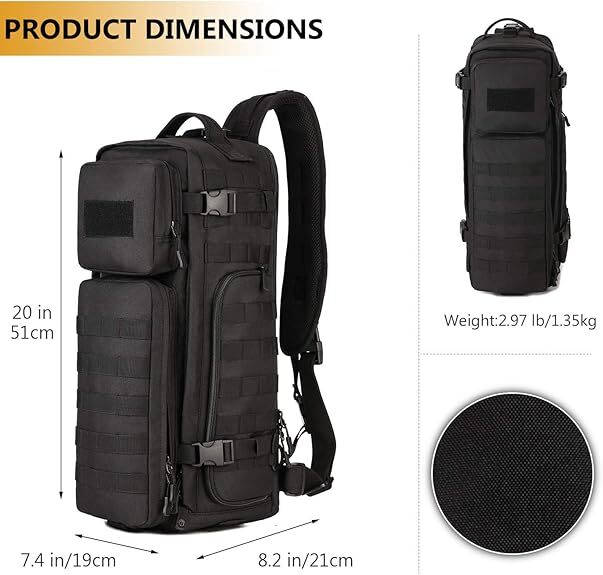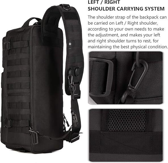 out this item ✅ MATERIAL -- Made A+ Grade durable nylon ripstop fabric; scratch-resistant, water-repellent, not easy to fade after long-term use, which wear-resistance is higher 10 times than conventional polyester fabric tension ✅ OUTSTANDING STRUCTURE -- 20" W x 8.2" H x 7.4" D. The tactical sling pack designed has multiple pockets for storing different stuffs. The 2 front for frequently-used items, and right side zip pocket and left side open pouch can fits things easy take them in and out; The large compartment can fits up to 20 shirts; The hidden back zip pocket for valuable items; Multi-layer storage compartments can accommodate a lot of EDC equipments ✅ MOLLE MODULAR DESIGN -- Molle webbing system on front and both sides, designed to be used in combination with other equipments, you can attaching extra pouches or gears; such as kettle pouch, walkie-talkie pouch, first-aid pouch, torch pouch and so on ✅ INTIMATE DESIGN -- Backpack has hydration system that works great for a up to 3L hydration bladder (Not included) as hydration pack; Hook-and-loop for attaching personality tags according to your own liking; The pack can be carried on both shoulders; This tactical sling bag double stitched, padded shoulder straps and back area with mesh backing for comfort, ventilation, and strength during travel. With high-quality zipper. Easy adjustable waist & chest straps ✅ WIDE APPLICATION -- 3 Carrying options (shoulder bag, chest / back sling bag, hand carry bag). Well-organized items placement serve you in different usage scenarios from everyday use, stroll, camping, hiking, to trip and travel