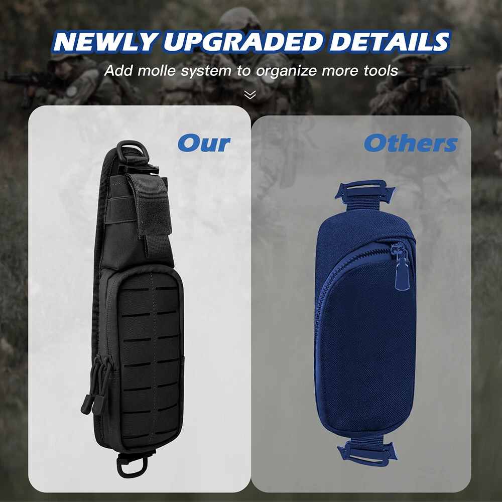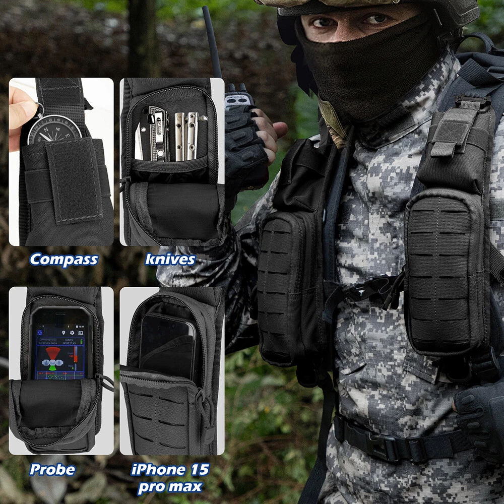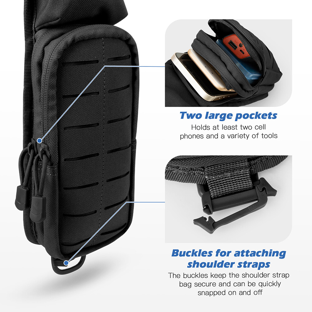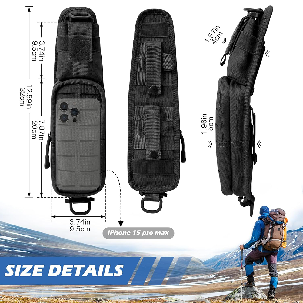 【🎒EXTRA BACKPACK STORAGE】 Backpack Shoulder Strap Bag with three main pockets and an elasticized compartment inside the zipper pocket. The shoulder strap bag is a very good tactical backpack accessory. You can use the backpack strap pouch to store your small items such as cell phone, sunglasses, knife, flashlight, EDC gear, walkie talkie, radio etc. 【🎒 MOLLE SYSTEM】 Further provides capacity and is a hanging place for many of your small items, you can put glasses, pocket knife, hooks or other small tools. When you want to go hiking outdoors, this shoulder strap bag can bring extra capacity to your backpack 【🎒 MULTIPLE MOUNTING METHODS】 You can decide what mounting method to use according to your backpack. 1. Attach with the back Velcro, easy and convenient. 2. Attach with the buckle on the back of the shoulder molle pouch, more sturdy. 3. Attach with the Hook-N-Loop flap/cover on the top of the backpack attachements. Each method secures the Backpack Shoulder Strap Bag vertically/horizontally on the backpack 【🎒 NEW UPGRADED DESIGN】 Compared with the shoulder strap pouch on the market, Jueachy backpack accessories have more capacity and can put more things. The zipper is also replaced with a more silky and sturdy premium zipper. Also there is a D-ring on each end of the backpack strap phone holder 【🎒 SIZE & FABRIC】 Molle strap pouch use the high quality oxford material, tear and scratch resistant, durable and waterproof. Size: 36*9.5*5CM (L*W*H), Zipper Pocket Size: 19.5*9CM (L*W), Top Pocket Size: 9*7.5CM (L*W). This tactical backpack pouch is the best and perfect companion for tactical backpack