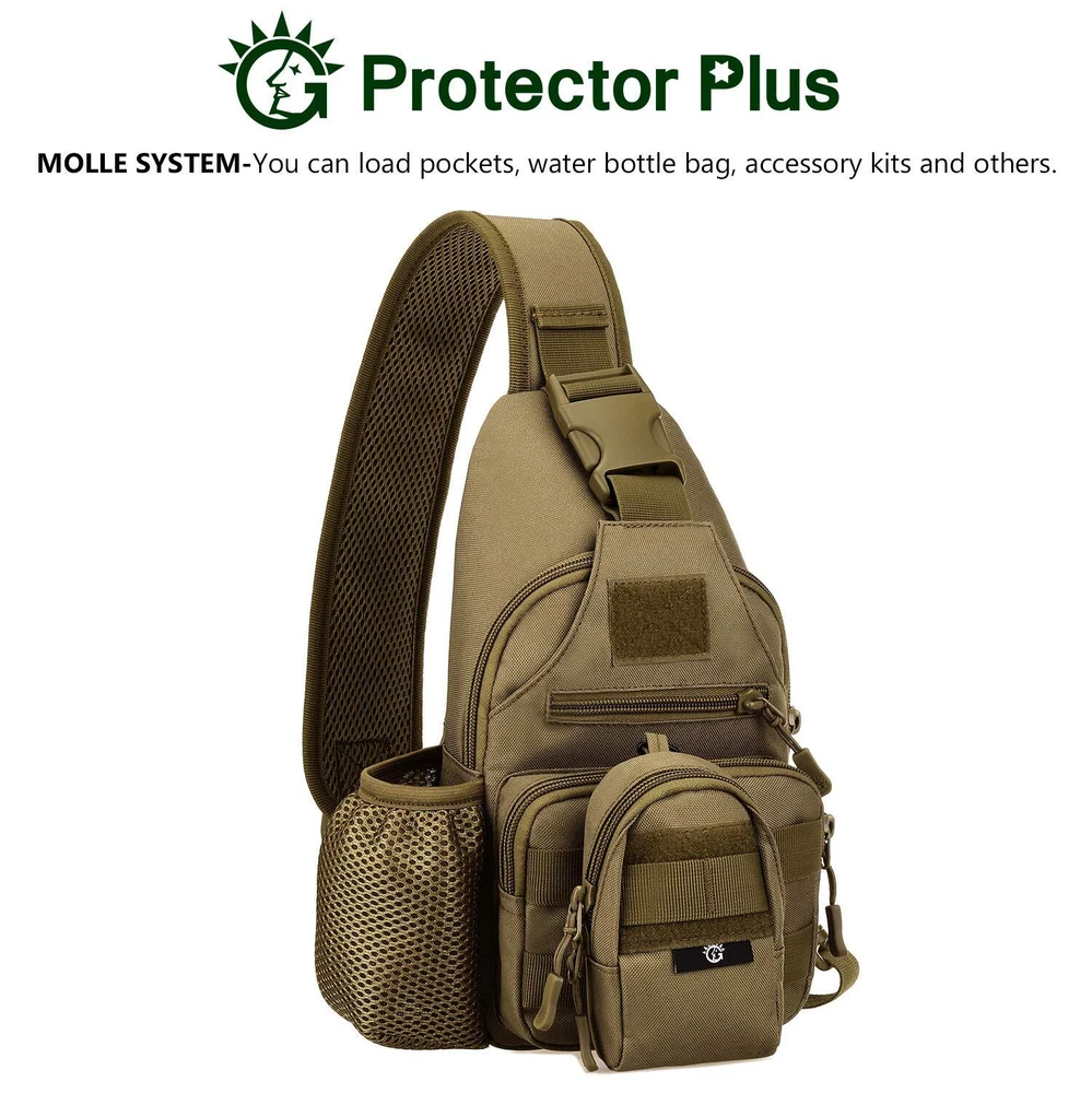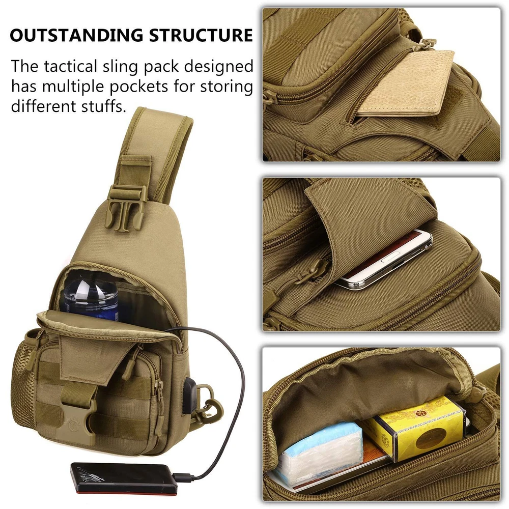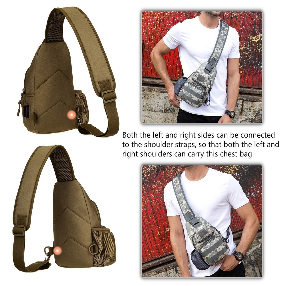 ✅ MATERIAL -- Made A+ Grade durable nylon ripstop fabric; scratch-resistant, water-repellent, not easy to fade after long-term use, which wear-resistance is higher 10 times than conventional polyester fabric tension ✅ OUTSTANDING STRUCTURE -- 6.3" W x 11.8" H x 1.96" D. The tactical sling pack has multiple pockets, includes 1 zipper main compartment, 1 front zipper pocket, 1 mesh water bottle holder pouch on left, Multi-layer interior storage compartments can accommodate a lot of EDC equipments ✅ MOLLE MODULAR DESIGN -- Molle webbing system on front, designed to be used in combination with other equipments, you can attaching extra pouches or gears; such as kettle pouch, walkie-talkie pouch, first-aid pouch, torch pouch and so on ✅ INTIMATE DESIGN -- The external USB port charging design on right, which free your hands, can charge your mobile phone at anytime and anywhere; The pack can be carried on both shoulders ✅ WIDE APPLICATION -- Well-organized items placement serve you in different usage scenarios from everyday use, stroll, camping, hiking, to trip and travel