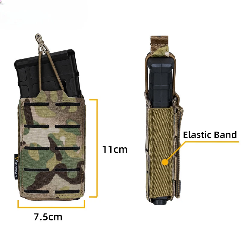 Material: High quanlity nylon fabric Color:MultiCam,MultiCam Black,Black,Coyote Brown,Ranger Green Weight:65g Size: 11cm(length)x 7.3cm(width)x 2cm(thickness) Package includes: pouch x 1 (The MAGAZINES below shows is not included, only for display) Lightweight and low profile design Features elastic side adaptability Back Molle webbing can compatible with Molle platform Can hold 1x 5.56 mag Laser Cutting molle design Features bungee cord to secure your mag