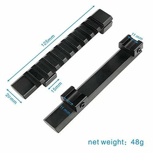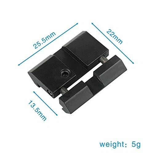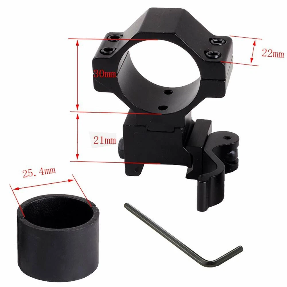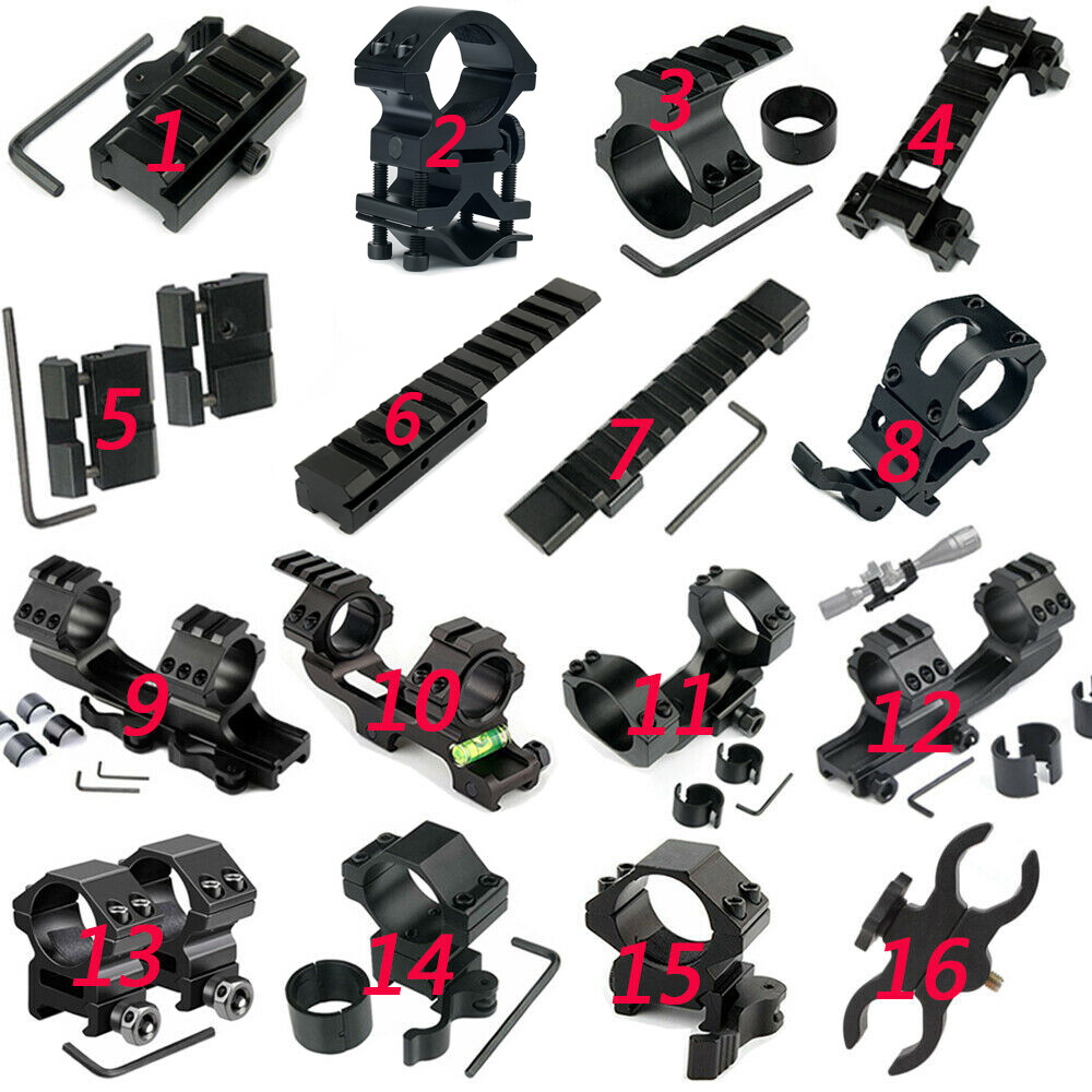 1) 5-Slot Ad apter Detach Riser Scope Mount with Rail: 20mm Rail 5 Groove Extension Track. It Can be Attached to a Mounting Base of 20mm Rail Width. You Can Installation about 15mm Base Increase. Solid all the Metal,a Sense of Security. With a Hex wrench, It Can be Easily Adjusted. - Package: 1x Mount , 1x Hex wrench 2) 1''/25.4mm Scope Mounting Ring Holder for UF-T20/1508/1405 LED Flashlight Torch Size(mm): full-size: 60(L)X40(W)X20(D) Weight(g): 85/95 Ring Diameter: 25.4mm Can be used on smaller scopes/torches with spacer. This Mount is for Mounting Flashlights and Laser Sights with a One Inch Diameter Directly on to the Barrel of device. The Mount Can be Separated Into Two Separate Parts. The Type Ring Mount Can be Used on Any Picatinny Rail Base. The Ring is 1 inch and is Held Together by Four Screws. The Mount has a High Quality Matte Black Finish. The Ring Mount Can be Removed from the Base and Any Other Type Mount Can be Attached to the Base. - Package: 1x Mount 3) 30mm/25.4mm Picatinny Rail Mount: Material: Aluminum alloy. Anodized finish hard-coat. Ring diameter: 25.4 mm (approximately). Length: 45 mm (approximately). Width: 20 mm (approximately). -Package :1x Rail Mount 5) 2xSnap in Rail Adapters Mount: Easily converts 11m Dovetail to 20mm Picatinny rails Dovetail to Picatinny Rail Adaptor Innovative Rail Platform to Convert Most .22/ Rails Top Slot with Spring Tension Retraction/Expansion Design to Snap into Picatinny Base Top rail: 20mm; Bottom rail: 10mm. - Package : 2 x Adapter, 2 x Wrench. 6) 11mm Dovetail to 20mm Picatinny Rail Extension Adapter Scope Mount: Top rail full length:125mm Base picatinny rail width: 11mm Top picatinny rail width:20mm Weight:75g Fits dovetail 11mm rail. Dovetail rail extension. Can be used to conver 11mm to 21mm. Sometime can be see through. -PACKAGE: 1 x D0026-A Picatinny Rail, 1 x Allen Key 7) 10 Slots Scope Riser Rail Mount: 124mm Long Scope Adapter Dovetail Mount. Fit for 11mm Rail. Easy to install. Material: Made of Aluminum Alloy. Top Picatinny Rail Width: 20 mm; Bottom Dovetail Rail Width: 11mm - Package : 1 x 124mm Mount; 1 X Allen Key ( Please check the size before make an order .) 8) 45-Degree 1'' (25.4mm) Ring Mount: Accepts flashlights and red dot sights with 1 inch main tube. Fits 7/8" or Picatinny rails and bases as commonly found on device with accessory rails. Offset design allows easier access to flashlight tail cap button switch. Made of solid aluminum alloy to withstand shock and recoil. Quick detach cam lock installs in seconds. - Package : 1 x Mount 9) 1 inch/30mm Quick Release Dual Ring Scope Mount: Cantilever design. Made of durable aluminum alloy. Quick detachable function for fast installation and detachment. Fits 20mm Picatinny bottom rails, and with 20 mm top ring rail. Comes with 25.4mm reducer inserts so you can use this with 30mm and 25 mm (1 inch) body tube scopes. Built in style rails - very handy fitting flashlights and lasers, etc. -Package: 1 x Allen key , 1 x 30mm Mount, 2 x 25.4mm Adapter Ring 10) Ring 30mm/1"(25.4mm) Mount with Bubble Level: Fits on 20mm dovetail Picatinny rail mounts. With Integrated Anti-cant bubble level to assist in maintaining level shooting platform. Compatible with both 1 inch(25.4mm) and 30mm scopes. With Length 46mm wide 20mm top rail. Manufactured from aircraft grade aluminum alloy. One piece body design for better scope alignment. -Package: 1x Scope Mount 11) 1" 25.4mm to 30mm Ring Heavy Duty Mount: The installation and removal of the mounting ring gasket corresponds to the diameter of the two types of 25.4mm and 30mm tubing. The rail mounting nut is equipped with a lock washer. Installation of the two rings in one piece has become a space-saving installation for easy installation and disassembly. The height is 40 mm from the center of the range of the top surface of the track. -Package : 1 x Mount 12) 1"/30mm Cantilever Forward Reach Ring Mount: 1 inch / 30mm Forward reach 1 Piece Scope Mount One Piece Torch Mount Fits 20mm rails Comes with 25.4mm reducer inserts so you can use this with 30mm and 25 mm (1 inch) body tube scopes. Front Lens Size: Up to 56 mm This figure describes the maximum size of the objective (front) lens. Reach Forward / Backward Design. Clamp Design: Triple Clamp (6 bolts on each cap) Finished in Tactical Matt Black. - Package: 1 x Scope Mount, 2 x 25.4 mm Ring 13) A Pair of 1"/30mm Scope Mount Tool with 20mm Rail: Made of durable aluminum alloy. Fit for 20mm Picatinny Rails Comes with 25.4mm reducer inserts so you can use this with 30mm and 25 mm (1 inch) body tube scopes. - Package: 2 x 30mm Barrel Mount, 2 x 25.4mm Convert Ring, 1 x Wrench 14) 25.4/30mm Quick Detach Scope Mount Ring: High Quality Synthetic Protective Tape Applied on Rings Internal Surface Robust and User Friendly Ergonomic Quick Detach/Lock Lever Fully Adjustable to Fit on Any Picatinny Rail It can be installed to 20mm Standard Rail Extensively Field Tested under Extreme Operations and Well Received by Field Experts and Law Enforcement Personnel Fits all flashlights with 30/25.4mm/1" diameter -Pa ckage: 1 x 30mm Scope Mount,1 x 25.4 mm Convert Ring,1 x Allen key 15) 1" 25.4mm Scope Ring 20mm Rail: Type: Low Profile. Material: High Quality Aluminum. Quick Detachable Design for Fast Installation or Detachment. These scope rings fits on 20mm Picatinny rail. Inner Ring Diameter: 25.4 mm (1"). Rings are for a solid mount. Designed to install a Scopes/Lasers/Flashlight with 1" (25.4mm) diameter onto the Picatinny Rail. -Pac kage : 1 x Quick Release Scope Mount 16) QQ09 Scope Mount Tool : Easy fit scope mount. No tools reqd to quickly fit. Working Universally for Torches / Telescope Sights / Lasers New Mount For Flashlight Torch Telescope Sight Laser Scope Outdoor. Note: Mount is designed for people who want to use their torch off their device or change between device in a hurry. Features a large easily turned knob without the need for any tools. It is approximately 75mm between centers so suit