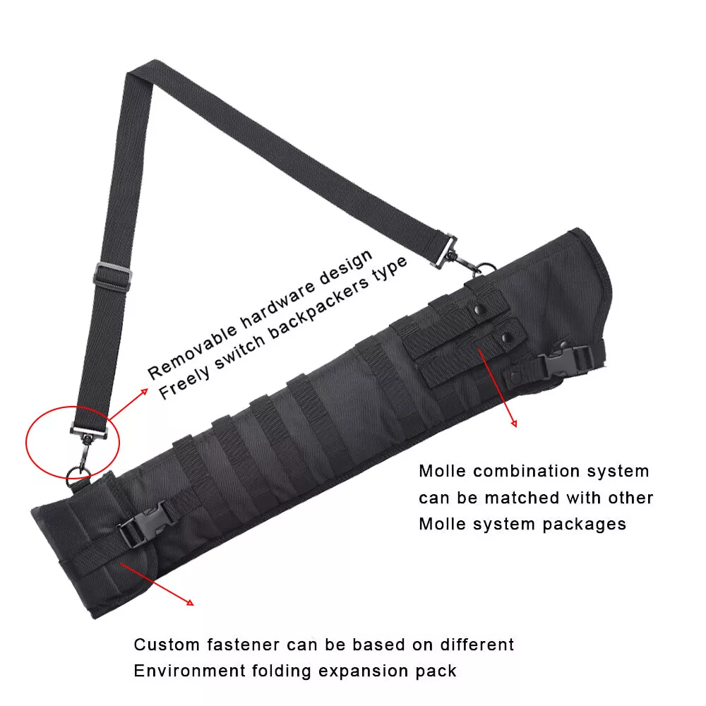 Products Photo Product Description Product Description Product name: Tactical Rifle Scabbard Specification: 34inchx5.9inch Material:600D high strength Oxford cloth Weight:0.4kg The tactical Rifle Scabbard is designed for shoulder carry or modular mounting. Webbing on both side with four detachable PALS straps for ambidextrous usage. Six D-ring locations for attaching the padded shoulder sling to for multiple carry options or preferences. Removable retention strap with quick-release buckle. Padding around the whole scabbard to protect your rifle. Webbing on both side with four detachable PALS straps for ambidextrous usage Six D-ring locations for attaching the padded shoulder sling to for multiple carry options or preferences Removable retention strap with quick-release buckle. Padding around the whole scabbard to protect your rifle Perfect for outdoor war game activities. Product Details Return Policy About Feadback Return Policy 1. Customer satisfaction is our top goal. We believe our items are so outstanding. All products are quality checked. They are new and in good condition when shipped to our customers. We are convinced you will be happy with your Purchase. 2. If product is defective or damage upon arrival, or wrong product shipped, please contact us immediately. Returns accepted within 14 days of delivery date and item must be in original new condition, not worn or altered in any way with attached tags & wrap. Otherwise deal is final. Return shipping must be paid by buyer. 3. Please contact us first if you have any problems/questions/concerns. We will be happy to resolve any issues you may have in a cordial and friendly manner. 4. We appreciate your Postive Feedback, and will do the same in return. DO NOT leave negative feedback without first communication with us. Please allow max 2 business days for us to response. About Feadback When you satisfied with our product and services please leave us positive feedback. If a problem occurs, contact us immediately with any email request. Just contact us using the " Ask the seller a question" link on eBay.