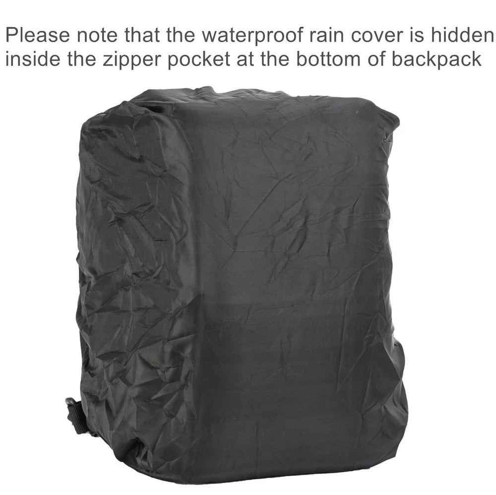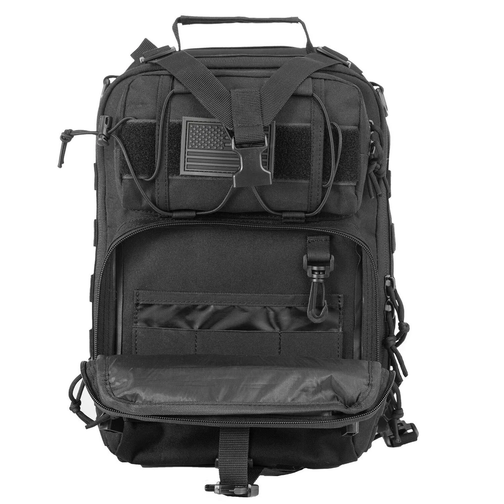 Please note that the waterproof rain cover is hidden inside the zipper pocket at the bottom of the sling bag. Open the zipper pocket on the bottom, you can find the waterproof rain cover. Come with 9 Pcs Accessories -- 1 x Water Bottle Pouch, 1 x USA Flag Patch, 6 x D-Rings Grimlock Locking, 1 x Waterproof Rain Cover. Please pay attention to the waterproof rain cover is hidden inside zipper pocket at the bottom of the backpack.Tactical sling pack with velcro in the concealed back compartment. Awesome as a pistol sling range bag for 1-2 handguns and lots of ammo or as tactical assault pack. Sling pack's size: 14 * 11.5 * 6.5 inch (H*W*D), enough for carrying 13"laptop,iPad, notepad, goggles, book, keys, wallet, cell phone, flashlight, gloves, water bottle, chargers etc on a daily basis. Tactical sling backpack has adjustable and comfortable single shoulder strap, and also has two smaller straps to help reduce the sway of the bag while moving as small military rover shoulder sling backpack.Heavy duty zippers and utility-style cord pulls, front load compression system-Y strap. Comfortable breathable padding back area, molle straps as molle tactical sling pack or edc bag. It's made of durable 600D polyster,water-resistant and durable.