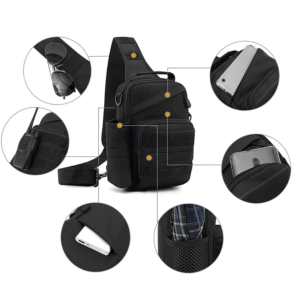 Description This tactical sling chest bag is suitable for all kinds of people. It has 1 main inter bag and 4 auxiliary pockets. The size is 6.69 * 2.75 * 9.84 inch (L * W * H). The external USB port charging design, free your hands Because of the large capacity, so you can put your iPad mini , cell phone and some daily necessities stuffs. MOLLE system bag can use it flexibly. It is a good choice for your travel or outdoor activities or daily use bag. Package: 1 x Tactical Chest Sling Bag If you have any problems, please contact us, we will try our best to help you. Tip: This item is a small bag, please pay attention to the size before purchase The tactical sling backpack is constructed by the high quality 600D oxford nylon material and SBS zipper, which is wear-resistant .Main bag size: 6.69 * 2.75 * 9.84 inch (L * w * h), weight: 380g, light and small, easy to carry The external USB port charging design, free your hands, can charge your mobile phone at anytime and anywhere. The tactical small sling bag includes 1 main inter bag and 4 auxiliary pockets. The main inter pocket can hold your iPad mini, Kindle and other large items. The extra front pocket can hold cell phones, napkins, headphones, keys, charging cables and other small things. The remaining two hidden pockets can be put into valuables, which are not easy to lose. The side mesh can be used for flashlight, water bottle, paper, etc. The tactical sling bag is equipped with an external MOLLE system, you can easily load other devices according to your requirements. Suitable for hiking, running, cycling, walking, camping, mountaineering, fishing, hiking, tourism, horse riding, cycling and other sports activities.