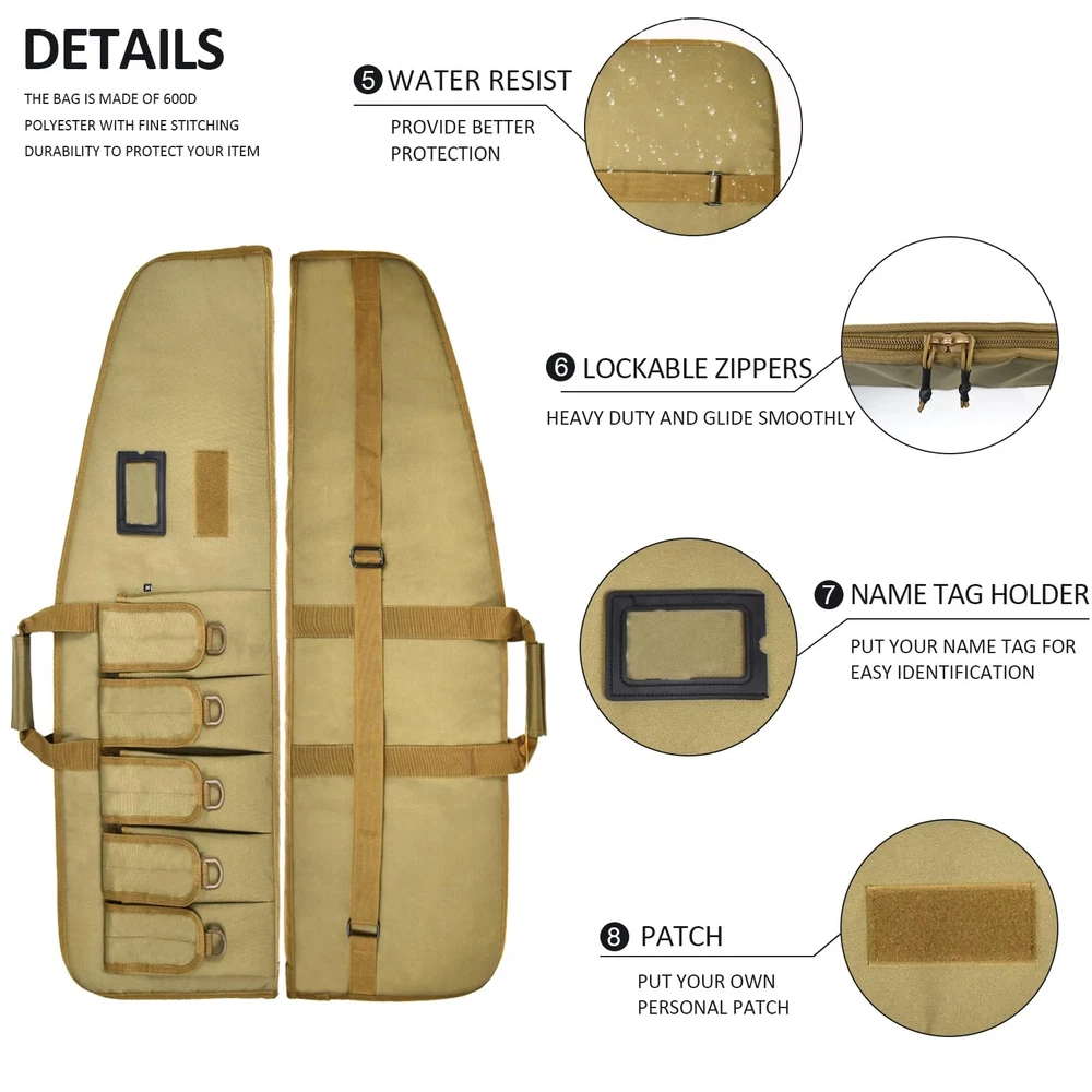 bag is available in two sizes: Medium case is 38"x12" outside; Large case is 42" x 12" outside. The bag with 5 pouches and adjustble shoulder sling. Case is made of 600D tough material. I believe that we will be satisfied with this bag. We are a professional OEM outdoor bag factory. Our quality is guaranteed. LARGE SIZE: Size of soft case--38" can Fits Up To 35" PADDED SOFT GUN BAG: Double zippers which can easy to slide the zippers strong and sturdy (Luggage lock NOT INCLUDED) POLYESTER: Heavy duty 600D polyester which have 5 pouches, D-Ring for hanging GUN BAG DETAIL: Includes a 1.5" reinforced one-piece wrap-around carry handle, and a 1.5" adjustable shoulder sling sewn to the case; Tough back support for Long lasting wear CUSTOMER SERVICE: If you have any questions, please feel free to tell us