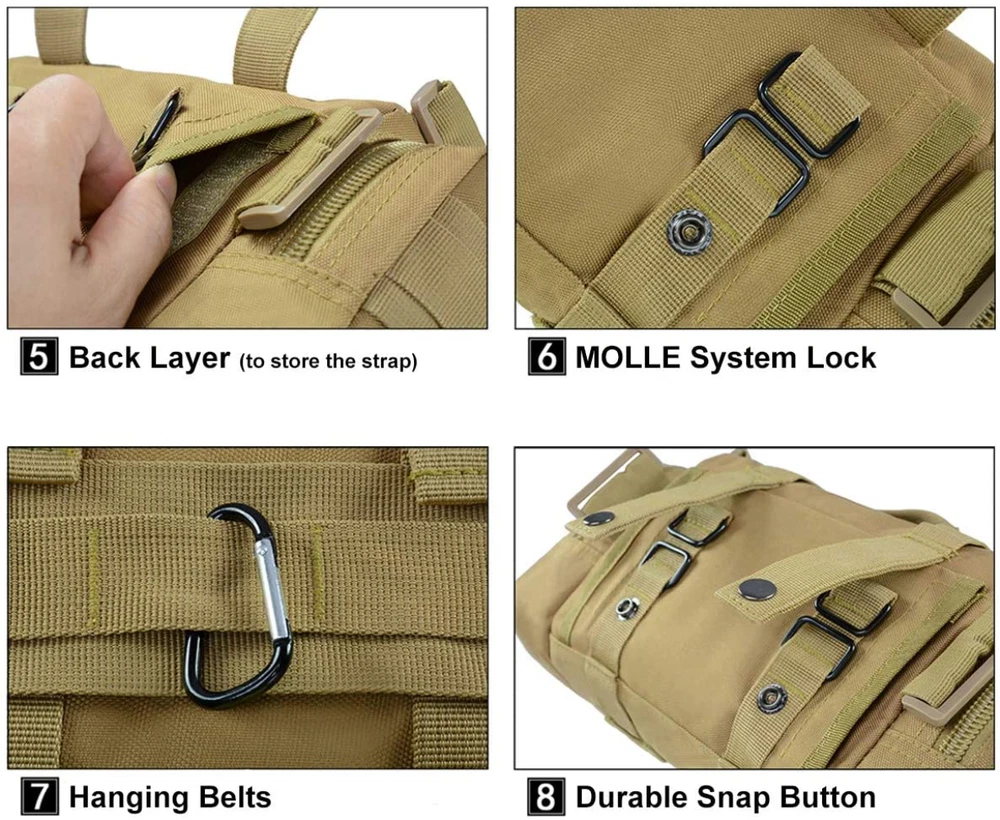 Product Description: Features: 1. Size: 13.8" x 7" x 5.5". Multi-purpose Bike Handlebar Bag - OUTDOORS multi-purpose handlebar bag with adjustable strap can also be used as bike top tube bag, shoulder bag, waist bag and messenger bag. Hang it on handlebar as sixth image shows please. Appropriate size fits for most people. 2. 900D Army Grade and Water Resistant Materials - Made of real 900x600D high-density military nylon oxford and inner PU water resistant layer, so this heavy-duty pack is scratch resistant, anti-abrasive, colorfast, rust resistant, and it is reinforced at all stress points. 3. Handy Construction Design - This EDC bag has one mian zippered pocket with inside mesh pocket which can hold a beer bottle or iPad mini; One front zippered pocket and two side zippered pockets for carrying little items or gadgets like keychain, small GPS device, medical supplies, small tools, etc. Can meet most of your daily outdoor storage needs. 4. Bag with MOLLE System - This expandable bag has MOLLE attachments on its back, and allow you to attach it to Duty Utility Belt, Admin Bag, backpacks, PALS Vest or any MOLLE compatible gears. It has some MOLLE webbing belts on front and two sides for loading extra small MOLLE pouches or hanging gadgets like pens, sunglasses, flashlight, interphone. 5. Suitable for Many Outdoor Activities - This portable handlebar bag has multiple pockets and can keeps your outdoor gears and gadgets organized and easy-reaching. Besides cycling and motorcycling, it is also suitable for your outdoor leisure, casual hanging out, hiking, trekking, hunting, fishing and other outdoor activities. Great gift for outdoor enthusiasts. Package Included: 1x Waist Bag Notice: 1. Please allow 2-3% error due to manual measurement. 2. The colors may have different as the difference display, please understand. Contact US: Your satisfaction is our highest priority. Please contact us if you have any questions or requests about our products or service. We are always glad to assist you and stand by our products.