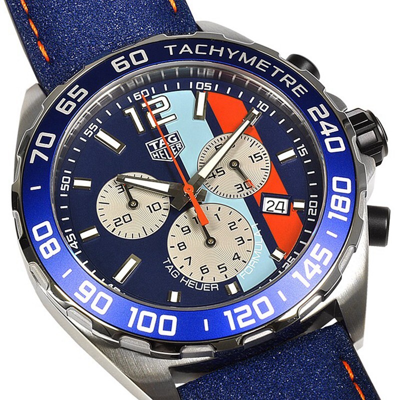 The roll-out of TAG Heuer’s Gulf-branded watches continues, with the 2018 Gulf Special Edition Formula 1 following hot on the heels of the two Monaco Gulf watches launched earlier this year. Like the Monaco duo, the watch carries the famous blue and orange colours of Gulf Oil, whose iconic livery was worn by the Le Mans winning Porsches of the late 1960s/ early 1970s, including the Porsche 917 driven by fictional driver Michael Delaney (Steve McQueen) in the 1971 movie Le Mans . Gulf Oil of 2018 is very different to the major oil company founded in 1901, which met its demise in the 1980s when it was forced to merge with Standard Oil of California, with the new entity being named Chevron. In the US, the Gulf brand today rests with Gulf Oil Limited Partnership (owned by private equity firm ArcLight Capital Partners) and operates petrol stations across the US. Internationally, the Gulf brand is owned by Gulf Oil International (itself owned by Hinduja Group), which is operates petrol stations in Europe, South America and Indonesia and an oil trading business. TAG Heuer’s agreement to use the Gulf brand is with Gulf Oil International, with presumably a second agreement with Gulf Oil LP to allow the branding to be used in the US. The complexity behind the ownership of the Gulf brand is the reasons Gulf branded watches in the past have been launched in the US on a different timetable to other markets. The 2018 Gulf F1 uses a 43mm stainless steel case, the standard case offered across the Formula 1 Chronograph range. The case has a notched steel bezel with a lovely blue aluminium insert and a titanium-carbide coated crown and chronograph pushers. The key element that sets the Gulf edition watch apart from other models is of course the dial, which starts with a dark blue base before adding the two Gulf stripes- light blue and orange. The off-centre stripes are the same design as McQueen’s racing suit in Le Mans and the same featured on the 2018 Gulf Monaco and other Gulf-branded watches. The same orange is used for the central chronograph hand, as well as the tips on the three lacquered sub-dial hands. We’re not a huge fan of the coloured tips used on several TAG Heuer sub-dial hands -we’d rather see a solid colour used, in this case the simple black rather than to go to full orange hands. The other key details on the dial are the minuterie flange, with 5 minute increments, and the standard rectangular hour indices, which have white SuperLuminova, as does the over-size “12” at the top of the dial. Overall, it’s a great looking dial. The Formula 1 series should be about bright bold colours, and that’s exactly what you get on the F1 Gulf. As much as we like the colours and dial design, it’s hard not to agree with TAG Heuer that the final “blue” offered on the production watch is an improvement, being much closer to the true Gulf Blue. Complementing the bespoke dial design is a fantastic new strap, reference FC8243. The strap is made from calfskin and has an unusual “asphalt” texture effect. On the inside of the strap is an orange rubber lining, with matching orange stitching. Whoever is designing TAG Heuer’s straps over the last few years deserves special praise for continuing to develop innovative, special designs. It wasn’t that long ago that every TAG Heuer model used the same 3-4 leather straps, but now it seems as though each Special Edition gains a bespoke strap, which we love. Turn the watch over and you’ll see the standard Formula 1 caseback- with the exception of the Gulf logo. And behind the caseback is the Ronda 5040D quartz chronograph movement the same reliable movement offered across all F1 Chronographs. Watch Information Brand, Seller, or Collection Name TAG Heuer Model number CAZ101N.FC8243 Part Number CAZ101N.FC8243 Item Shape Round Dial window material type Scratch Resistant Sapphire Display Type Analog Clasp Tang Buckle Case material Stainless Steel Case diameter 43 millimeters Band Material Leather Band width 43 millimeters Band Color Blue Dial color Blue Bezel material Aluminum Calendar Date Special features Chronograph, Screw down crown, Luminescent Hands, Swiss Made Movement Swiss Quartz Water resistant depth 200 Meters Additional Information Warranty 2 Year Warranty by us Package Include: 1.Includes all original packaging shown including inner and outer box, hang tag, instruction book, Gulf booklet. 2. Watch is Registered w Tag Heuer online serial# registration system! Manufacturer warranty is expired! On May 29, 2025 at 01:46:50 PDT, seller added the following information:
