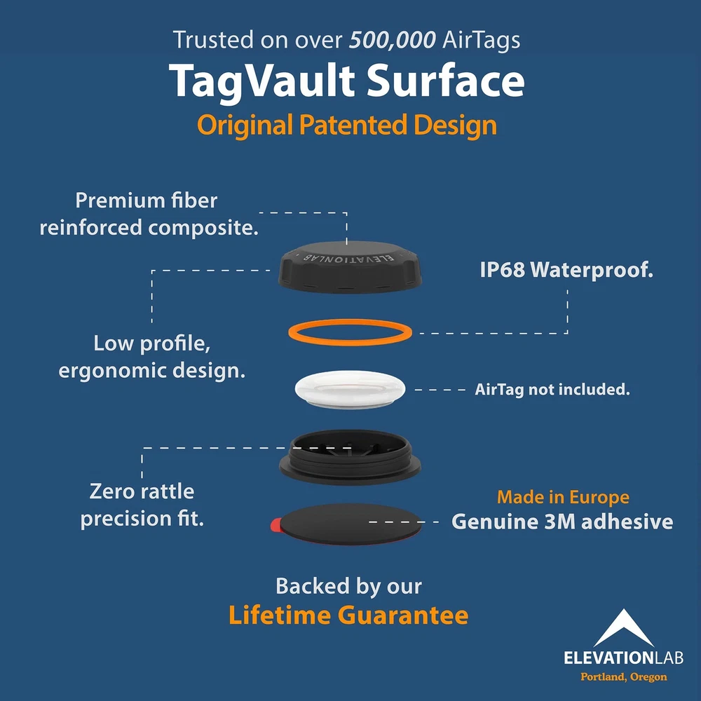 TagVault™ Surface AirTag Adhesive Mount - The Original Waterproof AirTag Stick-On Holder | 3M VHB, Ultra-Durable, Screw-On Design, Find Your Bike, Car, Skis, & More The indestructible AirTag surface mount. Installs in seconds with premium 3M VHB adhesive. Holds extremely strong to clean & flat surfaces (alcohol pad included). Warm with hair dryer to remove. IP68 Waterproof. Discreet & minimal design. Top easily screws on and off like a contact lens case. Patented design. Great for: skis & snowboards, trailers, watercraft, power tools, construction equipment, bikes, bike racks, camping stuff, camera gear cases, etc. Patented. Shipping We offer FREE shipping on all orders! We ship within Three business days of payment, usually sooner. We use a selection of shipping services such as UPS, FedEx, USPS etc. We only ship to the lower 48 states, no APO/FPO addresses or PO Boxes allowed. Local pickups and combined shipping options are not provided at this time. Return You can return a product for up to 30 days from the date you purchased it. Any product you return must be in the same condition you received it and in the original packaging. Please keep the receipt. Payment We accept payment by any of the following methods: PayPal Please pay as soon as possible after winning an auction, as that will allow us to post your item to you sooner! Feedback Customer satisfaction is very important to us. If you have any problem with your order, please contact us and we will do our best to make you satisfied. Contact Us If you have any queries, please contact us via ebay. We usually respond within 24 hours on weekdays. Please visit our eBay store to check out other items for sale! Thank you for shopping at our store.