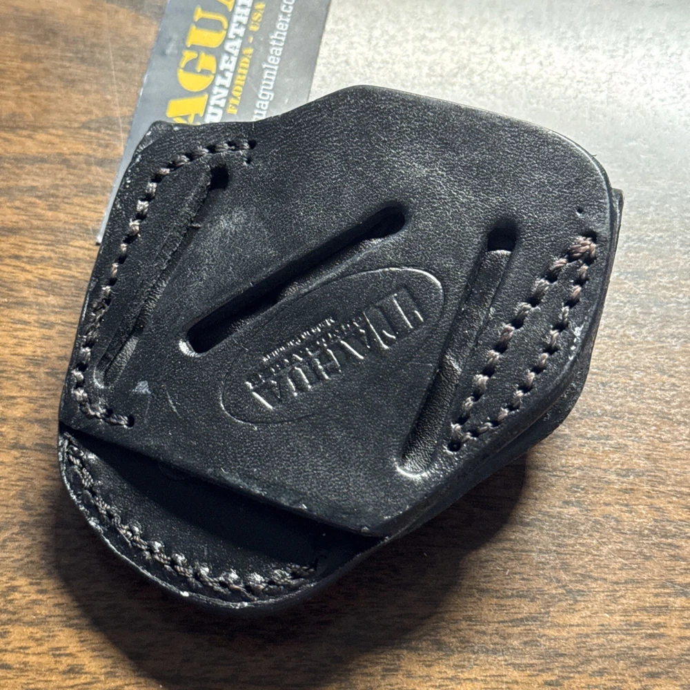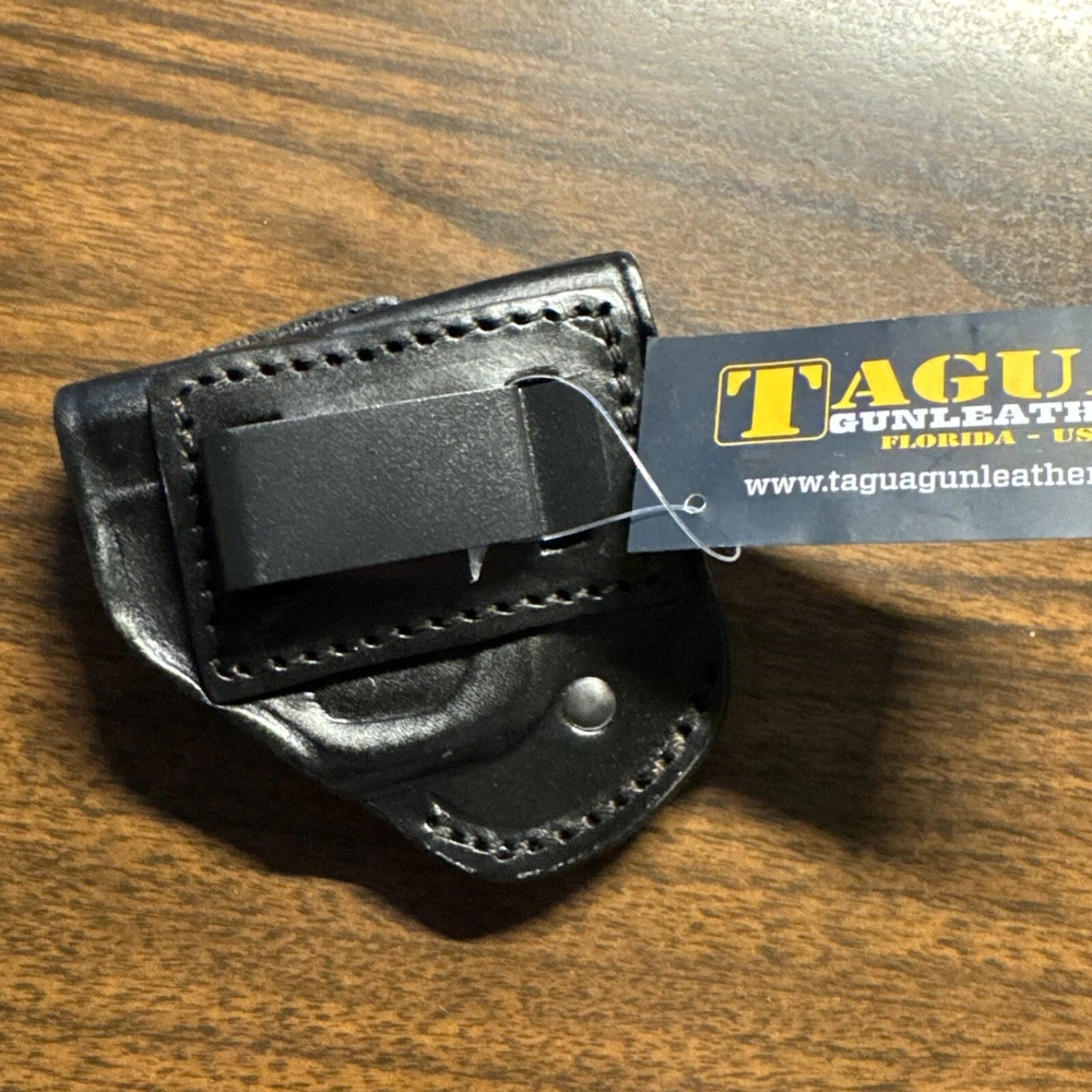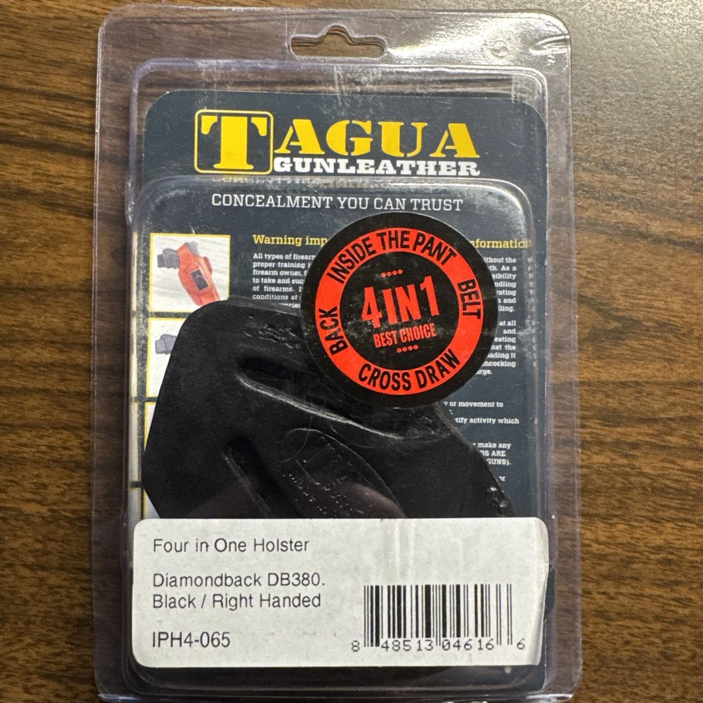 The Tagua Four in One Holster is designed for the Diamondback DB380 pistol, made of black leather for a right-handed shooter. This versatile holster can be carried in multiple positions such as small of the back, Cross Draw, on the belt (OWB), or inside the waistband (IWB). It features a clip and belt attachment for secure carrying, as well as being lightweight, weather-resistant, and multifunctional. Made in Paraguay, this holster is suitable for shooting activities.
