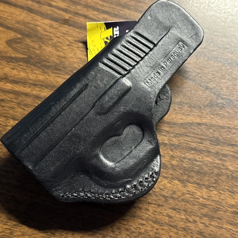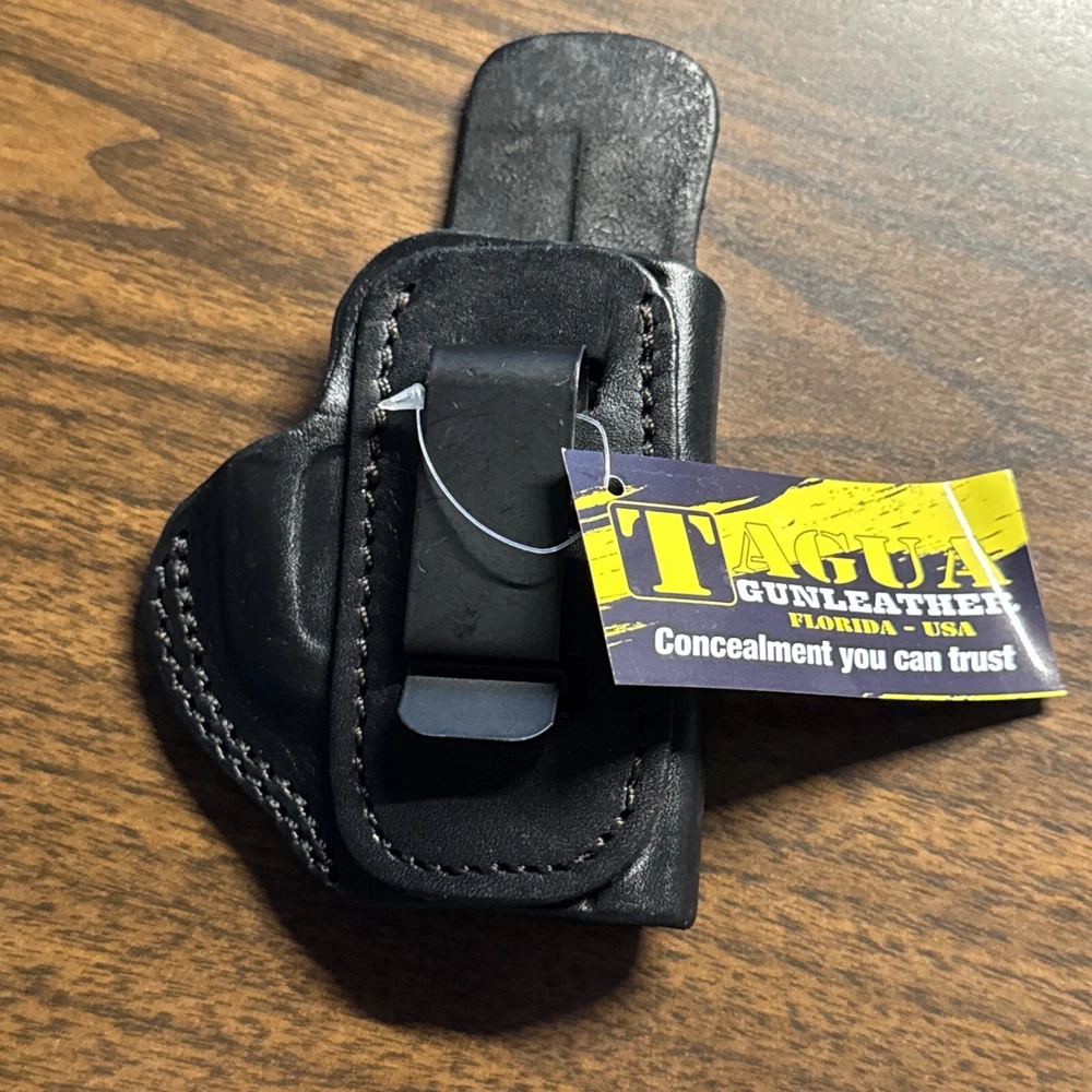 The Tagua Inside The Pants Holster is designed for the Diamondback DB38 pistol in .380 ACP caliber. Made of black leather, this right-handed concealment holster is lightweight, weather-resistant, and water-resistant. It features a clip attachment for secure belt placement and is suitable for carrying inside the waistband at various positions such as 2 o'Clock, 3 o'Clock, 4 o'Clock, or 5 o'Clock. This Paraguay-manufactured holster is ideal for shooting sports activities.