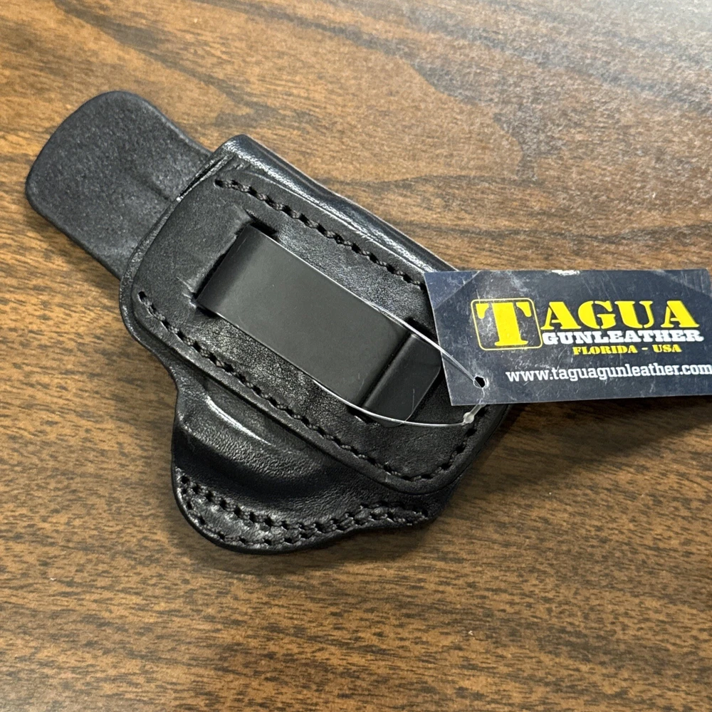 The Tagua Inside The Pants Holster is designed for the Kahr Arms P380 pistol, made of black leather for right-handed shooters. This concealment holster is specifically crafted for inside the waistband (IWB) carry at the 3 o'clock, 4 o'clock, 2 o'clock, or 5 o'clock positions. It features a clip attachment for secure placement and is lightweight, weather-resistant, and water-resistant, making it suitable for shooting activities. This model is manufactured in Paraguay by Tagua and offers level 1 retention for easy access to your firearm during use.