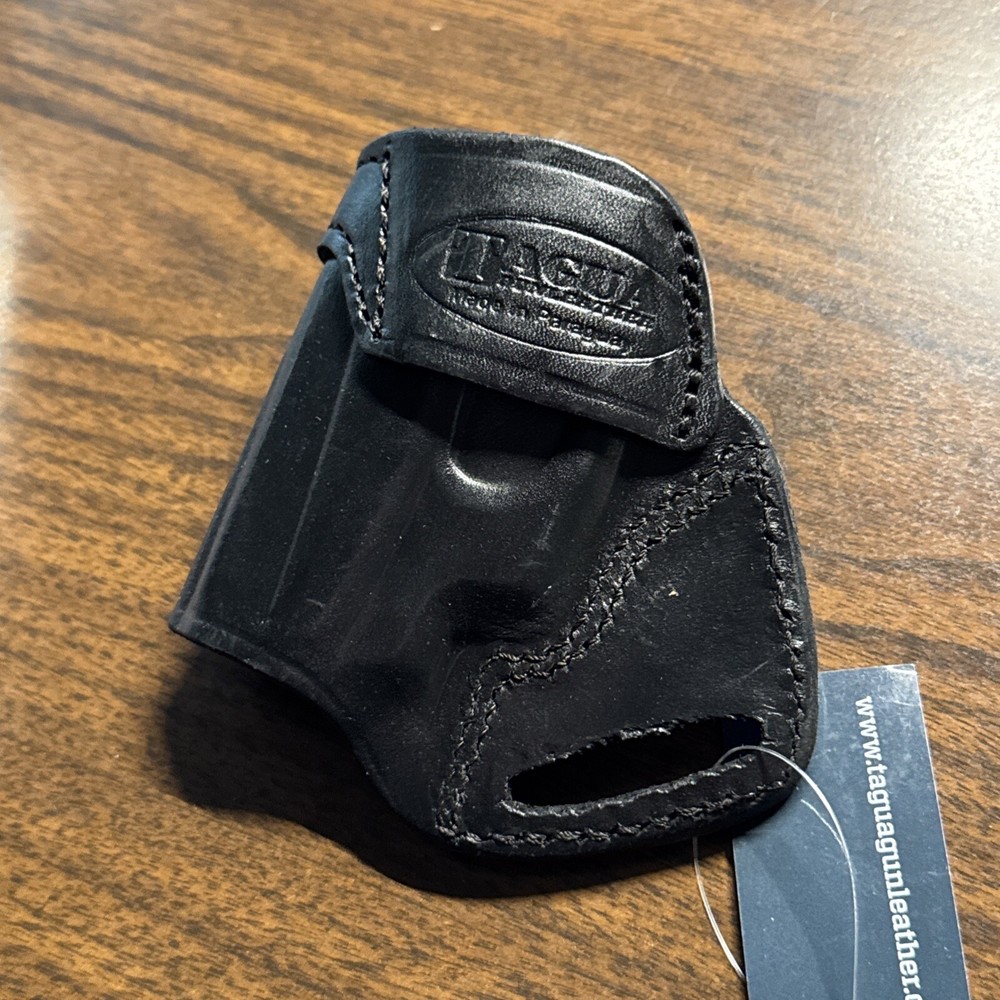 The Tagua Middle of the Back Holster is designed for the Ruger LCP 380 pistol with a laser attachment, offering ambidextrous use. Made of lightweight and weather-resistant leather, this OWB holster is specifically crafted for concealed carry at the 6 o'clock position on the belt. It features a Level 1 retention system and is handcrafted in Paraguay for durability and quality assurance, making it suitable for shooting sports and everyday carry. *****NEW OLD STOCK*****