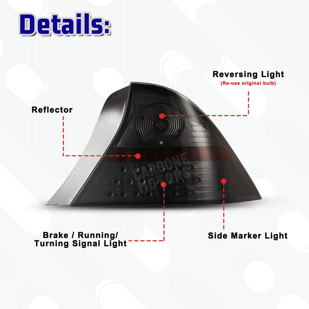 Taillights LED For 01-03 Honda Civic Coupe Black/Smoke Turn Signal Brake Lights 🔔 Black Housing & Clear Lens: Click here Specification Reverse Light Bulb : Not included (backup lights use the stock bulbs or the original lights of car) Brake Light Bulb : LED Turn Signal Light Bulb : LED Parking Light Bulb : LED Wiring Harness : Not included (Plug and Play) Certification : DOT/SAE Color Finish : Black housing / Smoke lens Replace Original (OE) Part # : L: 33551S5PA01; R: 33501S5PA01 Partslink: L: HO2800134; R: HO2801134 Fitment For 2001-2003 Honda Civic 2 Door Coupe NOT Compatible with Hatchback & Sedan Models Package Includes 1 Pair of LED Taillights (Left and Right Side) Payment Delivery details Terms of sales About us Contact us Payment We ACCEPT PAYPAL, CREDIT CARD, APPLE PAY & GOOGLE PAY etc. Delivery details We normally despatch your order within 1-3 working day upon cleared payment. Please double confirm your address and contact information and ensure that it's available for you to receive your package. We'll ship out your item for free shipping within 48 states . Also, please noted that we do not offer local pick up service . NOTE: buyers who purchase international products need to pay import tariffs !!! Terms of sales 60 days return service is provided. If you do not satisfy with our items, please return back to us within 60 days in its original condition, then we'll issue the full refund to you ASAP. **If you received an incorrect, damaged, defective, or item not as described, or not satisfied with the product, contact us for a partial/full refund or replacement on our cost. ** Professional installation is highly recommended About us Wolfx_Offroad is a direct factory sale from manufacturer of auto parts with well-equipped testing equipment and strong technical force. We are selling headlights, tail lights, fog lights and more auto parts . Follow us and get your favourite item! Contact us Any questions or problems about our products, please do not hesitate to contact us by eBay message or click the " Contact Seller " on the right side of the product's interface. We'll reply you as soon as we can. If you are satisfied with our service and product, please kindly leave a positive feedback .