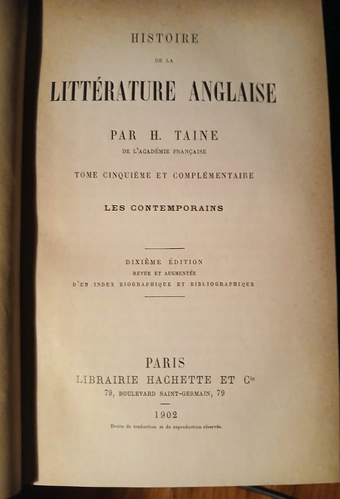 The product is a rare and collectible hardcover book titled "Taine Hostoire De La Litterature Anglaise" published by Librairie Hachette et C in 1902. The book is written in French and is a valuable addition to any antique or collectible book collection. With its historical significance and unique language, this book offers a glimpse into the literary landscape of the early 20th century, making it a sought-after item for book enthusiasts and collectors alike.