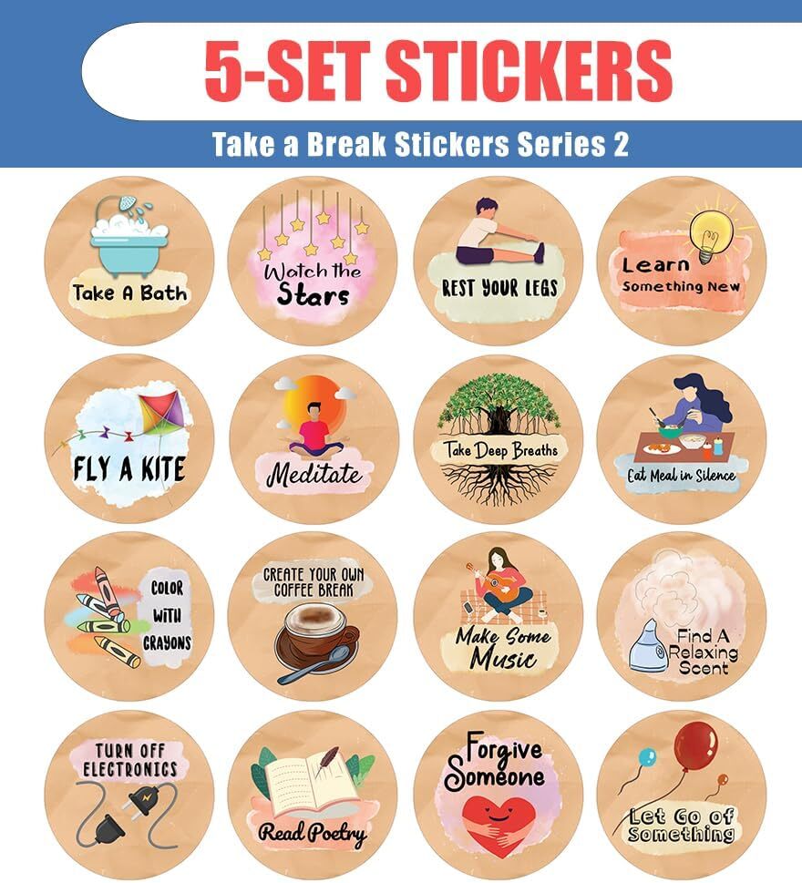 16 UNIQUE DESIGNS INSPIRING STICKERS FOR YOUR DIY PERSONALIZED DECORATIONS - Creanoso Take a Break Series 2 Stickers (5-Sheets). These colorful and uniquely inspiring round shaped stickers are the best tool for DIY decoration and personalization of your belongings. GREAT STOCKING STUFFERS , TEACHING SUPPLEMENTARY MATERIALS, AND GIVEAWAY - Great stocking stuffers gifts for Boys, Girls, Teens, Kids. A perfect design to give during classroom school activities, home schooling,birthdays, anniversaries, family day, and any other special occasions. MADE WITH DURABLE AND WATERPROOF MATERIALS - There is a lamination or coating to make the stickers high water resistant, and WILL NOT fade from the water. The stickers can stick it anywhere you like, and it sticks there and lasts a long time. A COLORFUL AND DECOR STICKER DECAL - Each sheet with 16 individual round stickers. There are 5 sheets , with a total of 80 pcs of stickers. STICKER SIZE: 1.5 INCHES IN DIAMETER Take a Break Stickers Series 2 (5 Sets X 16 Designs) COLORFUL AND COLLECTION OF TEXT STICKERS • Well designed. • Very encouraging. • Self-adhesive. Take a Break Stickers Series 2 (5 Sets X 16 Designs) are super fun to collect; you can't have just one! That's why you will find a selection of stickers right here. Each package comes with different stickers in a variety of designs. Stick them here, stick them there, stick them everywhere! Everyone will love these self-adhesive stickers. These colorful stickers are perfect for any adults and these come with very inspiring messages and bright pictures. A fun, inexpensive way to add a decorative, notes, and stationery. Delight yourself with uplifting messages designs that are very encouraging. Take a Break Stickers Series 2 (5 Sets X 16 Designs) perfect for giveaways, behavior incentives, prizes! These stickers are acid-free, nontoxic, and safe for use on photos. This product comes with a 60 days money back guarantee. You can return them to us for a full refund.