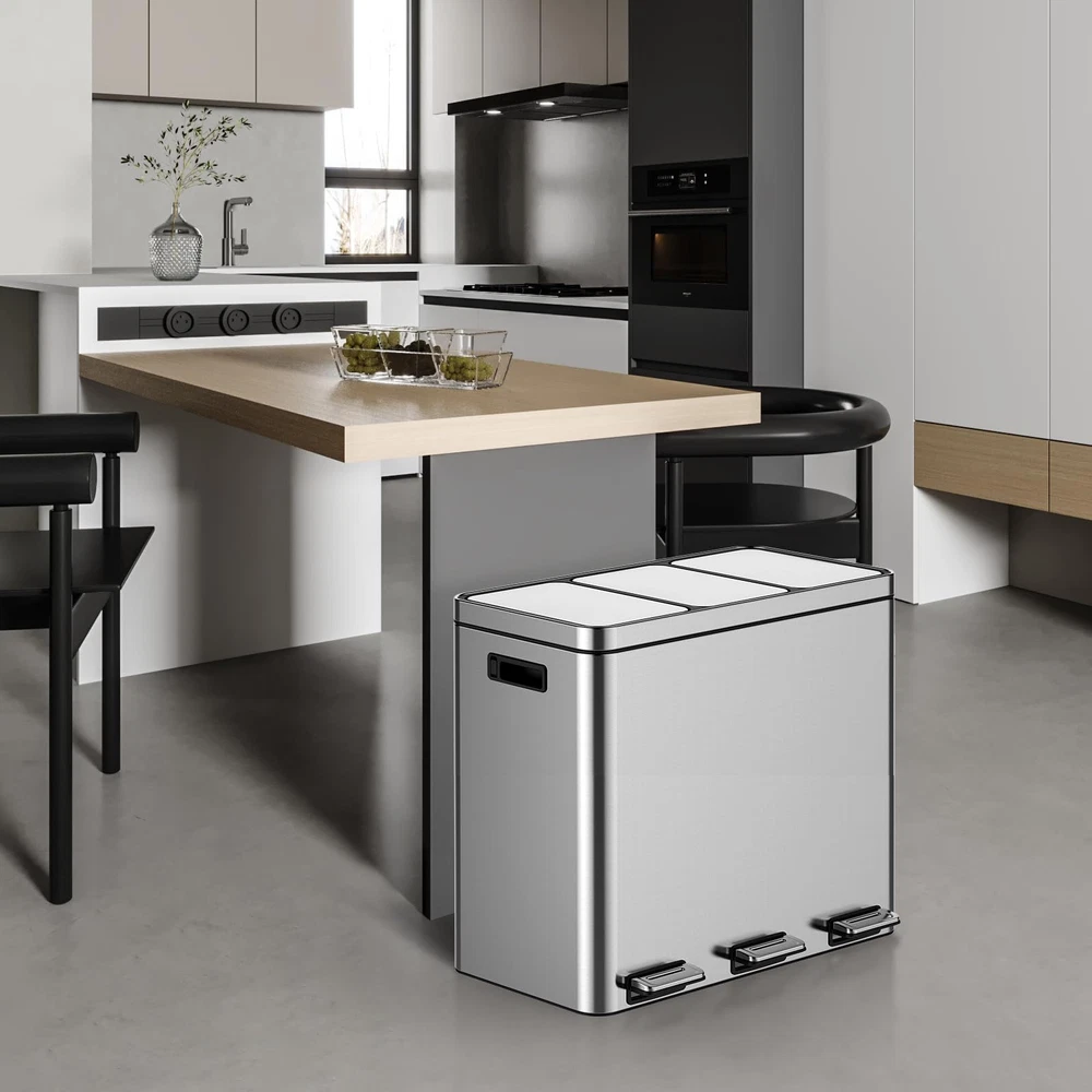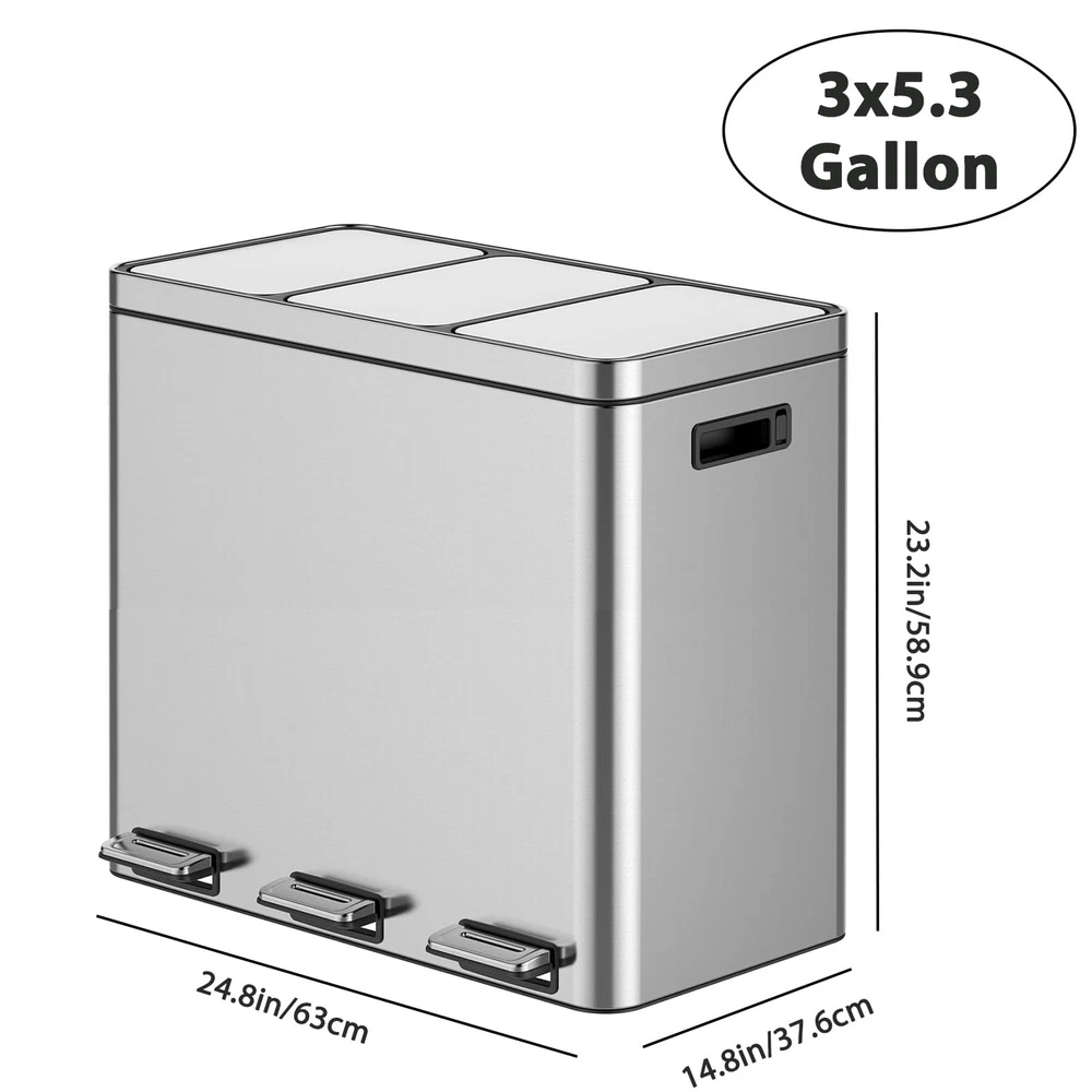 Feature: The trash can, crafted from high-quality stainless steel, offers a modern and sophisticated appearance while being practical for daily use. Featuring separate compartments, users can conveniently sort different types of waste, facilitating efficient recycling and disposal. Additionally, the soft-close lid feature of the garbage can ensures there is no loud slamming noise when the lid is closed adding a touch of convenience and consideration for a peaceful environment. The foot pedal allows for hands-free lid opening, promoting a hygienic waste disposal process. Additionally, the recycling bin's removable bucket with carrying handles enables easy removal for emptying or replacing garbage bags. These combined features provide a functional, long-lived, and hygienic waste disposal and recycling solution for homes or offices, offering convenience and organization in waste management practices. Specification: Material: Stainless steel and plastic Capacity: 16 gallon(60L) / 3×5.2 gallon(20L) Packing list: 1 trash can with inner wastebasket (including instruction) Note: Before making a purchase, consider factors like height, width, depth and capacity to ensure the size of the item you are considering fits your need. Ample Capacity: Dimension: With a total capacity of 15.9 gallon (60 L), this trash can provides ample space for both trash and recycling including 3×5.3 gallon (20 L) interior plastic liner bins, allowing for efficient waste storage and disposal. Solid and Long-lived: Crafted from stainless steel, this rubbish bin effectively solves the problem of rust, making the garbage can long-lived. By using slow down technology can reduce trash can damage, ensuring that there is no loud slamming noise when closing. Odor-Sealing Design: Designed with an odor-sealing ensuring the lid securely seals around the rim, preventing the odors escape from the trash can, effectively minimizing odor leakage and maintains a more hygienic environment. Hands-Free Opening: The kitchen trash can features a solid foot pedal allowing you to open the lid easily without the need to bend down, also reducing the need for contact with the lid, providing you with a more hygienic way to dispose of rubbish. Removable Bucket Liner: The recycling bin features a removable bucket liner with a carrying handle on each inner bucket, allowing for easy removal of the inner bucket by simply pulling it out, making it convenient for emptying or replacing the garbage bag.