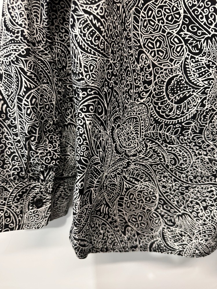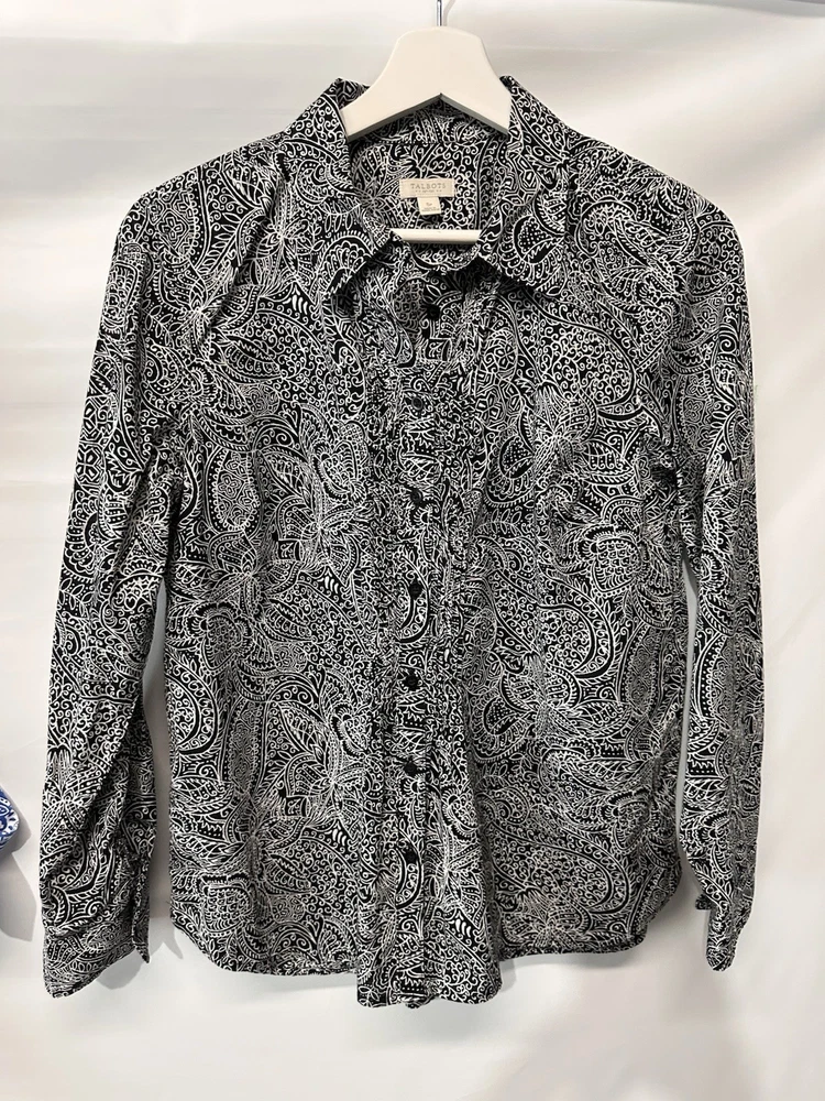 This Talbots black and white paisley blouse is a stylish and versatile top for women. Made from 100% cotton with a woven fabric type, it features a collared neckline and button front closure. With long sleeves and a regular fit, it is suitable for casual and business occasions, making it a great addition to any wardrobe. The breathable and lightweight design of this blouse makes it perfect for all seasons, providing comfort and style for the winter, summer, fall, and spring.