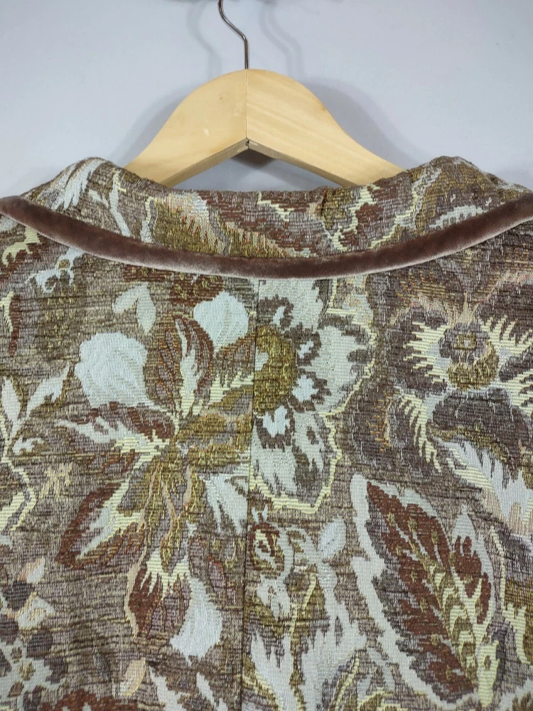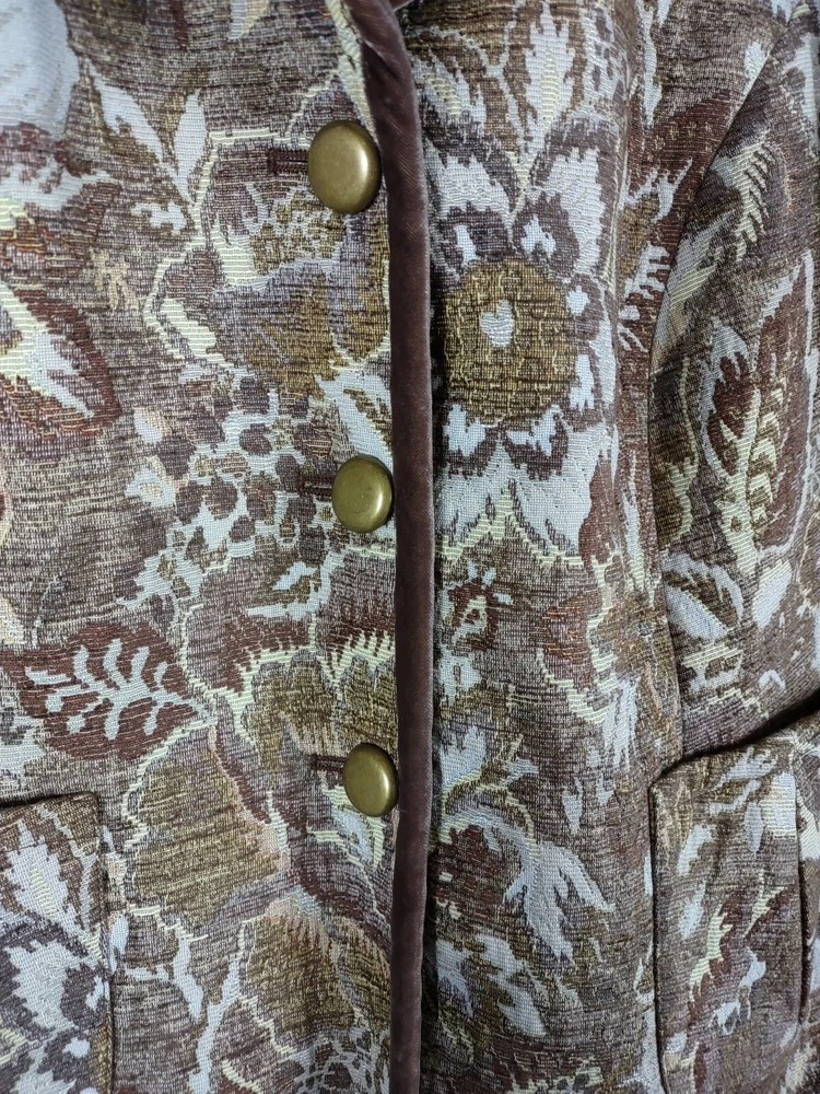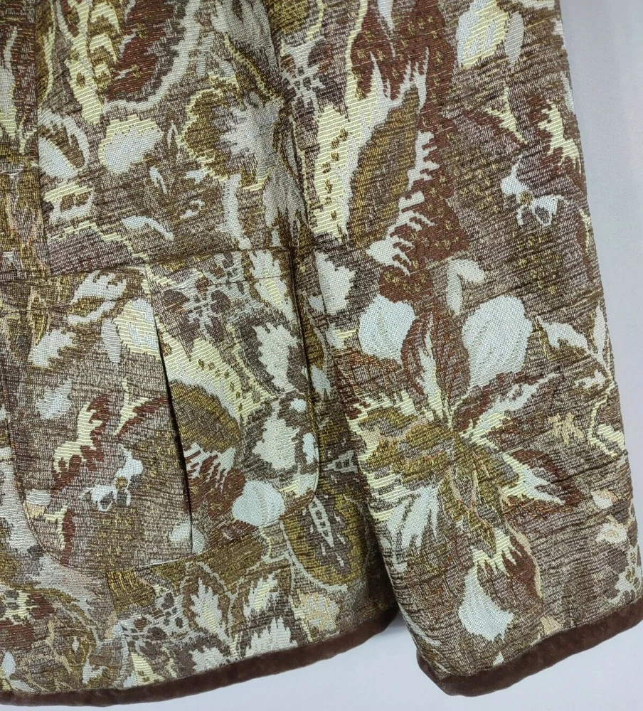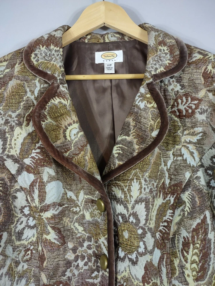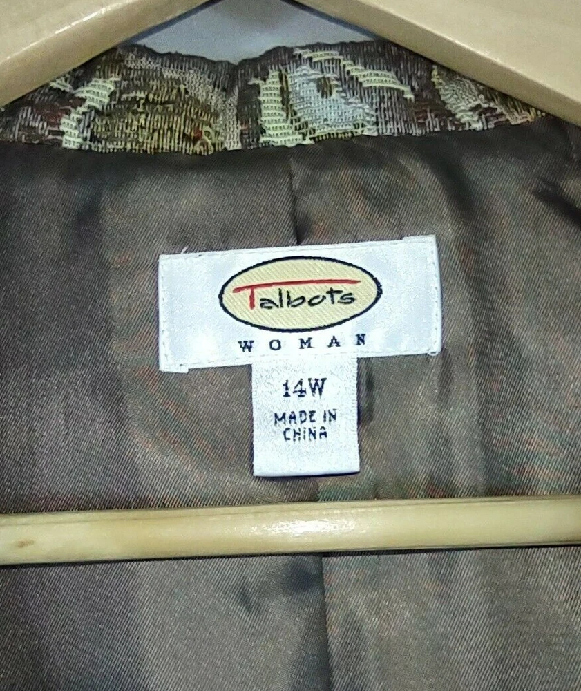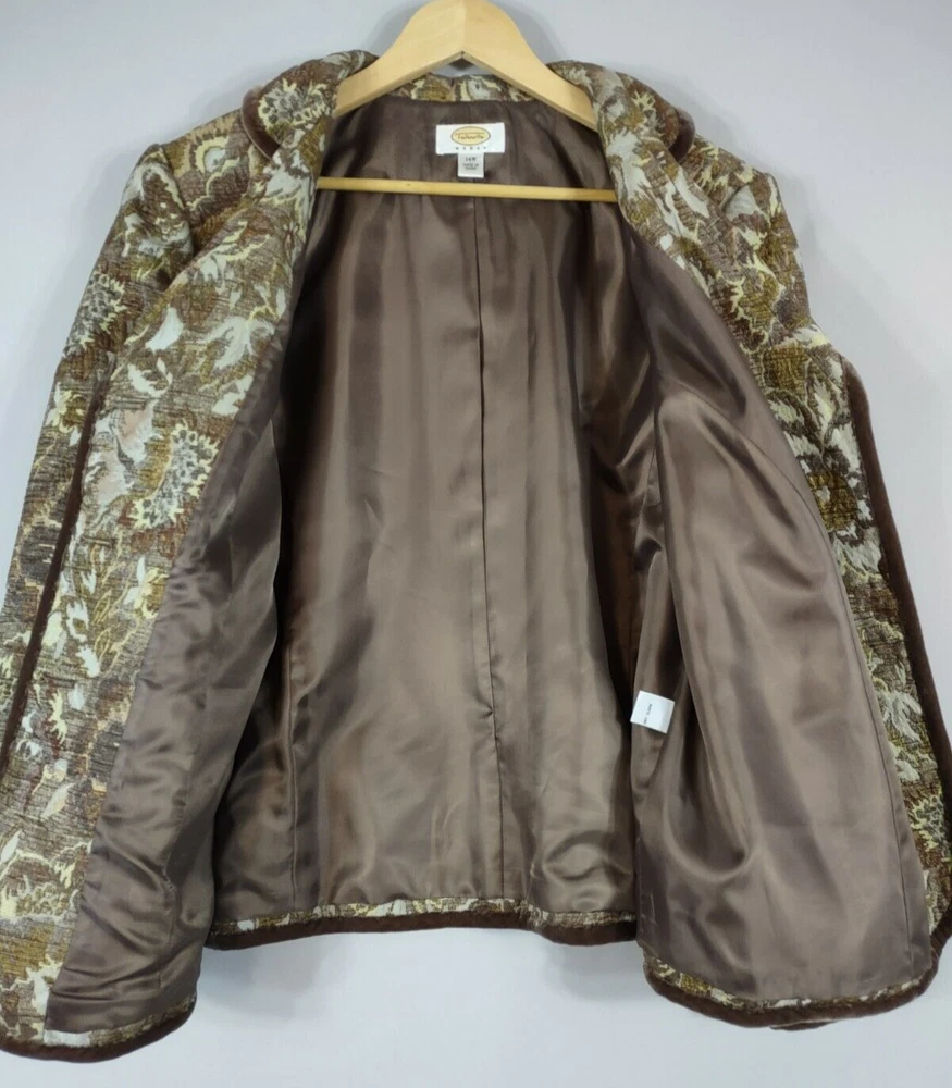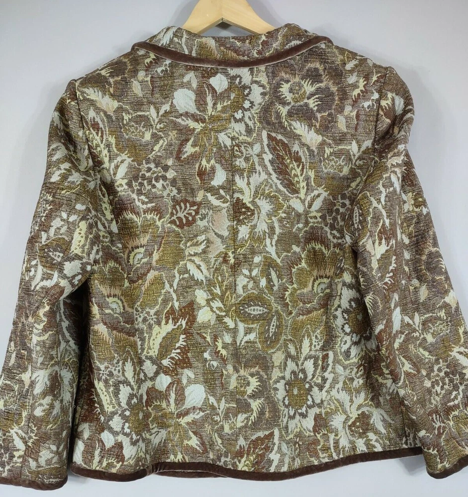 Talbots Jacket Women 14 Brown Jaquard Tapestry Velvet Trim Lined Short Button Up Long Sleeve Collar Looks great with jeans 28" Length back of neck to hem 23" Underarm to underarm 24" Sleeve length shoulder to cuff. CONDITION: Excellent pre-owned condition. Never worn. View gallery to see item and condition. RETURNS accepted; item must be returned within 30 days in original condition to receive a full refund. SHIPPING & HANDLING: We ship all packages within five business days from Monday through Friday except Holidays. Consolidated shipping is available upon request. Thank you for helping our planet and buying previously owned and loved items. I am grateful for your business. Enjoy! Check out our store and follow us on eBay. There are new listings daily! 10BB-4452 Disclaimer: While we make every effort to capture the most accurate depiction of every item when photographing, colors may vary from screen display to in person therefore we cannot guarantee "exact shade" on any item. Message us if you have questions.