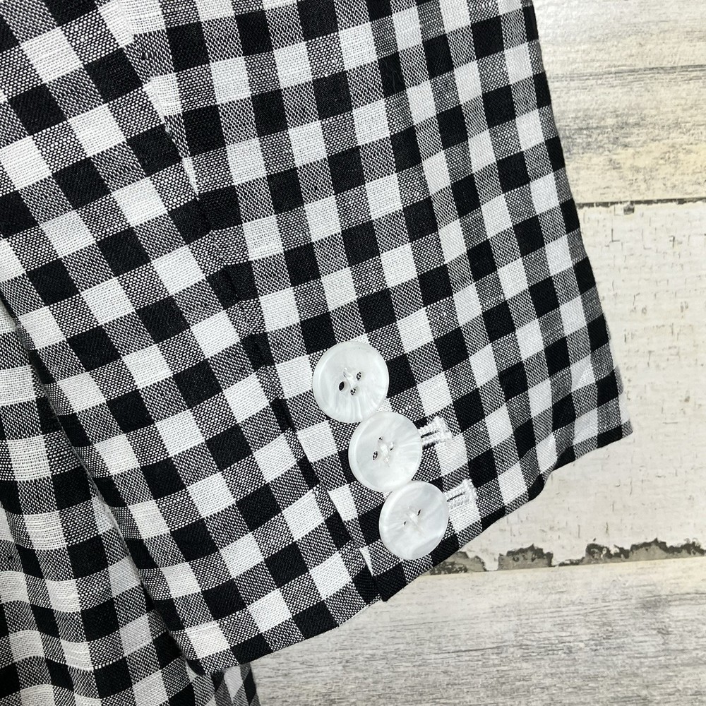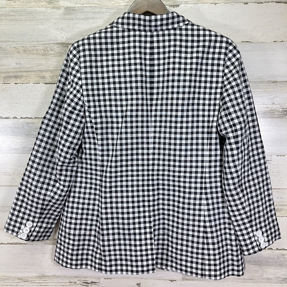 Measurements: Pit to Pit = 20 " Sleeve = 27" Length =22.5 " Add a touch of sophistication to your wardrobe with the Talbots Women's Black & White Checked Plaid Blazer. Crafted from a comfortable and durable linen blend, this mid-length jacket features a classic check pattern that effortlessly pairs with both casual and formal attire. Designed with practicality in mind, the blazer comes equipped with pockets for your essentials and is fully lined for an extra layer of comfort. The blazer's long sleeves, button closure, and regular fit size 12 ensure a flattering silhouette that complements your personal style. The white and black plaid design exudes a timeless charm, while the polyester lining maintains the jacket's shape and structure. To keep this piece looking its best, dry cleaning is recommended. Proudly made in Vietnam, this blazer is a versatile addition to any fashion-forward wardrobe.