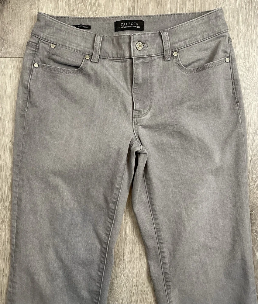 Talbots Flawless Five Pocket Boyfriend Jeans in a beautiful gray color size 2. Made with a blend of polyester, spandex, rayon, and cotton, these jeans are machine washable and feature a denim fabric type with a mid-rise fit. Excellent condition. Inseam 29”